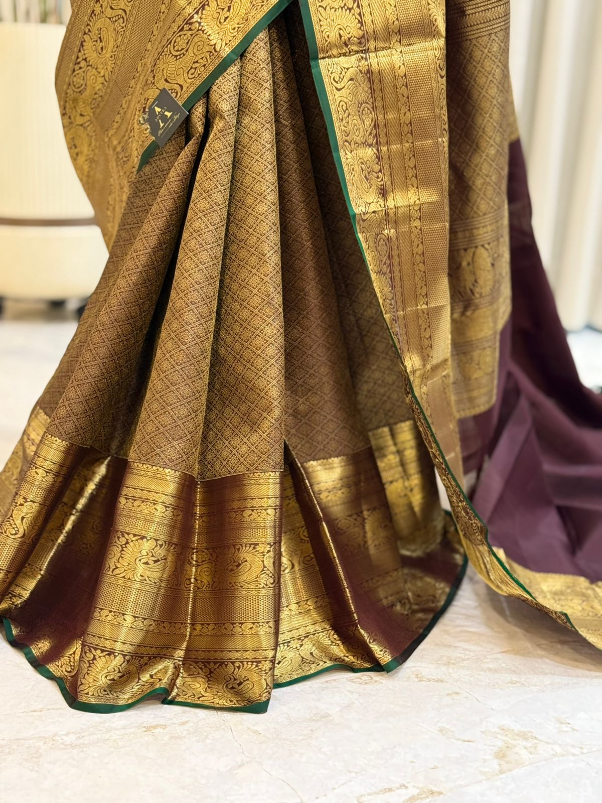This exquisite handwoven Kanjivaram saree drapes in a rich, antique brown/maroon shade shimmered with intricate gold zari work. The body features fine, close-knit motifs, contrasting beautifully with the wide, ornately detailed borders and pallu. A striking dark green piping/selvedge adds a final touch of traditional elegance, showcasing masterful South Indian craftsmanship.