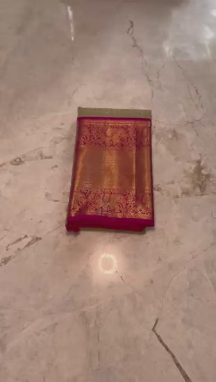 This Kanjivaram saree features a rich magenta pink and gold combination. The body is golden beige with intricate gold zari motifs arranged in horizontal lines. The magenta pink border and pallu showcase elaborate gold zari work with paisley and floral designs. Made from luxurious Kanjivaram silk, it includes a matching magenta pink blouse piece. Ideal for weddings and festive occasions, this saree exudes elegance and grandeur.