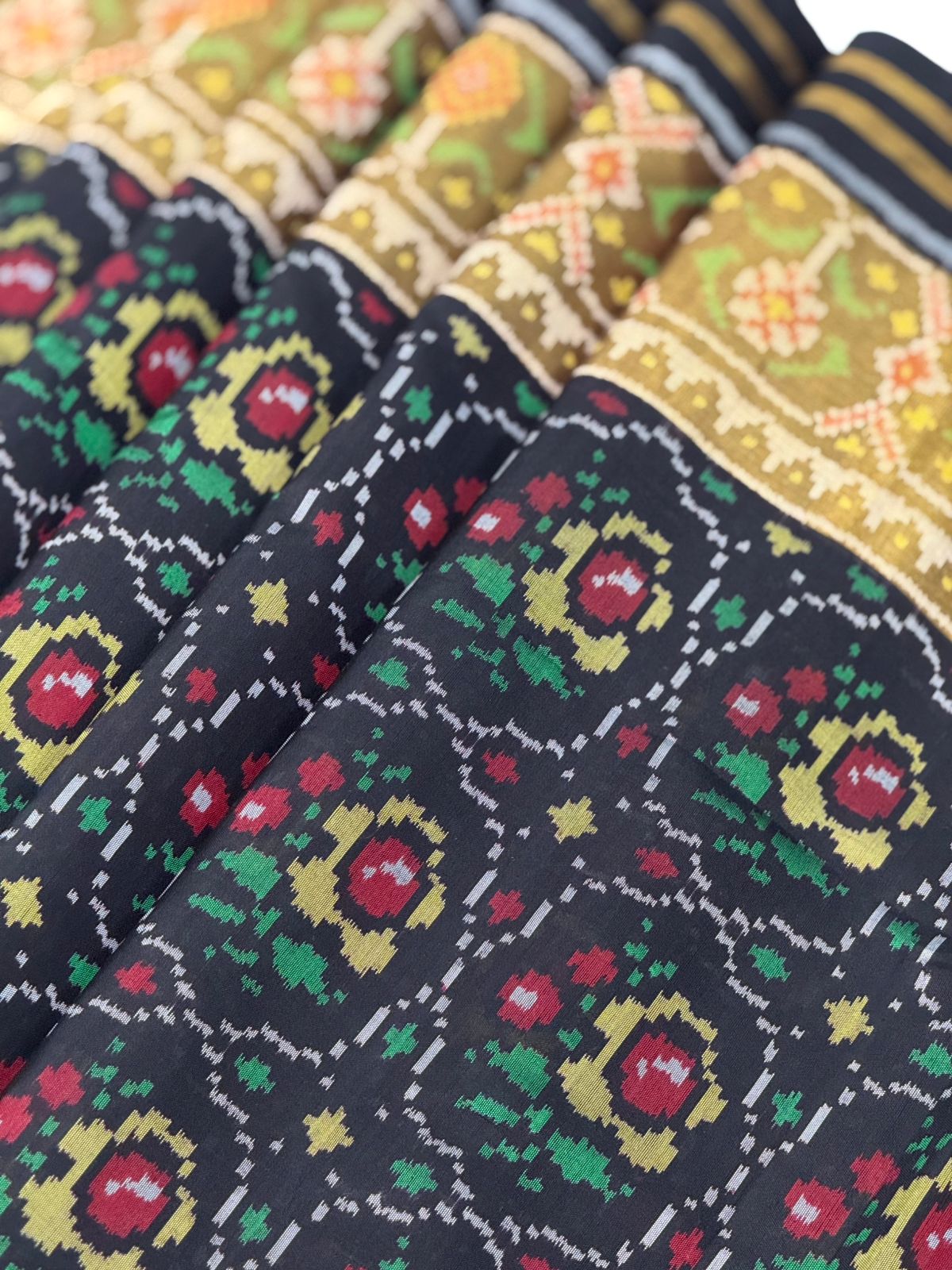 This exquisite single ikkat handwoven Mulberry silk Patola saree is a bold symphony of tradition and opulence. Set against a luxurious black base, vibrant floral patterns in red, green, and yellow bloom with timeless charm. The golden zari borders and pallu add a radiant touch of regality, while intricate ikkat detailing showcases masterful craftsmanship. A celebration of vibrant heritage and elegance, this saree is a stunning blend of artistry and cultural richness.