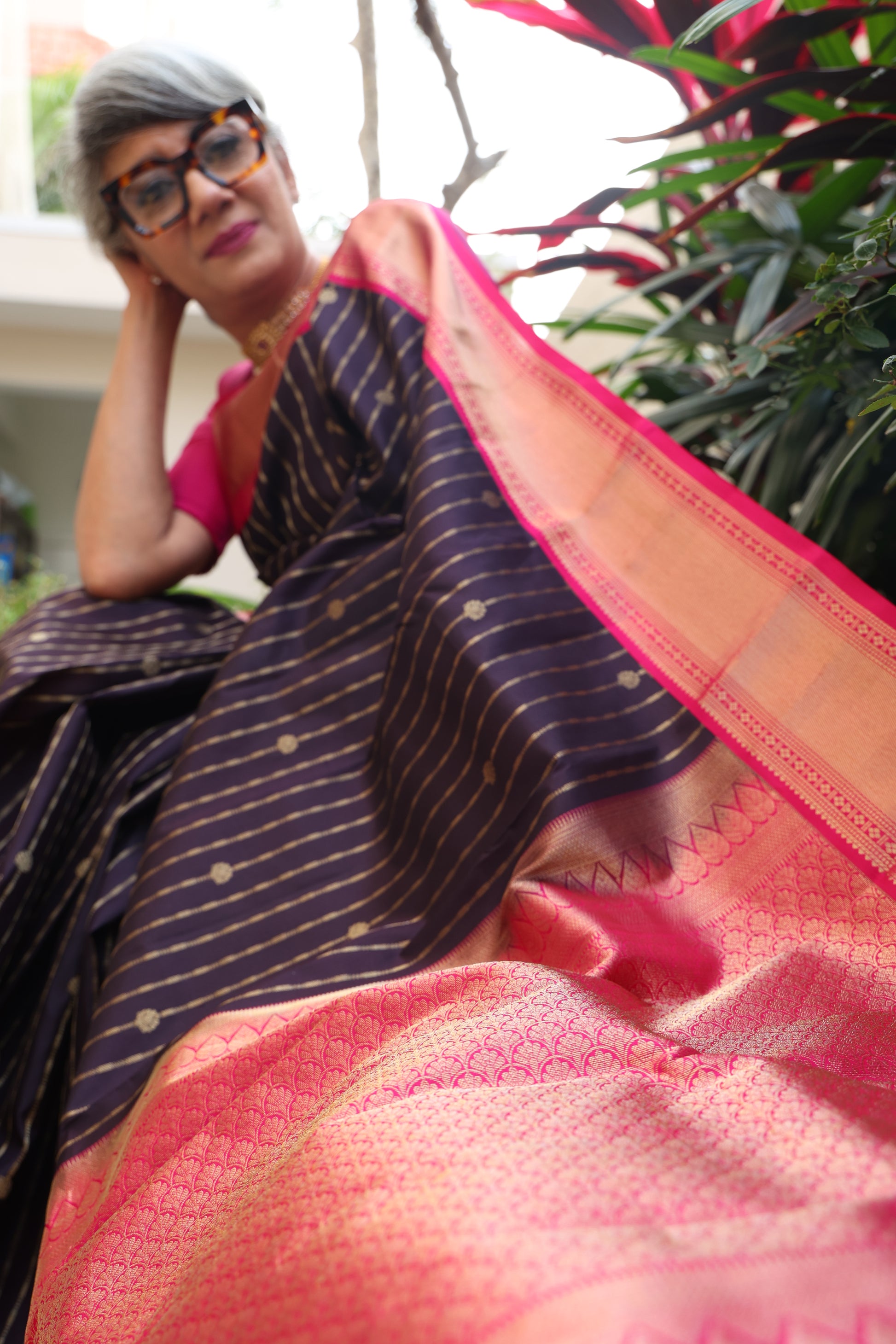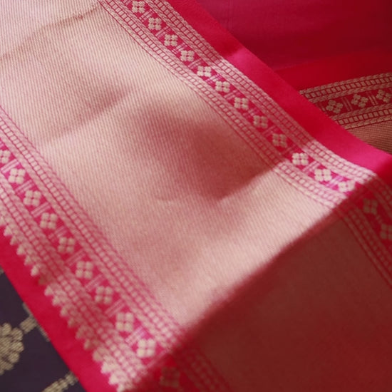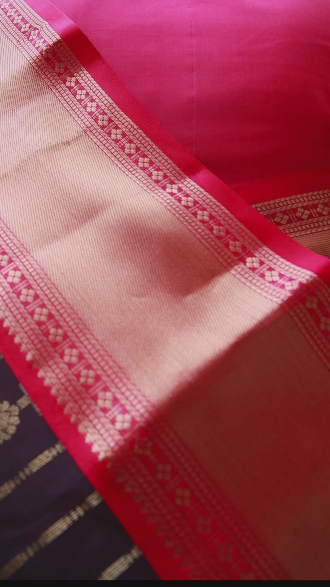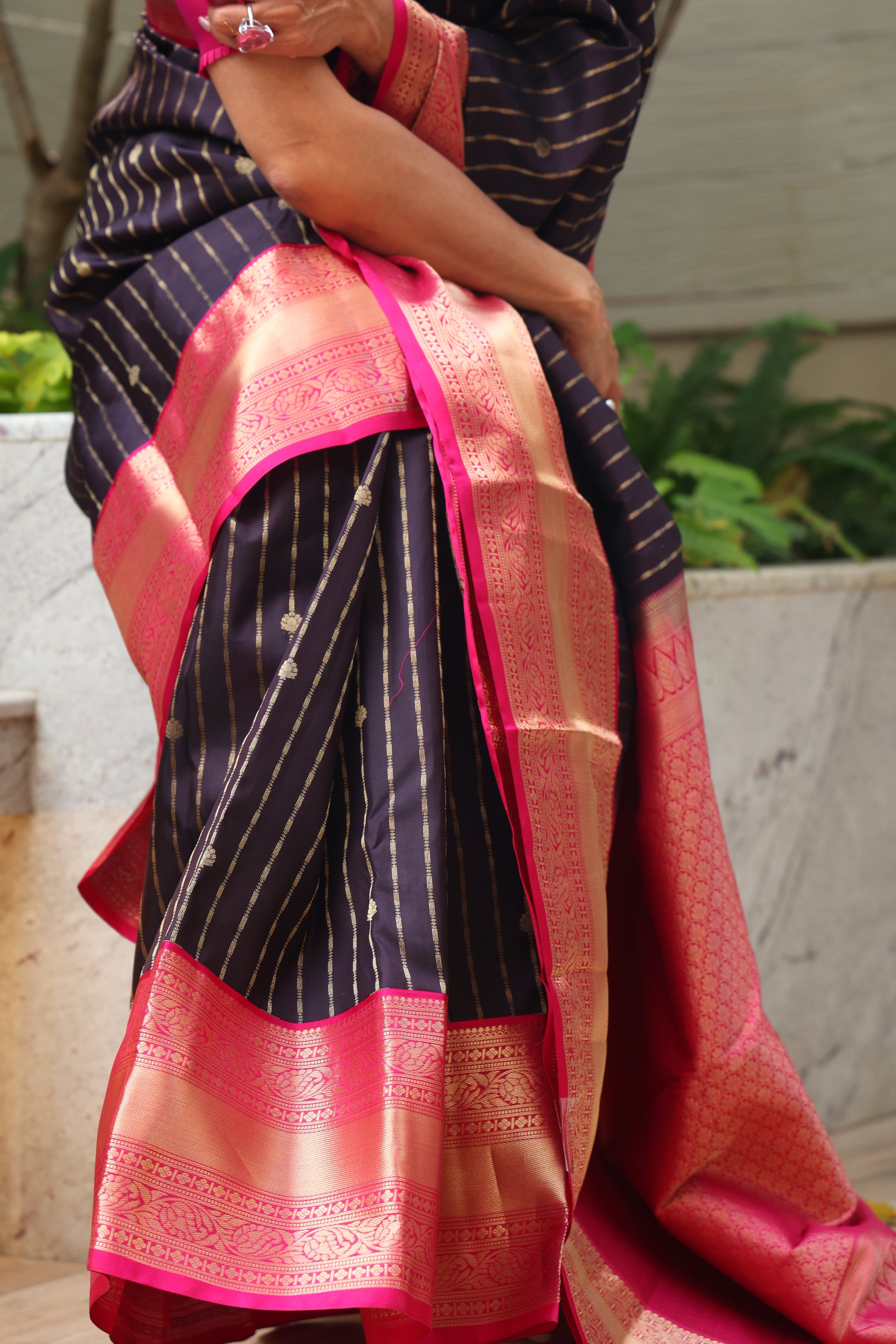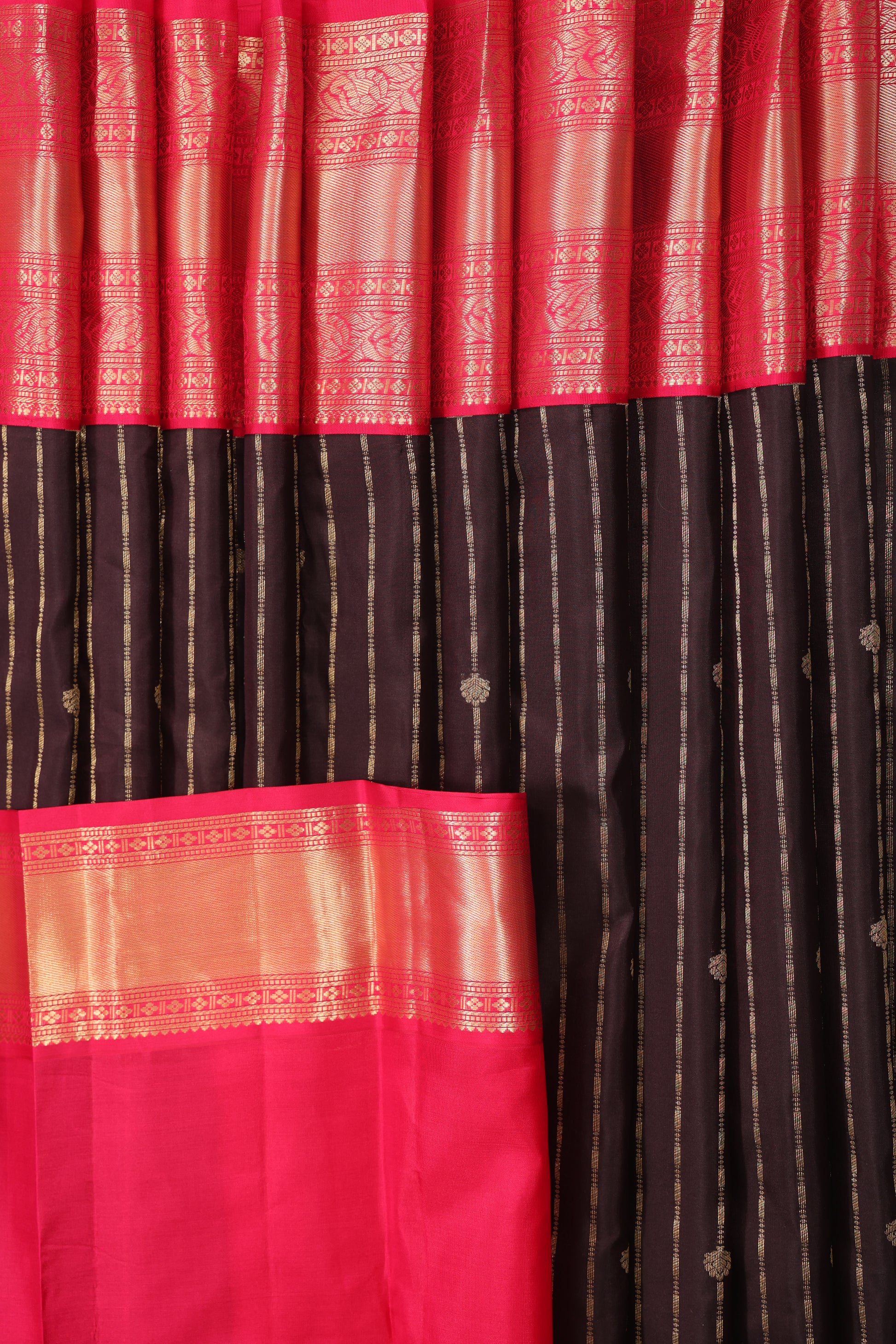This Kanjivaram silk saree features a deep midnight black body with gold zari vertical stripes and small motifs. It is elegantly contrasted with a vibrant pink border and pallu, adorned with intricate gold zari floral and paisley designs. The saree pairs beautifully with a matching pink blouse, making it a regal choice for weddings, festivals, and grand occasions.