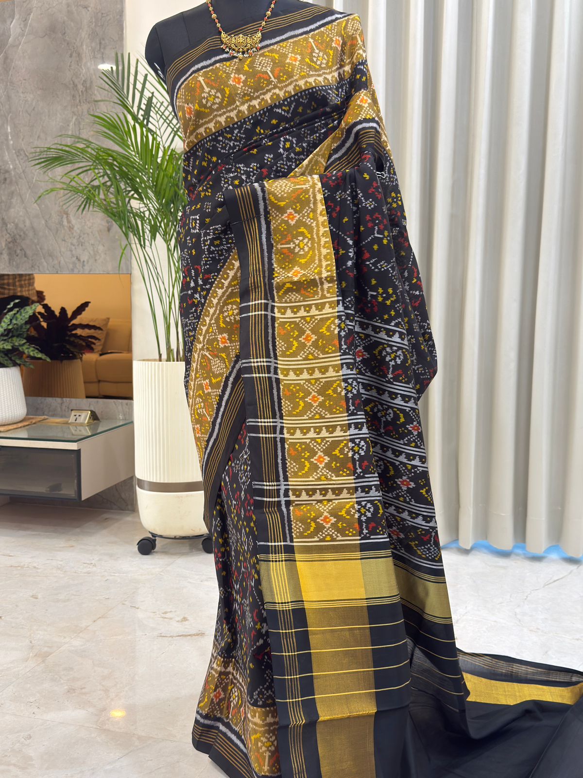 This exquisite handwoven mulberry silk single ikat Patola saree features a striking black base adorned with intricate geometric and floral ikat motifs in white, red, and yellow. The design flows gracefully into a bold yellow border enhanced with fine black stripes, adding a radiant contrast. Soft, lustrous, and meticulously crafted, this saree beautifully blends tradition with elegance, making it a timeless statement piece for any special occasion.