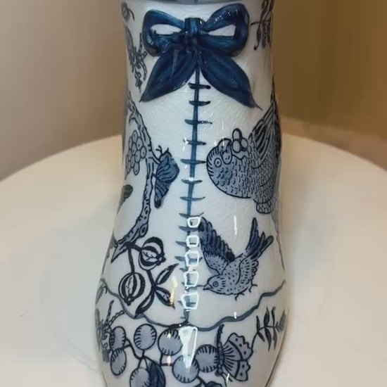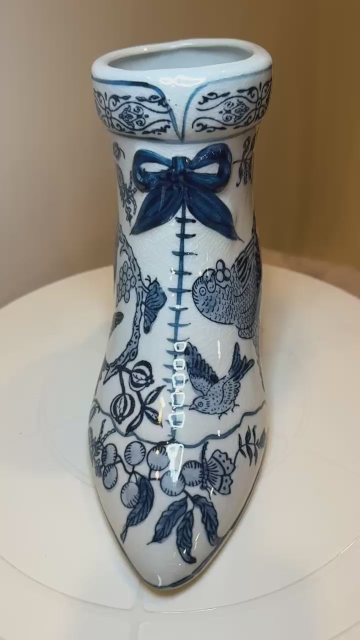 This is an elegant ceramic decorative boot featuring intricate blue and white design, reminiscent of Delftware or Chinese porcelain. They have floral and bird motifs, a glossy finish, and a bow detail, mimicking historical high-heeled footwear. Likely used as vases or ornamental pieces, they add a vintage, sophisticated touch to home decor.