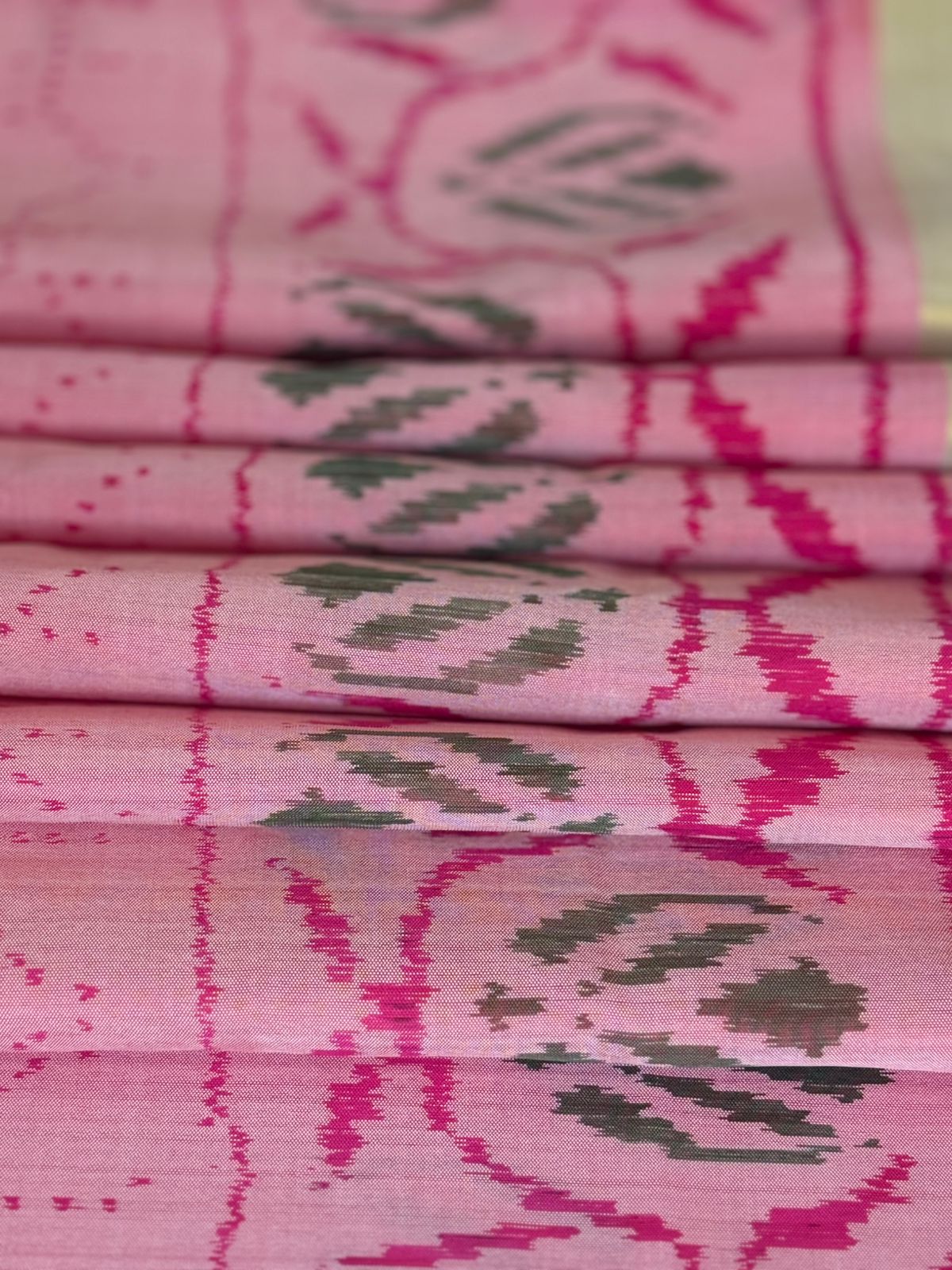 This elegant single Ikkat Patola saree in handwoven mulberry silk is a soft symphony in pink. Delicate floral and leaf motifs in charcoal grey and magenta are woven into a serene blush pink base, accented with subtle ikat detailing throughout. Finished with a gold-tinted border and sleek magenta lines, this saree embodies quiet sophistication. Graceful, lightweight, and luminous, it’s a perfect pick for daytime festivities, cultural gatherings, or refined celebrations.