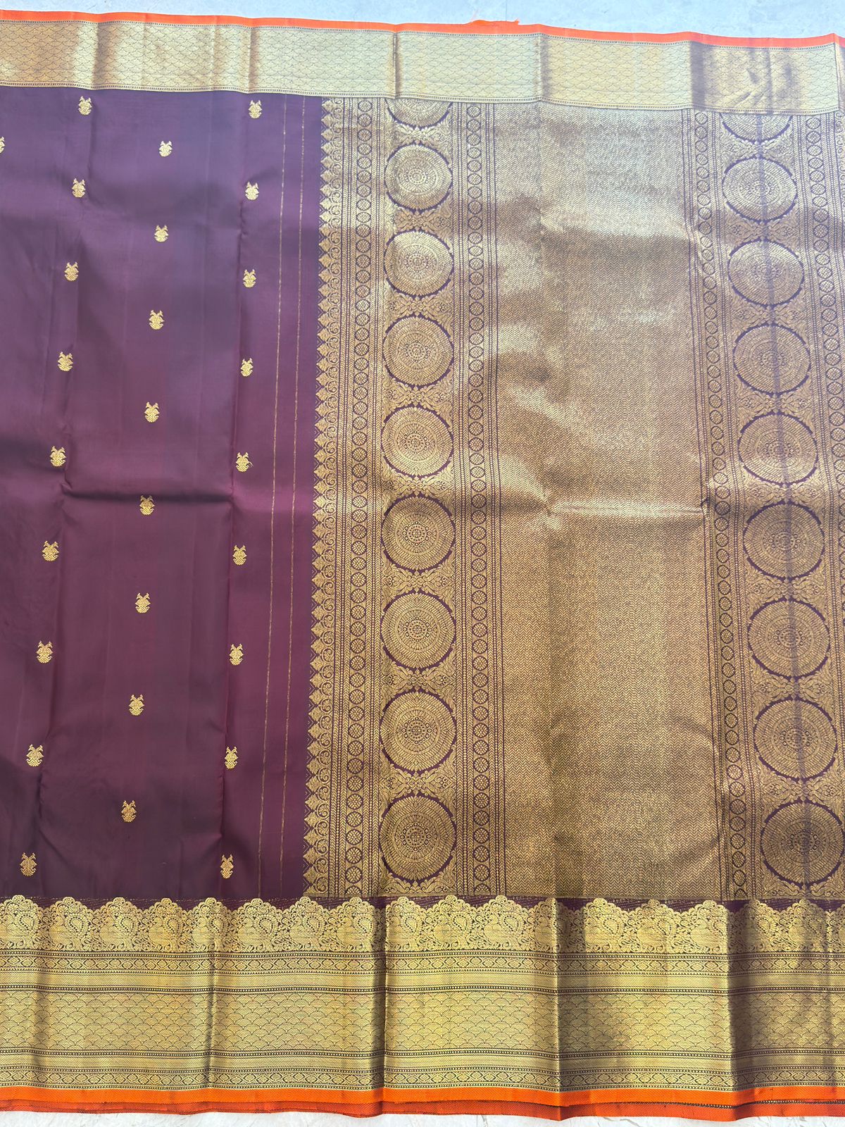 This handwoven chocolate-brown Kanjivaram saree exudes regal elegance, featuring a rich body adorned with delicate golden buttas. Its opulent zari border and pallu showcase intricate traditional motifs woven in shimmering gold, adding depth and grandeur. The subtle orange piping enhances its sophistication, while the luxurious silk drape elevates its timeless charm. Perfect for grand celebrations, this saree beautifully blends heritage craftsmanship with a striking, graceful aesthetic.