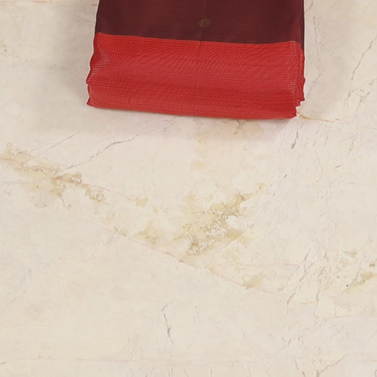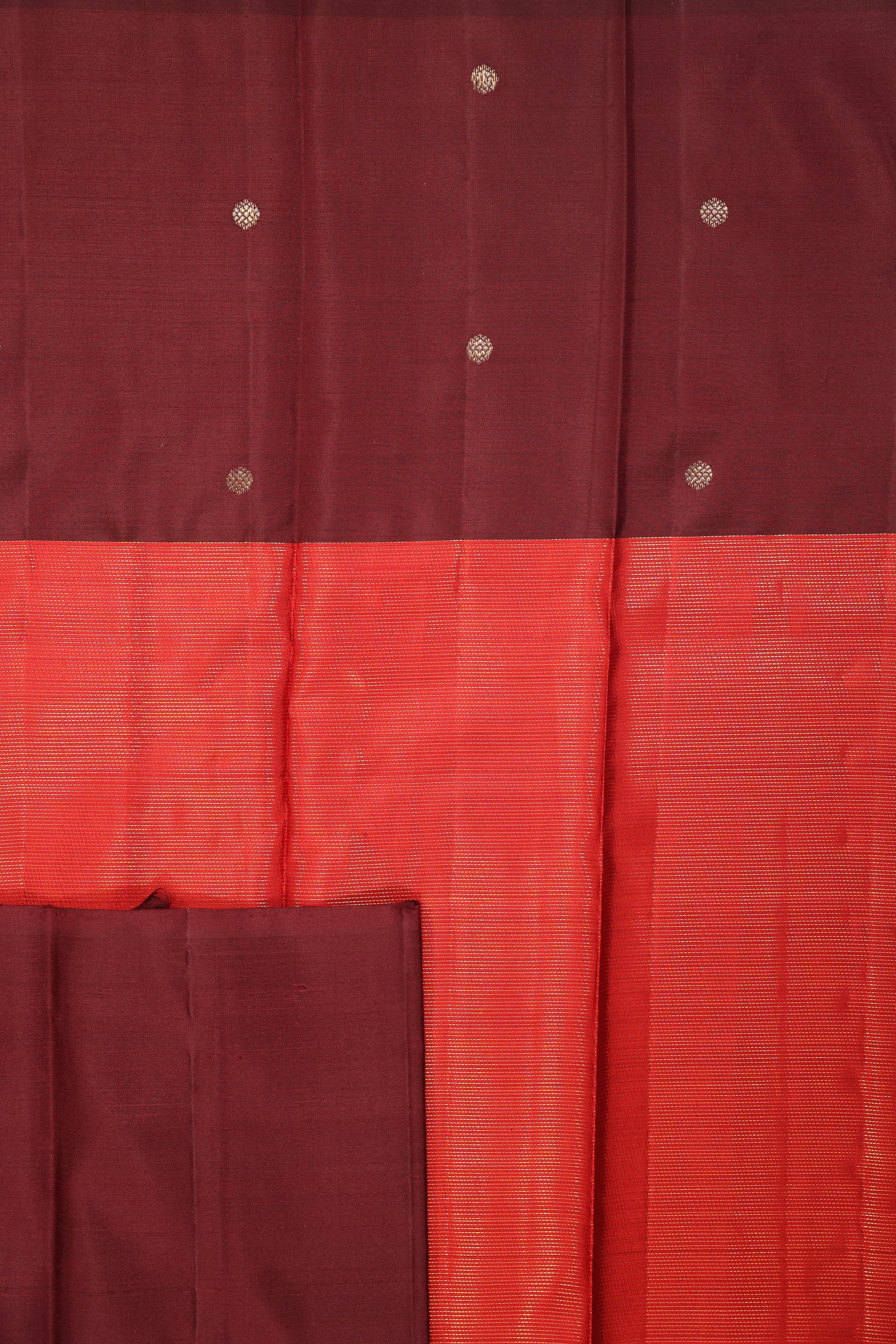 This Kanjivaram saree features a richburnt red/ rust and maroon color combination. The body is adorned with small gold buttas (motifs) on the maroon section, while the borders showcase intricate gold zari work with motifs of elephants and floral patterns. The pallu is elaborately designed with continuous zari work featuring elephants and floral motifs. Made from high-quality silk, this saree is perfect for weddings, festivals, and grand occasions.