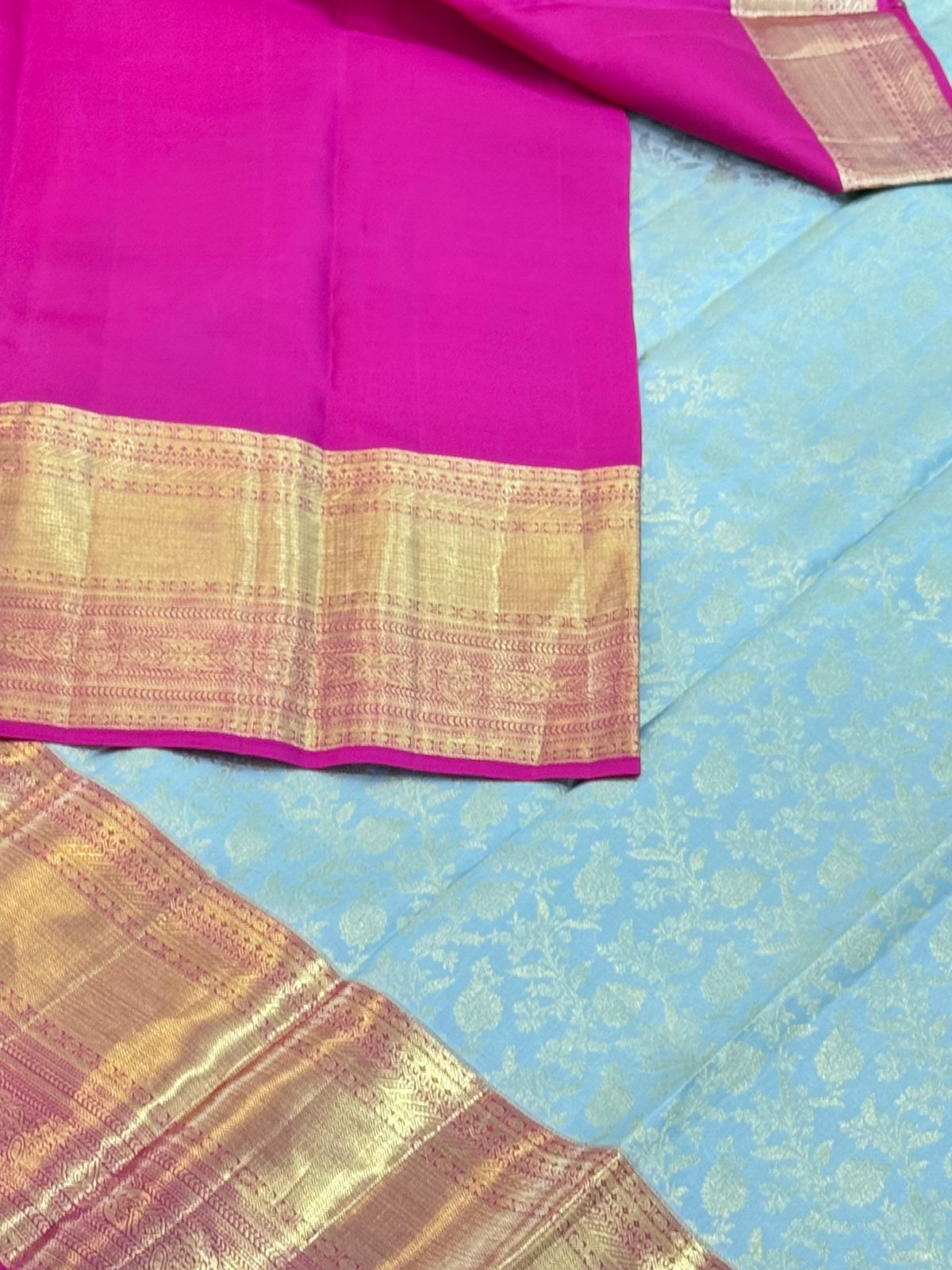 This ash blue Kanjivaram silk saree is a vision of sophistication and grandeur. The body is adorned with delicate golden floral motifs that exude timeless elegance, while the contrasting hot pink border and pallu are richly woven with intricate zari patterns, adding vibrancy and opulence. The luxurious silk fabric flows gracefully, making it a perfect ensemble for weddings and festivities, capturing the charm of heritage craftsmanship and modern allure in a seamless blend.