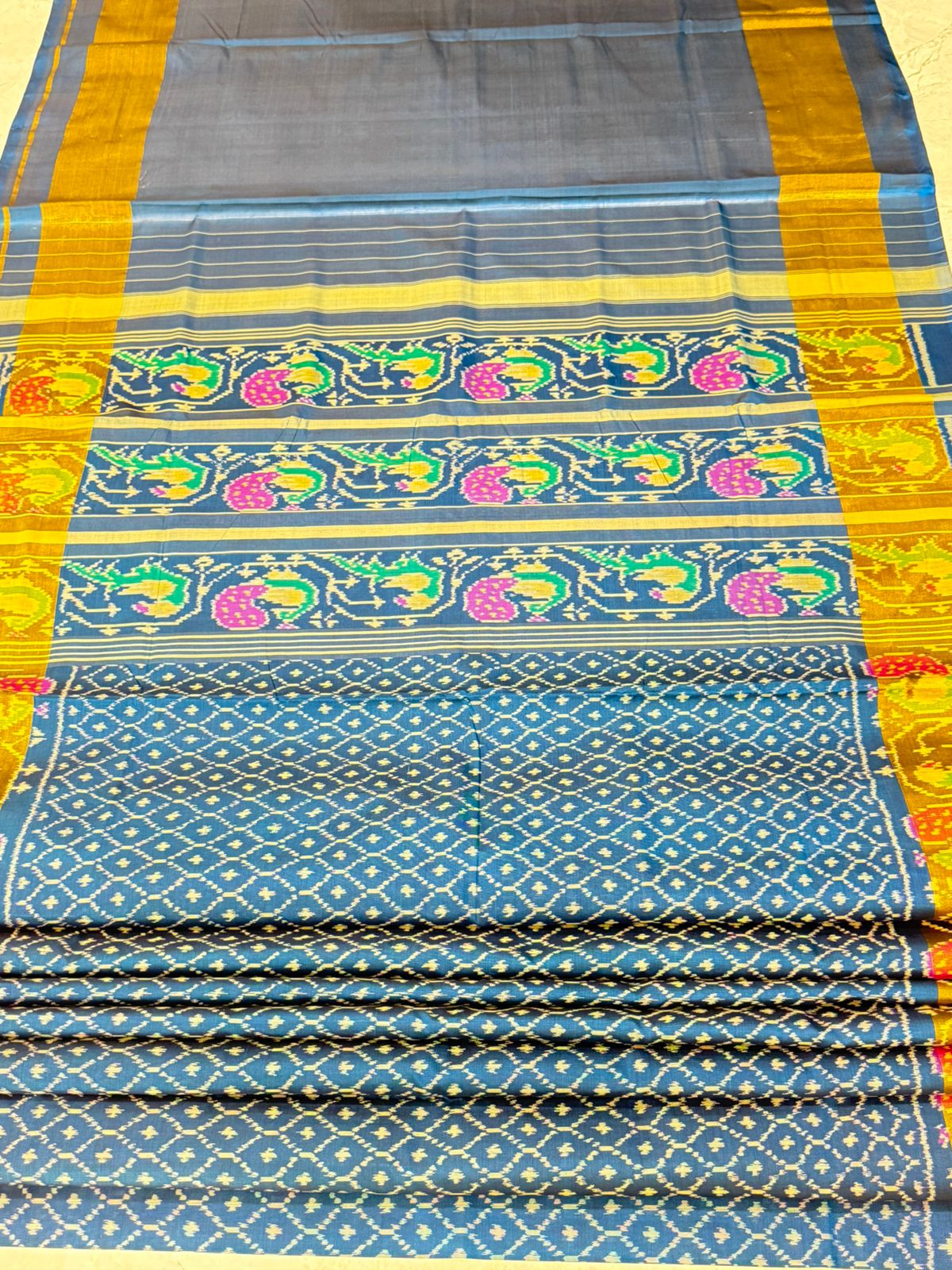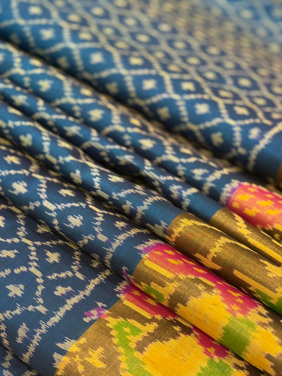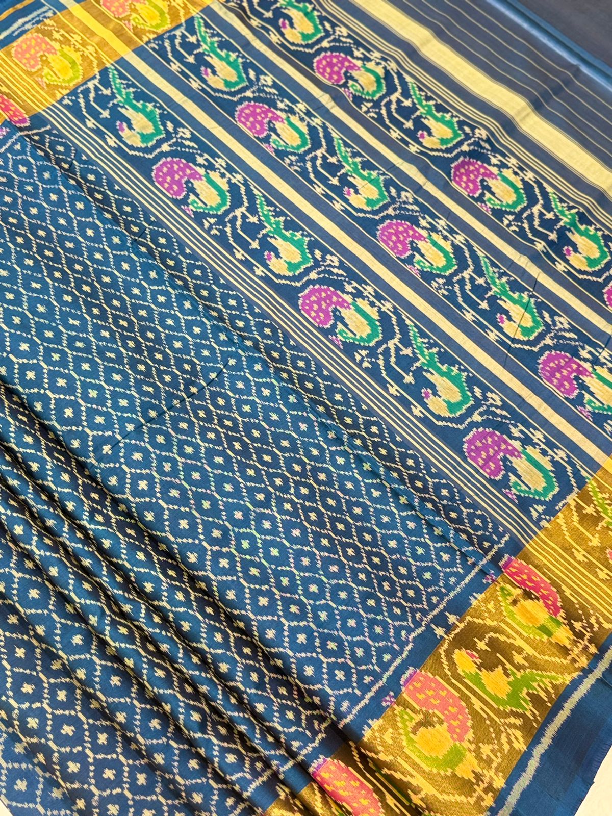 Drape yourself in elegance with this exquisite cobalt blue single ikkat handwoven mulberry silk Patola saree. The intricate diamond-shaped motifs on the body exude timeless charm, while the vibrant peacock-inspired patterns along the pallu burst in hues of pink, green, and yellow. Enhanced by golden zari borders, this masterpiece blends traditional craftsmanship with regal sophistication—perfect for occasions where grace and grandeur walk hand in hand.