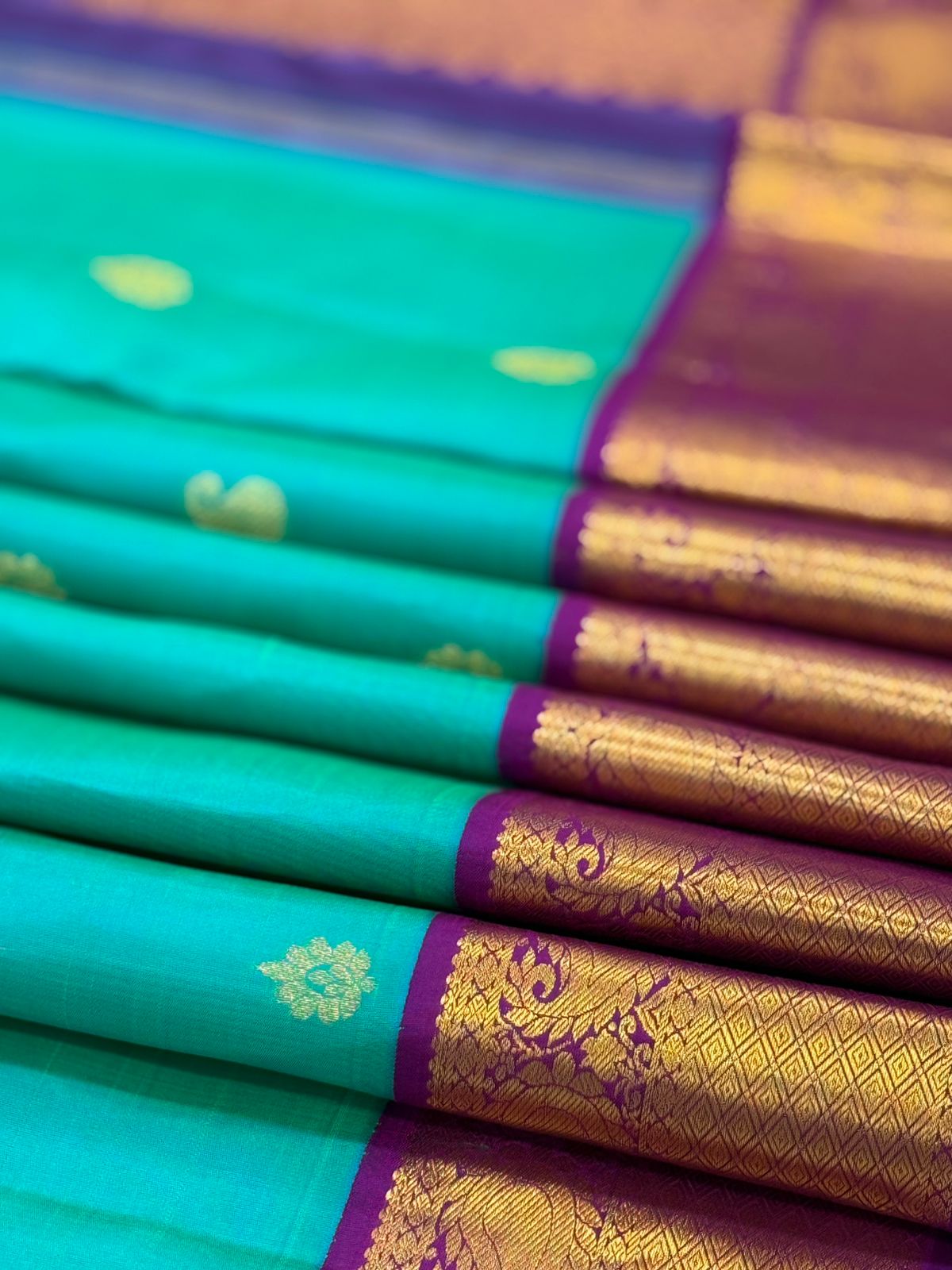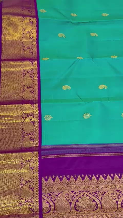 This exquisite handwoven Kanjivaram saree is a celebration of tradition and opulence. Its vibrant teal body is adorned with delicate gold motifs, while the rich purple border dazzles with intricate zari work depicting peacocks and floral vines. The grand pallu gleams in golden brocade, enhancing its regal charm. A perfect blend of heritage and elegance, this saree is ideal for weddings and festive occasions, making every moment truly timeless.