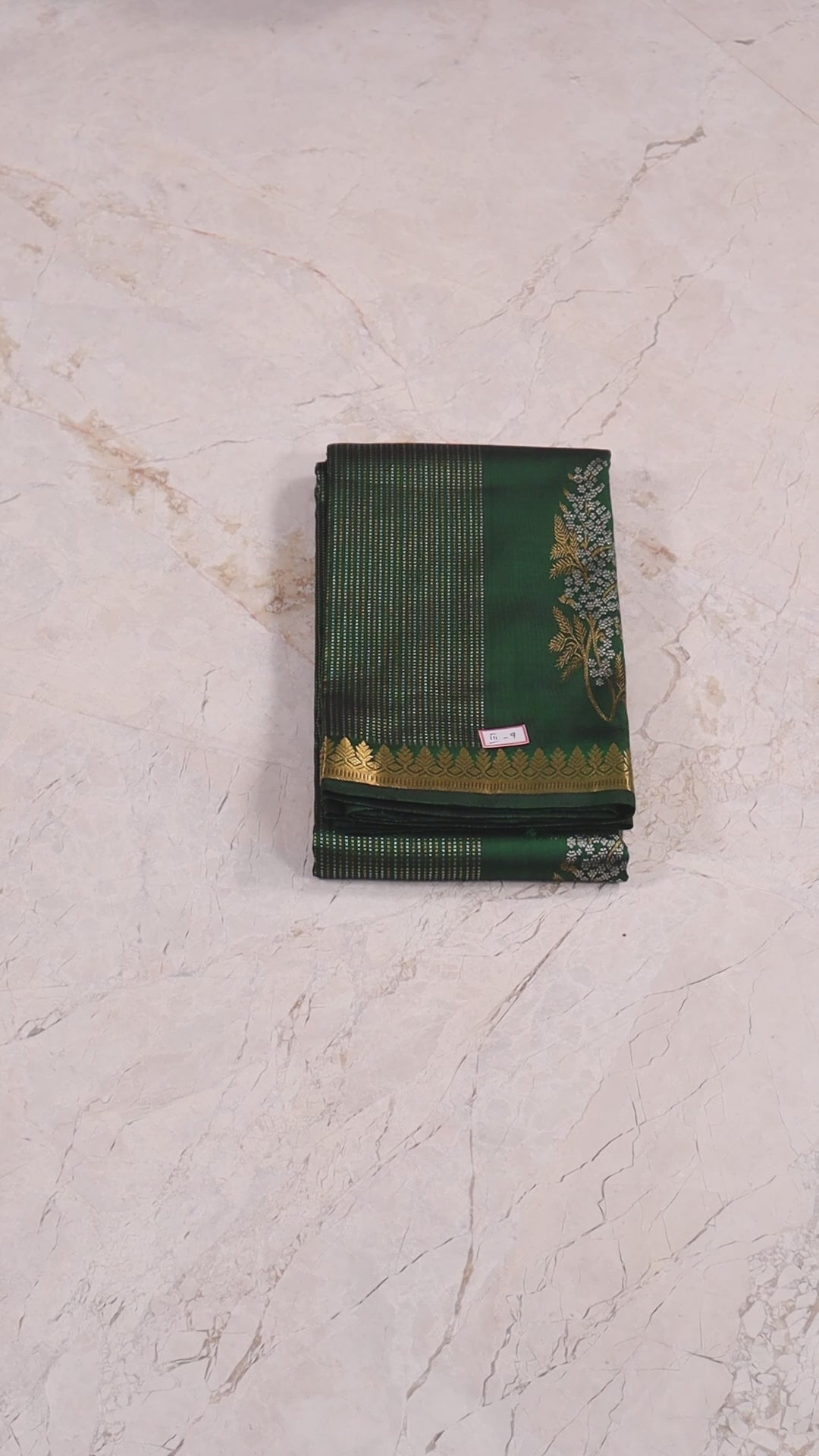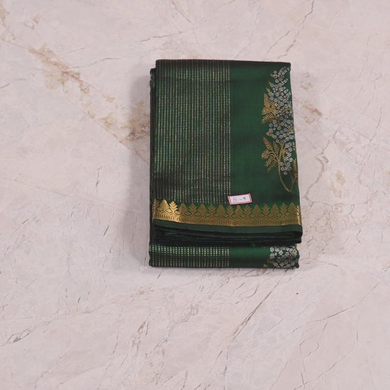 This Kanjivaram saree is a luxurious deep green silk saree with intricate golden zari work. It features fine golden dotted lines, floral motifs made of gold and silver zari, and a richly woven border with traditional geometric and floral patterns. The pallu is heavily decorated with diamond-shaped geometric designs. Crafted using the double warp and double weft technique, this saree is ideal for weddings, festive occasions, and grand celebrations. Its rich texture and sophisticated design make it a timeless piece.