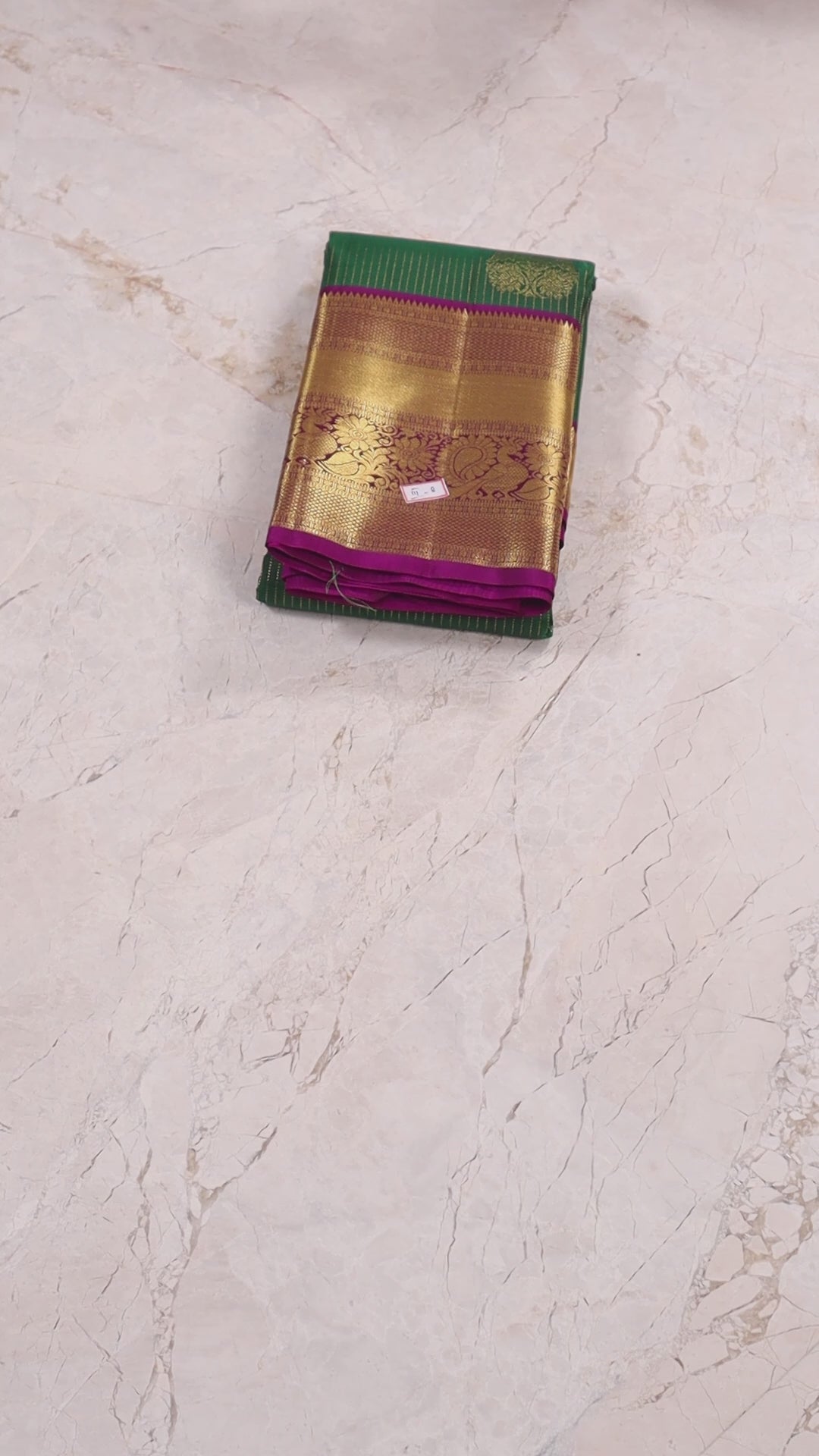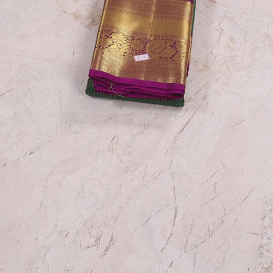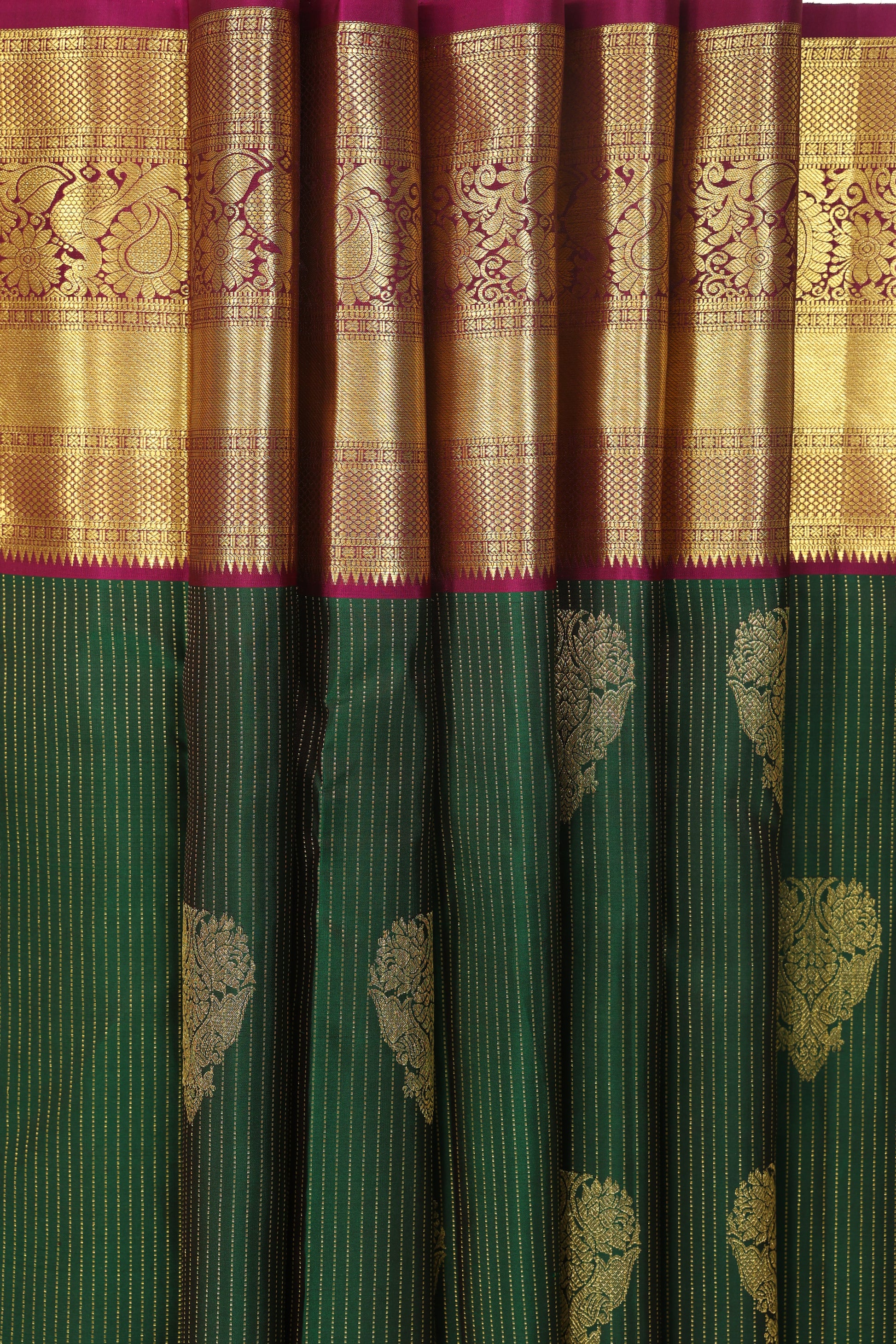 The Silk Kanjivaram Saree is a luxurious, pure silk saree featuring a deep green body adorned with golden zari dotted lines and elegant buttas (motifs). Its contrasting magenta and gold borders are intricately woven with traditional floral, paisley, and geometric patterns. The pallu showcases rich gold zari work with detailed motifs, exuding a grand, opulent appearance. This saree is perfect for weddings, festivals, and traditional ceremonies due to its exquisite craftsmanship and luxurious appeal.