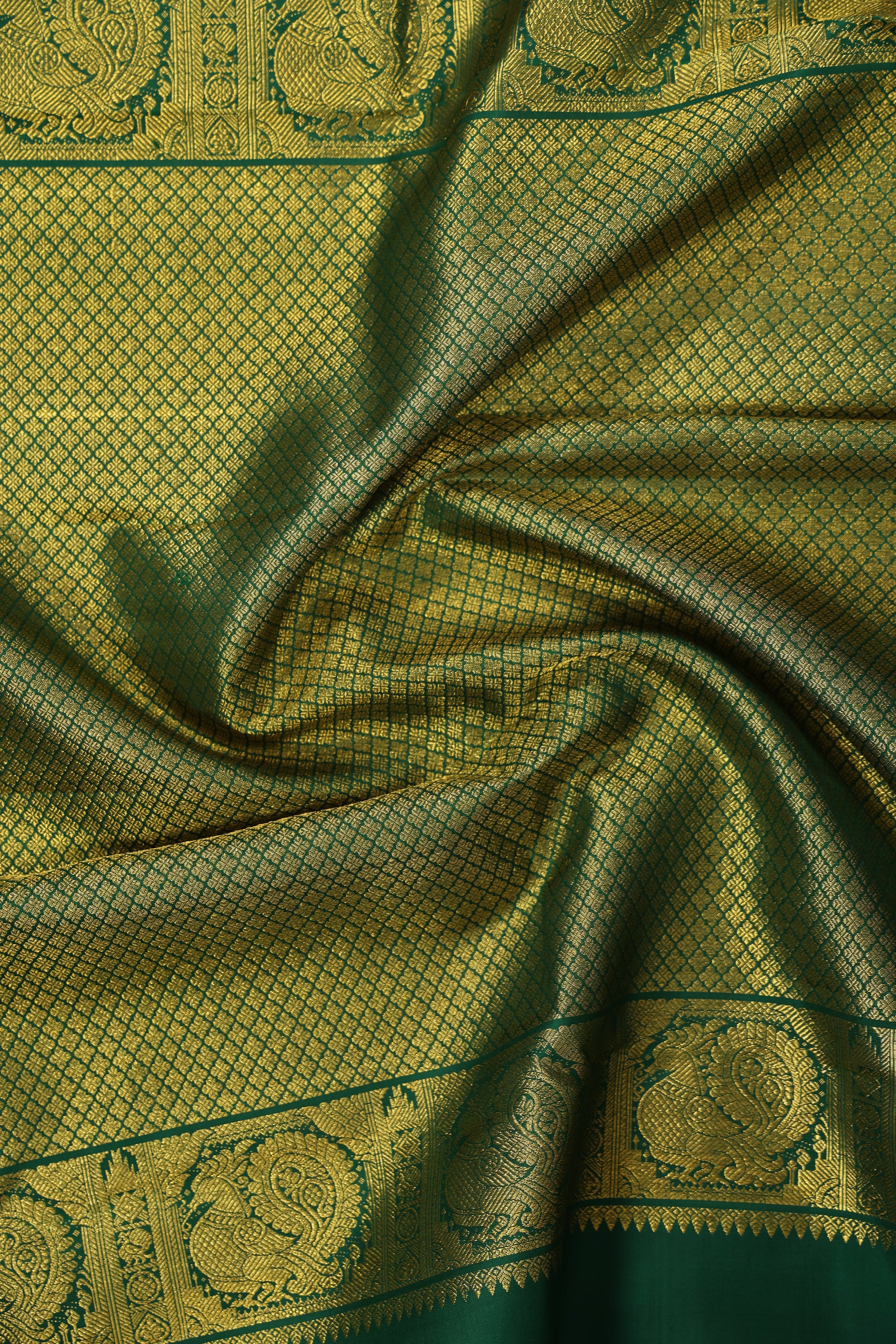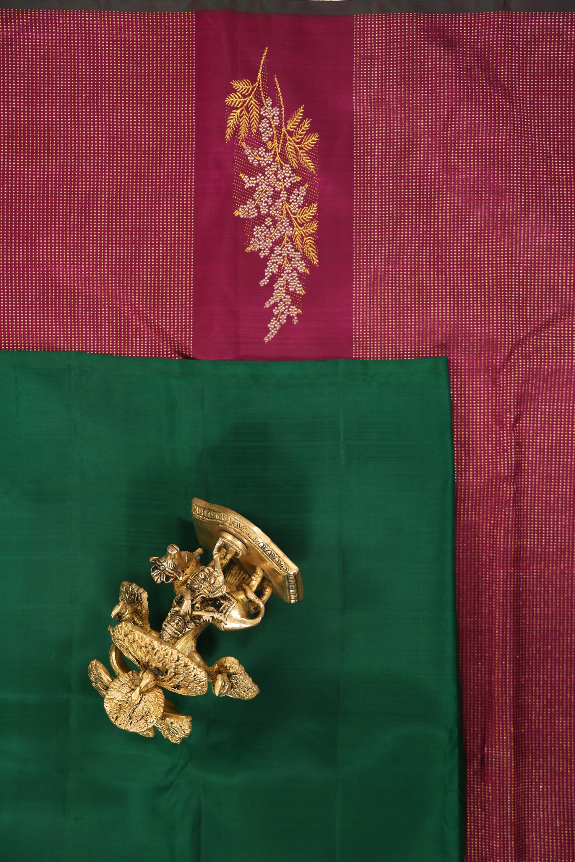 This is a luxurious Silk Kanjivaram Handloom Saree with a deep maroon body and dark green border. It features intricate golden zari floral motifs resembling flowering branches with leaves, and fine golden dots across the body. The pallu is decorated with geometric and peacock-themed golden zari work, showcasing fine craftsmanship. This elegant saree is ideal for festivals, weddings, and grand occasions.