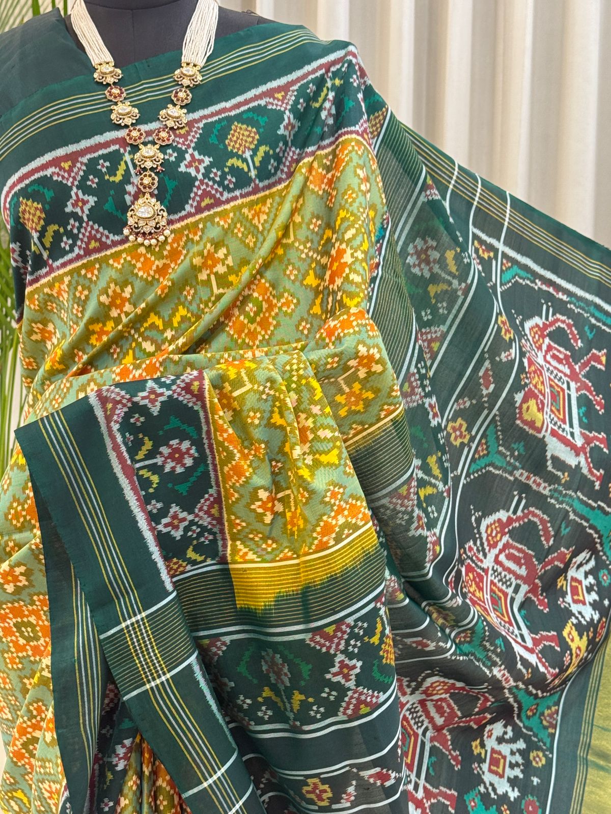 This handwoven mulberry silk single-ikat Patola saree exudes regal charm with its deep green base beautifully enriched by intricate ikat motifs in yellow, red, and white. The highlight is its exquisite pallu adorned with traditional elephant patterns, adding a touch of cultural grandeur. Soft, lustrous, and gracefully fluid, it drapes elegantly, celebrating the finesse of timeless craftsmanship. A perfect blend of heritage and luxury, ideal for festive and special occasions.