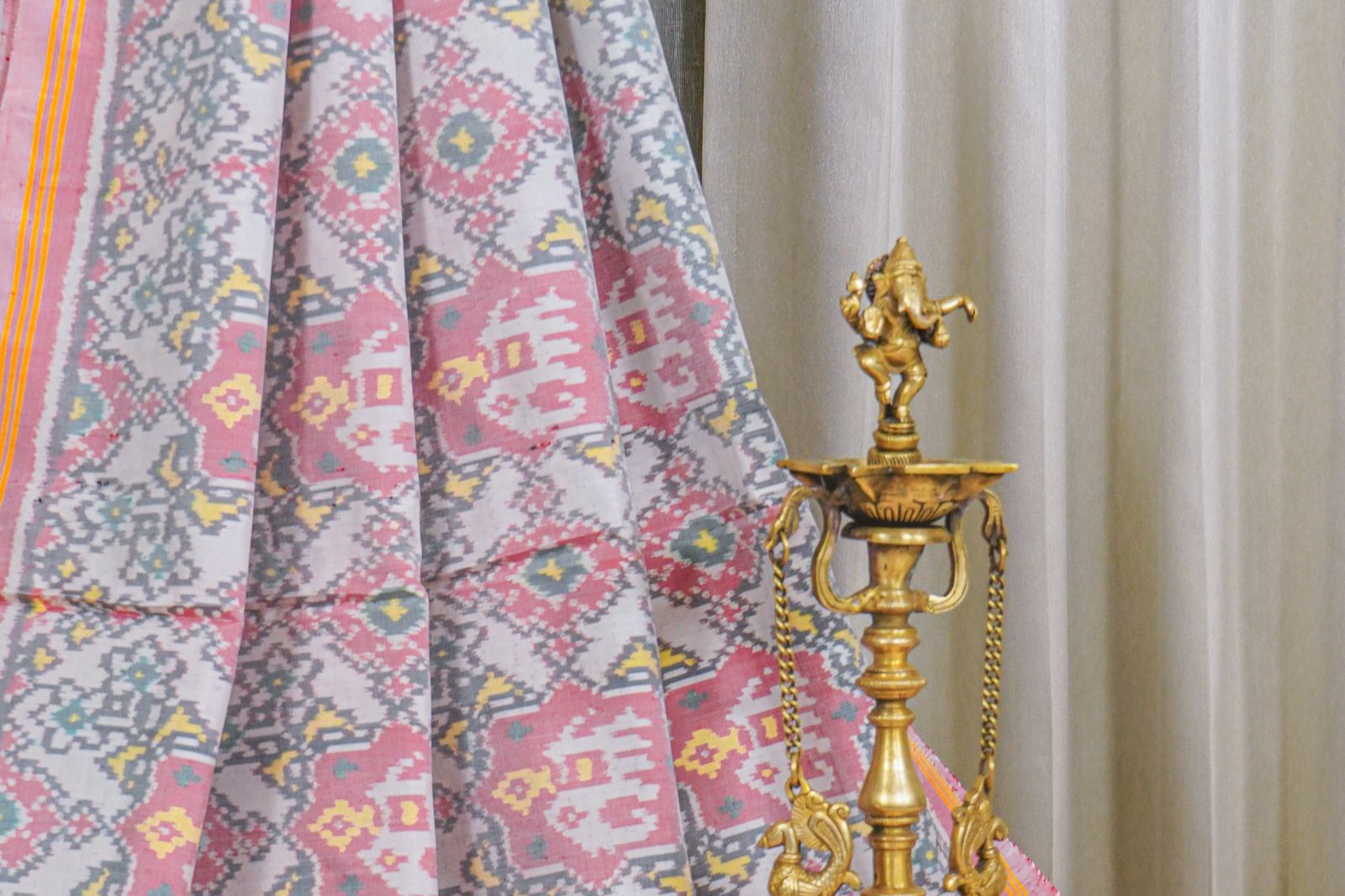 This exquisite handwoven Patan Patola silk saree is a true masterpiece of double ikat artistry. Its soft pastel base is adorned with intricate geometric and floral motifs in muted pink, yellow, green, and grey tones, exuding elegance and heritage charm. The vibrant striped border adds a subtle pop of color. A timeless heirloom, this saree beautifully reflects the meticulous craftsmanship and regal legacy of Patan’s rich weaving tradition.