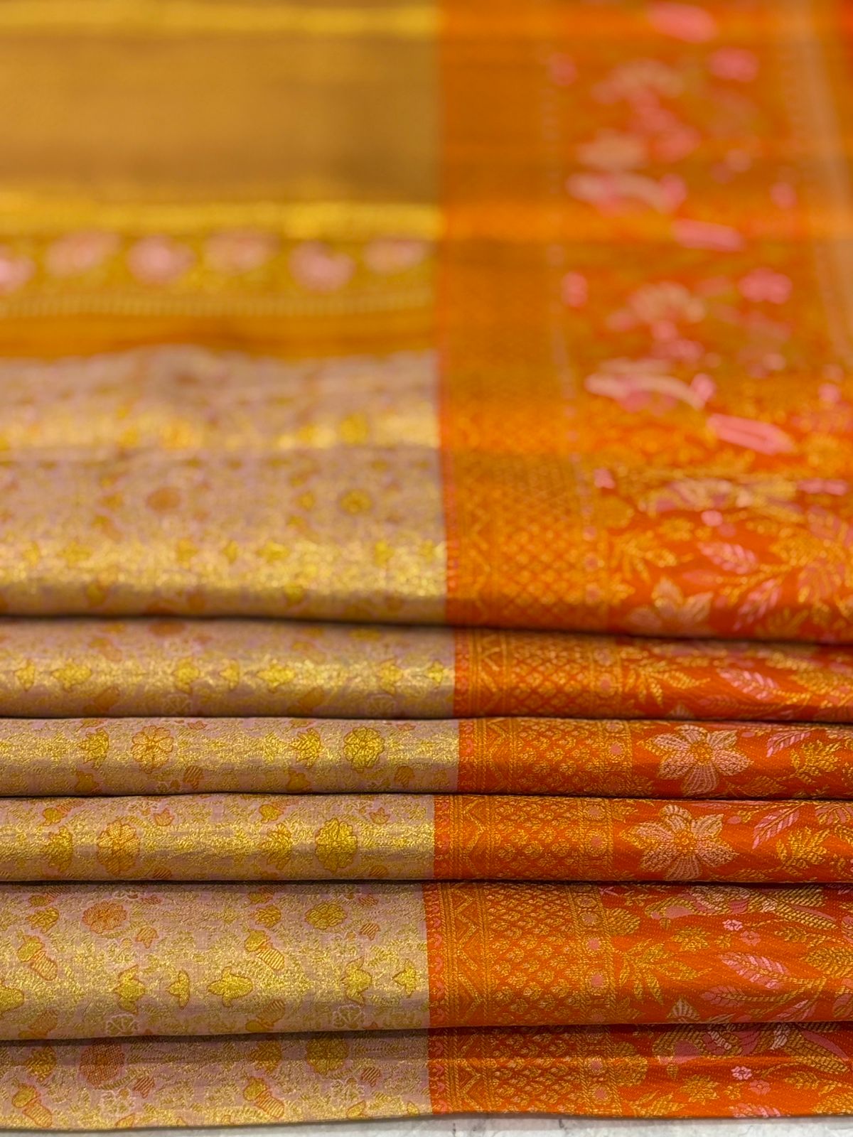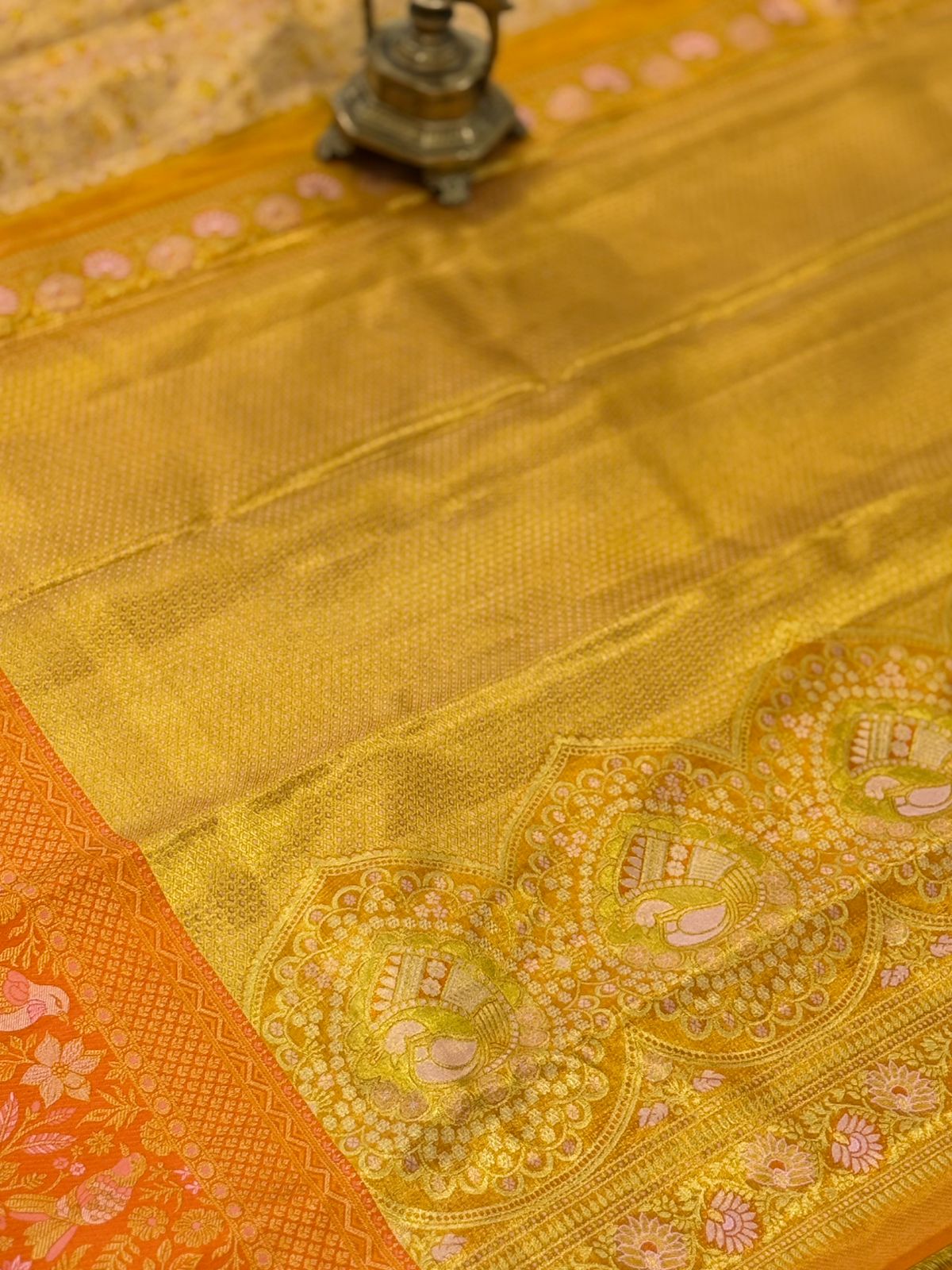 This exquisite handwoven Kanjivaram saree radiates opulence in fanta orange and gold. The full zari weave glimmers with intricate floral and bird motifs, blending traditional artistry with regal charm. The resplendent gold pallu, adorned with delicate patterns, harmonizes beautifully with the vibrant orange borders, rich in fine detailing. Perfect for grand occasions, this masterpiece embodies timeless elegance, craftsmanship, and a celebration of South Indian heritage in every thread.