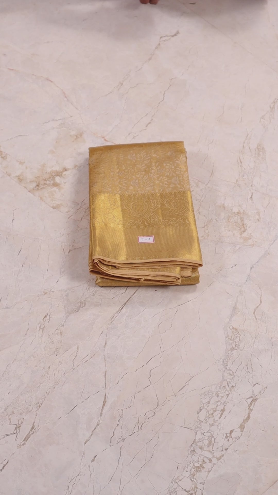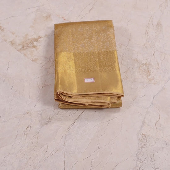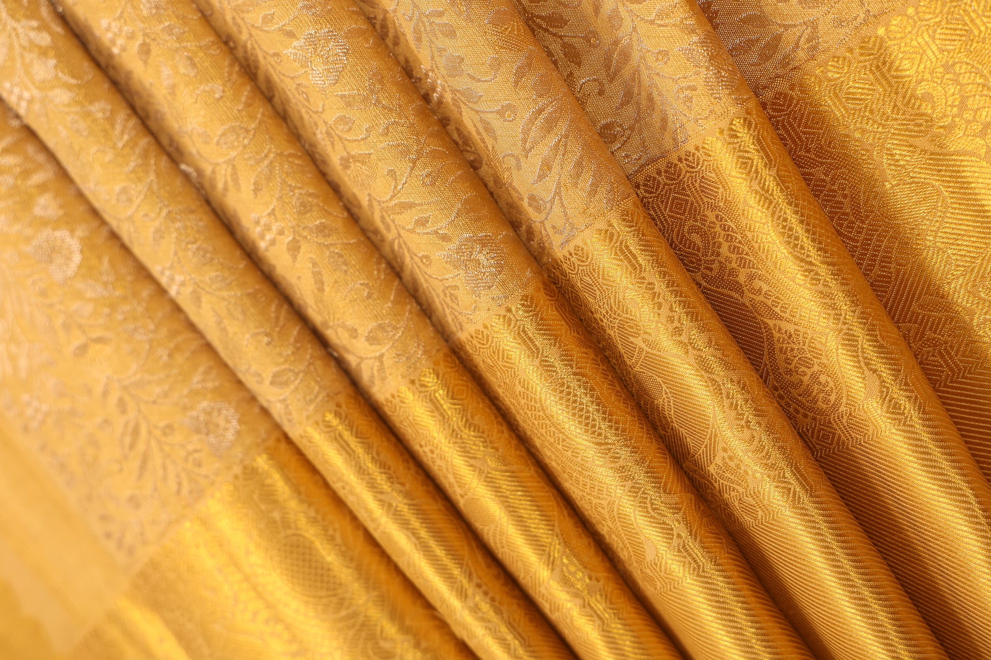 This is a luxurious golden yellow Kanjivaram silk saree featuring intricate silver and golden zari floral and leaf motifs throughout. The saree has a smooth, shiny finish with a rich texture, showcasing traditional Kanjivaram weaving. The pallu and border are adorned with elaborate paisley, floral, and geometric patterns, making it ideal for weddings, festivals, and grand occasions.
