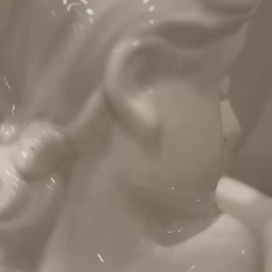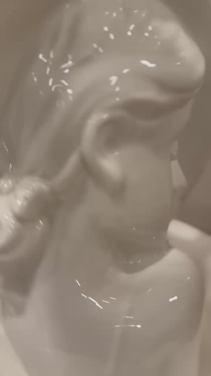 Girl Vase- The decor item is a glossy ceramic vase with a porcelain bust of a woman wearing a large, elegantly curved hat. It features delicate facial details, wavy hair with a bow and a serene expression. The piece is signed, suggesting an artist or brand. Its classic and sophisticated design makes it ideal for vintage or minimalistic interiors.