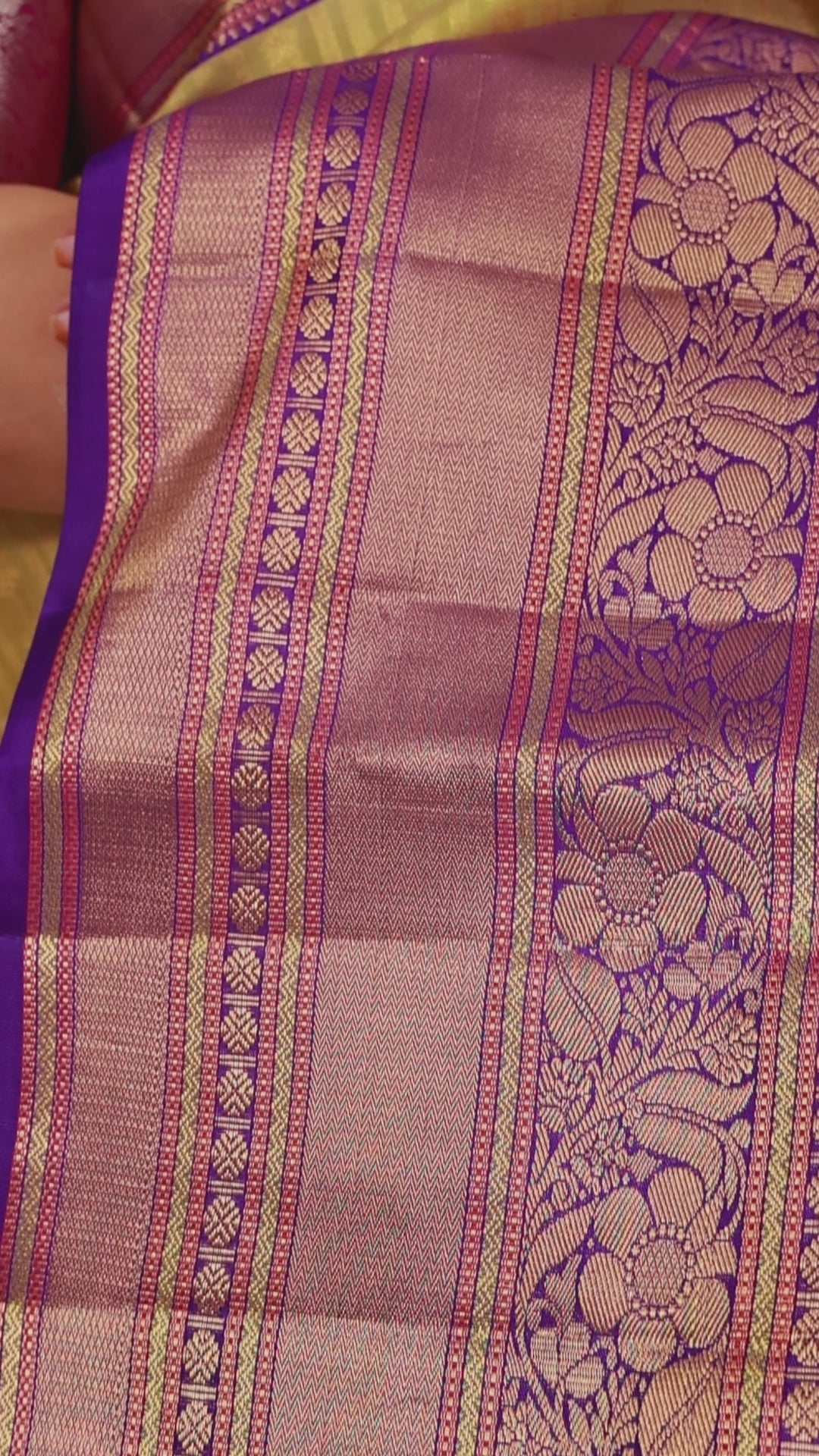 The Handloom Kanjivaram Saree features a rich golden-yellow body with intricate zari-woven vertical stripes and floral motifs. It has a luxurious purple border adorned with golden zari floral and geometric patterns, extending into a beautifully designed pallu. The fabric is pure silk with a glossy, smooth texture, reflecting traditional craftsmanship from Kanchipuram, Tamil Nadu. The saree's elegant colour combination and intricate detailing make it perfect for festive occasions, weddings, and formal events.