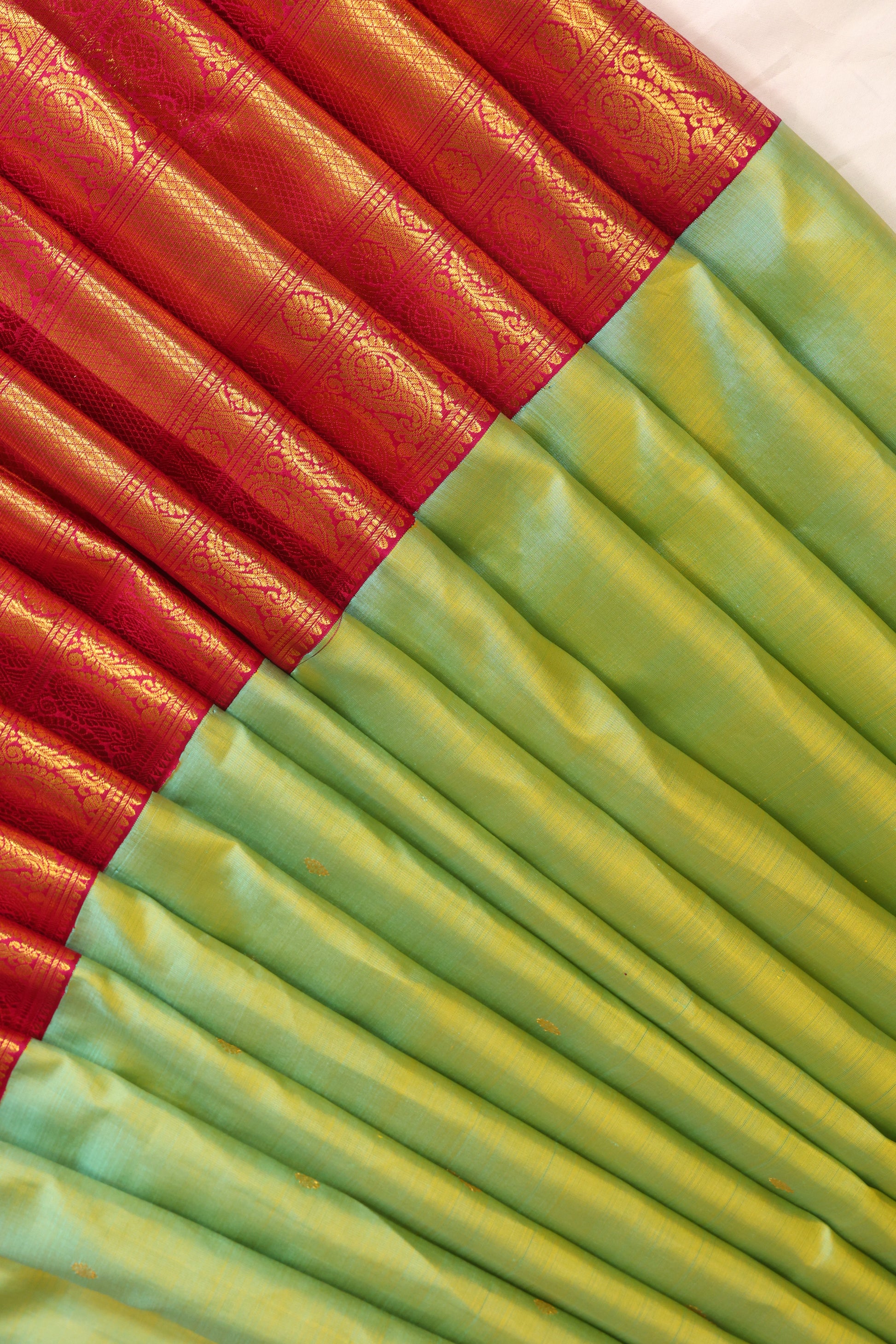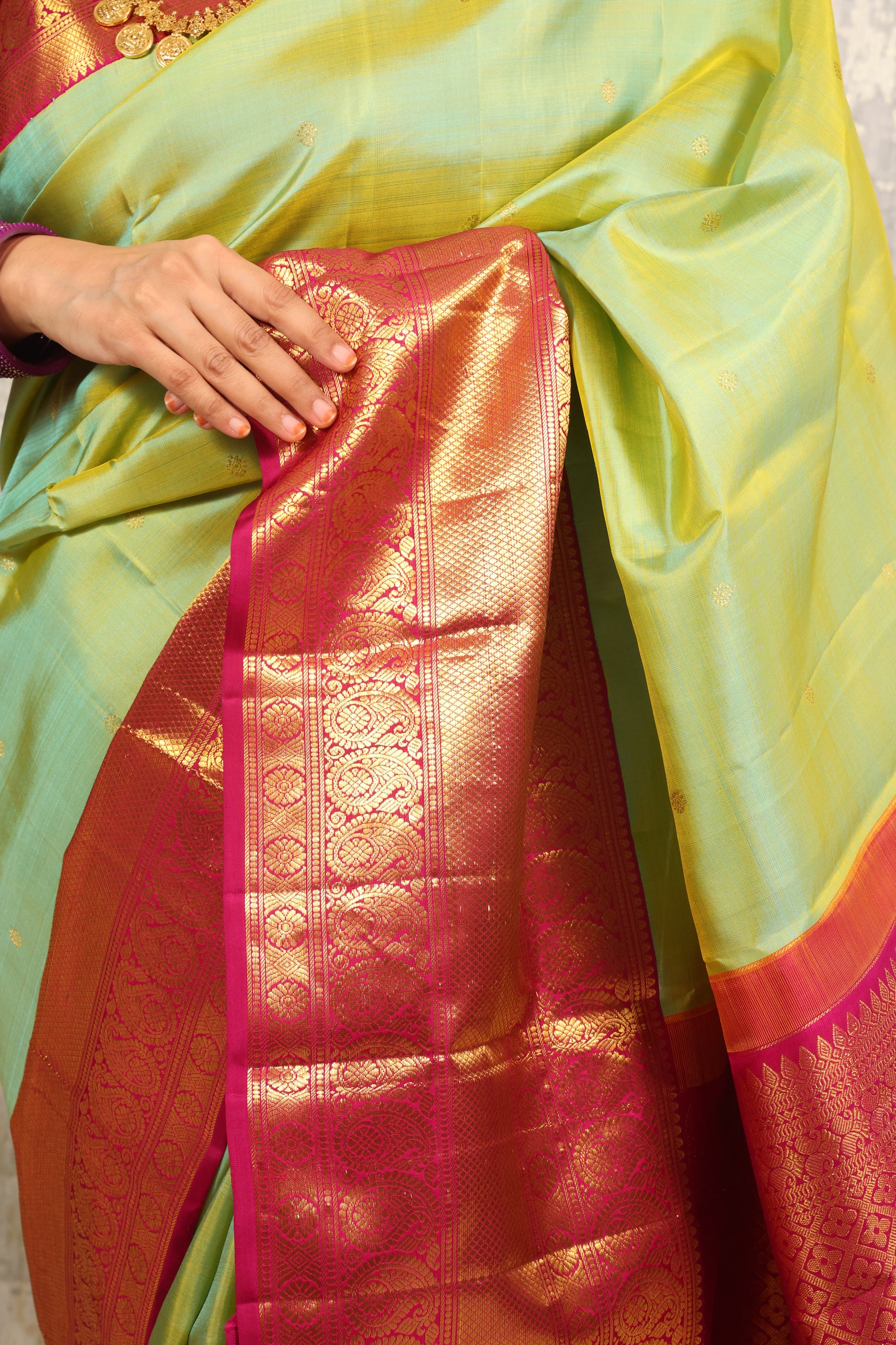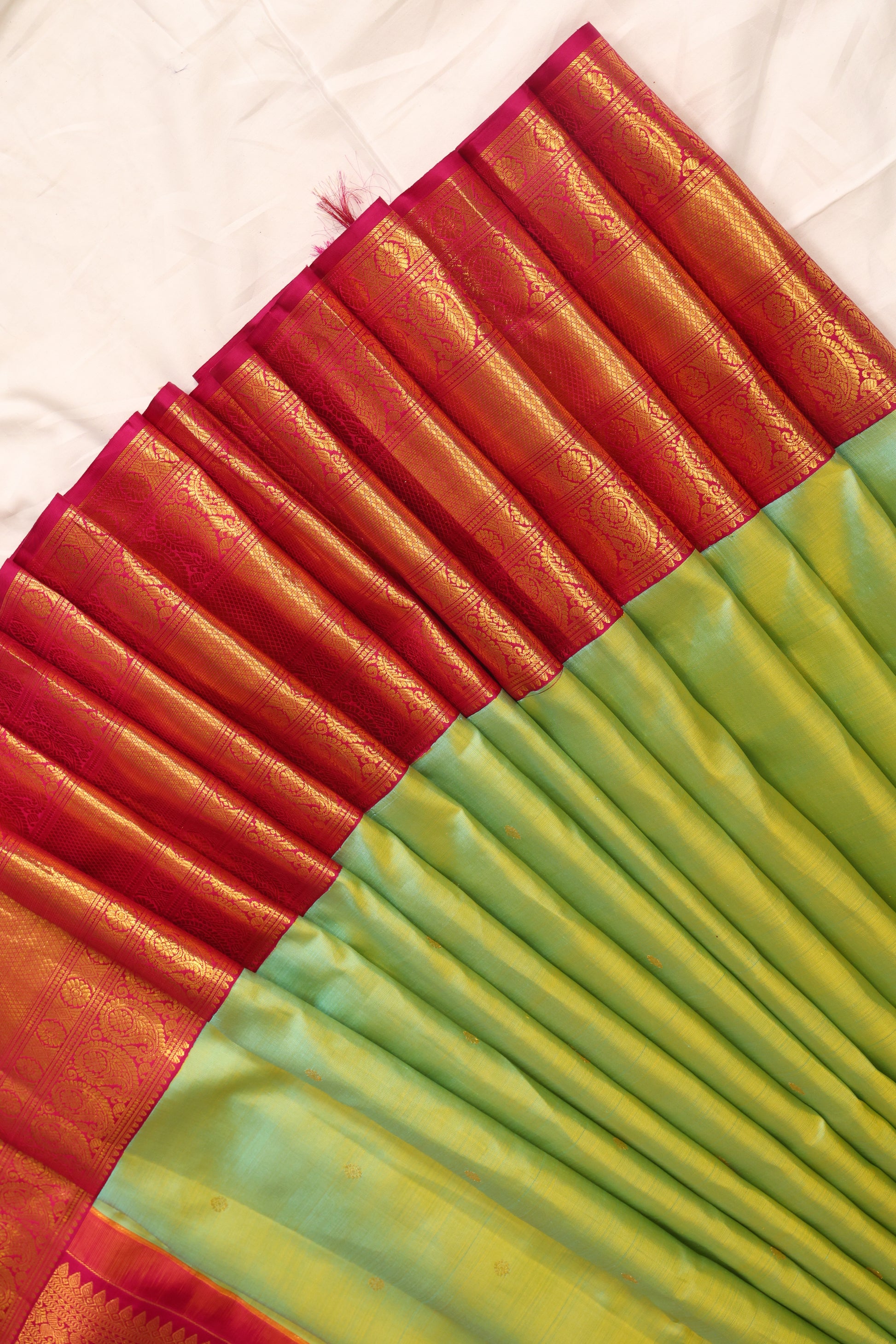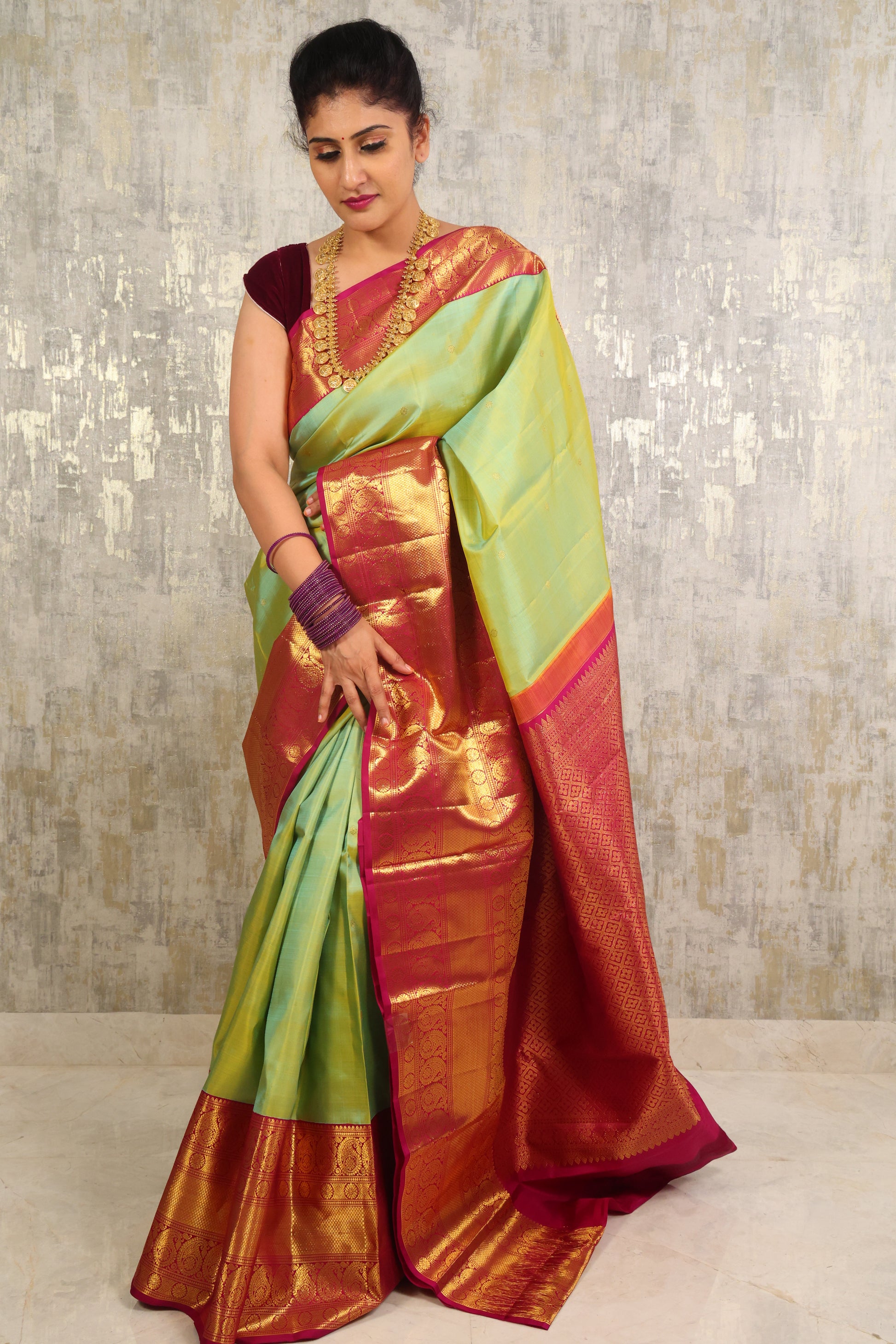 This Kanjivaram silk saree features a light green body with a striking deep pink zari border and pallu. The saree showcases intricate gold zari motifs and temple-inspired patterns on the border. The pallu is richly woven with elaborate geometric and floral zari designs. Made from pure silk, it has a luxurious sheen and is perfect for weddings, festive occasions, and traditional celebrations.