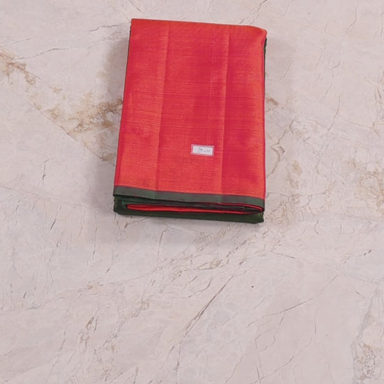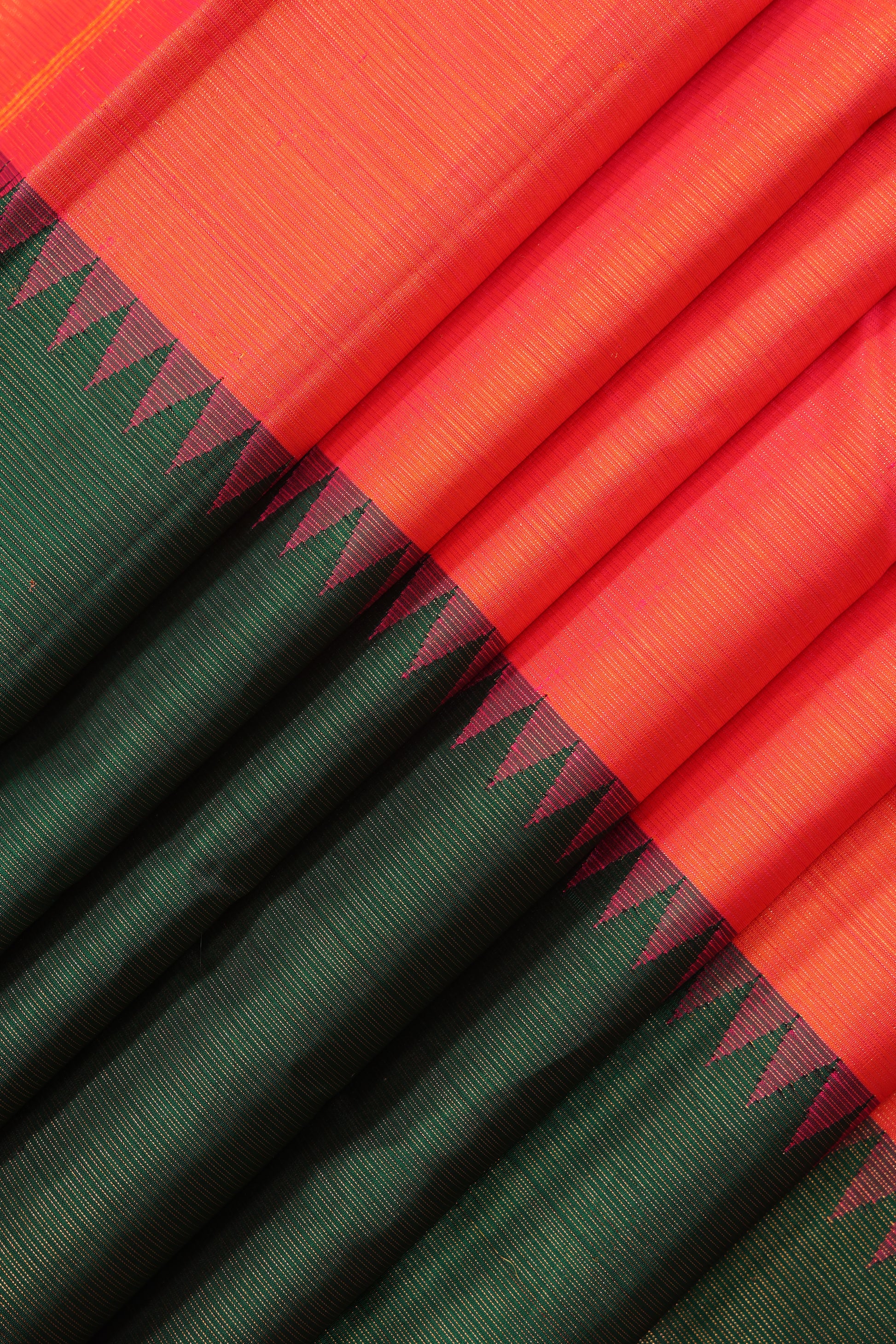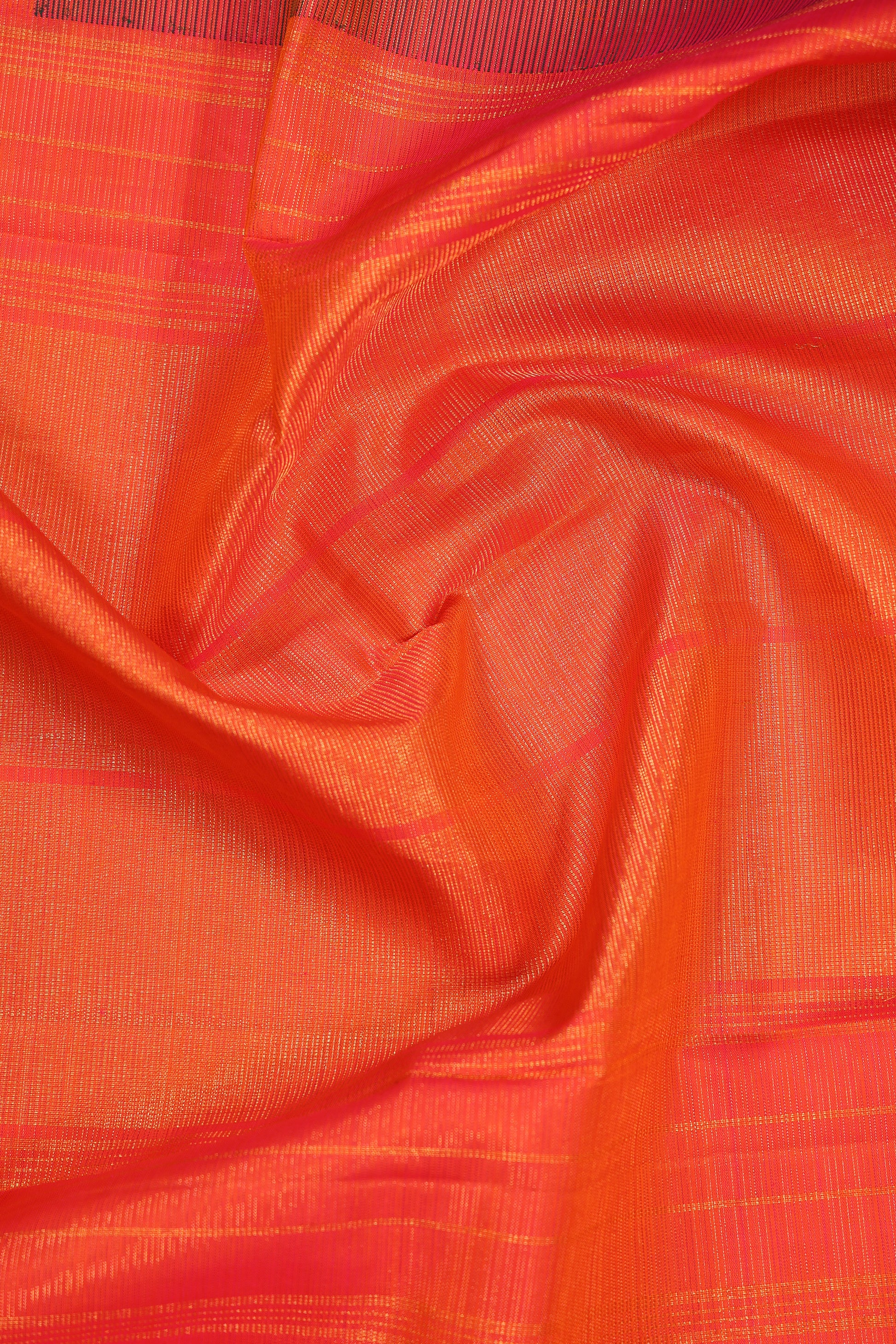 This Kanjivaram saree features a vibrant peachish orange body with fine golden zari stripes, paired with a deep green border adorned with red triangular motifs. Made from luxurious silk, it showcases the elegance of traditional Kanjivaram weaving. The rich peach orange pallu with intricate zari work enhances its grandeur, making it perfect for weddings, festive occasions, and cultural celebrations.