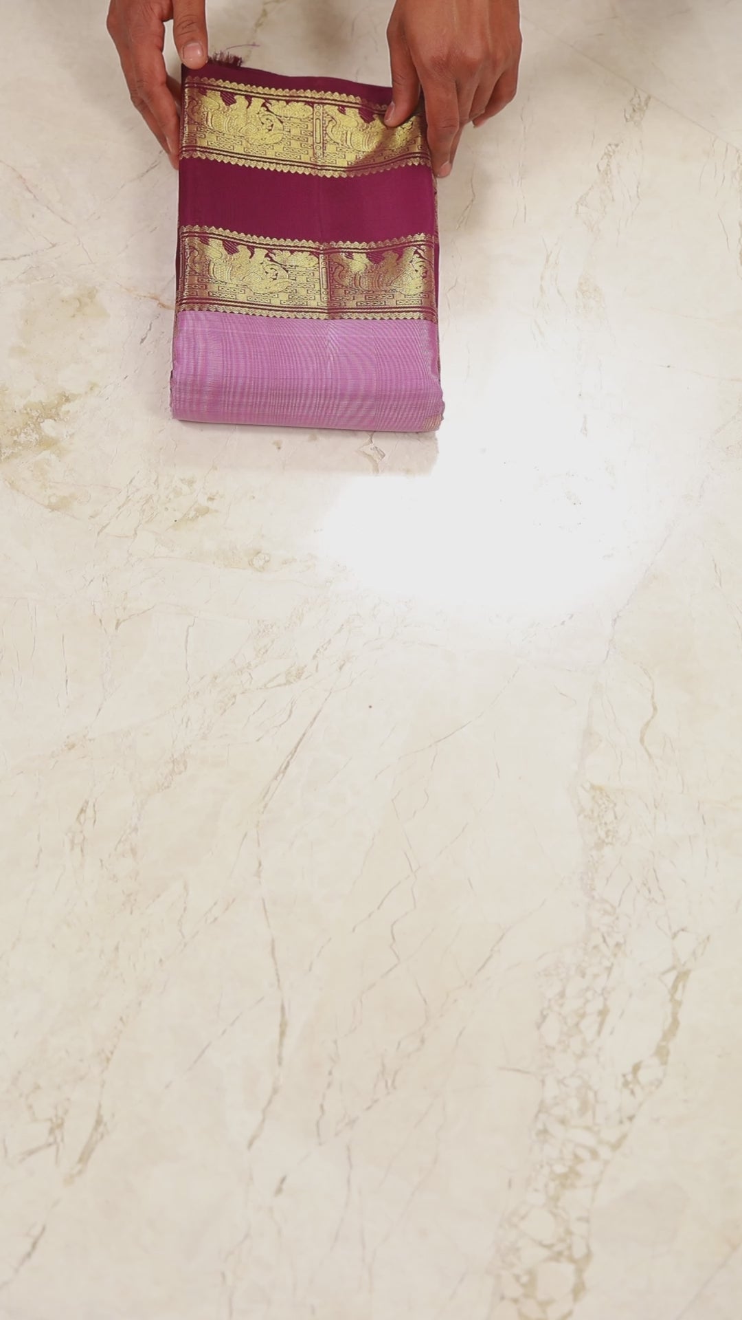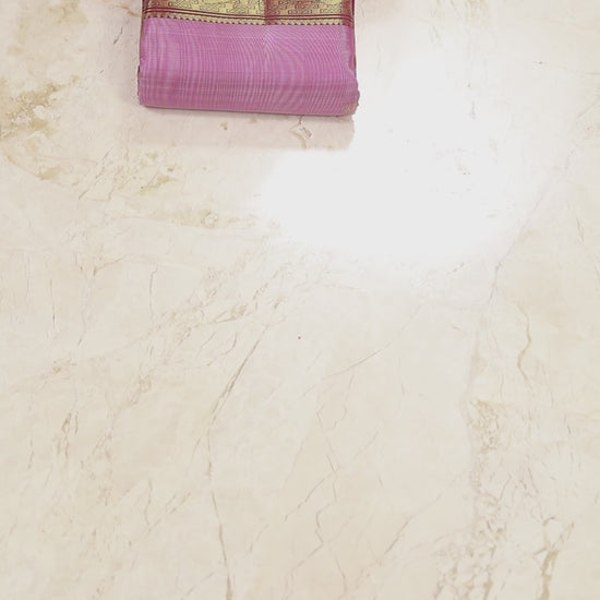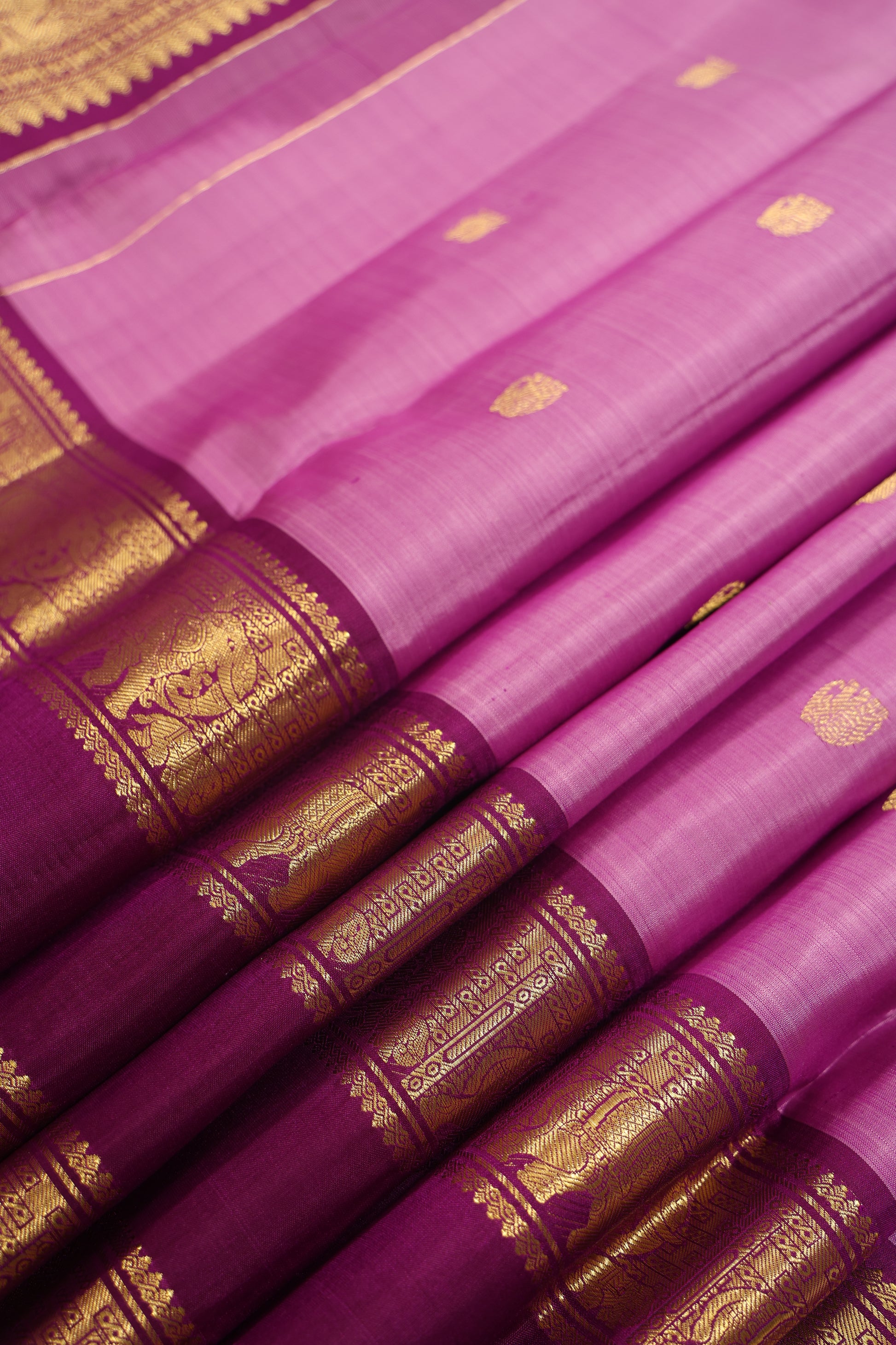This Kanjivaram silk saree features a vibrant pinkish lavender body with a contrasting maroonish deep purple border. It is adorned with intricate gold zari work, including traditional motifs like elephants, peacocks and temple-inspired designs. The rich border and pallu enhance its grandeur, making it ideal for weddings and festive occasions. Crafted using high-quality silk and the durable Kanjivaram weaving technique, this saree is a luxurious and timeless piece.