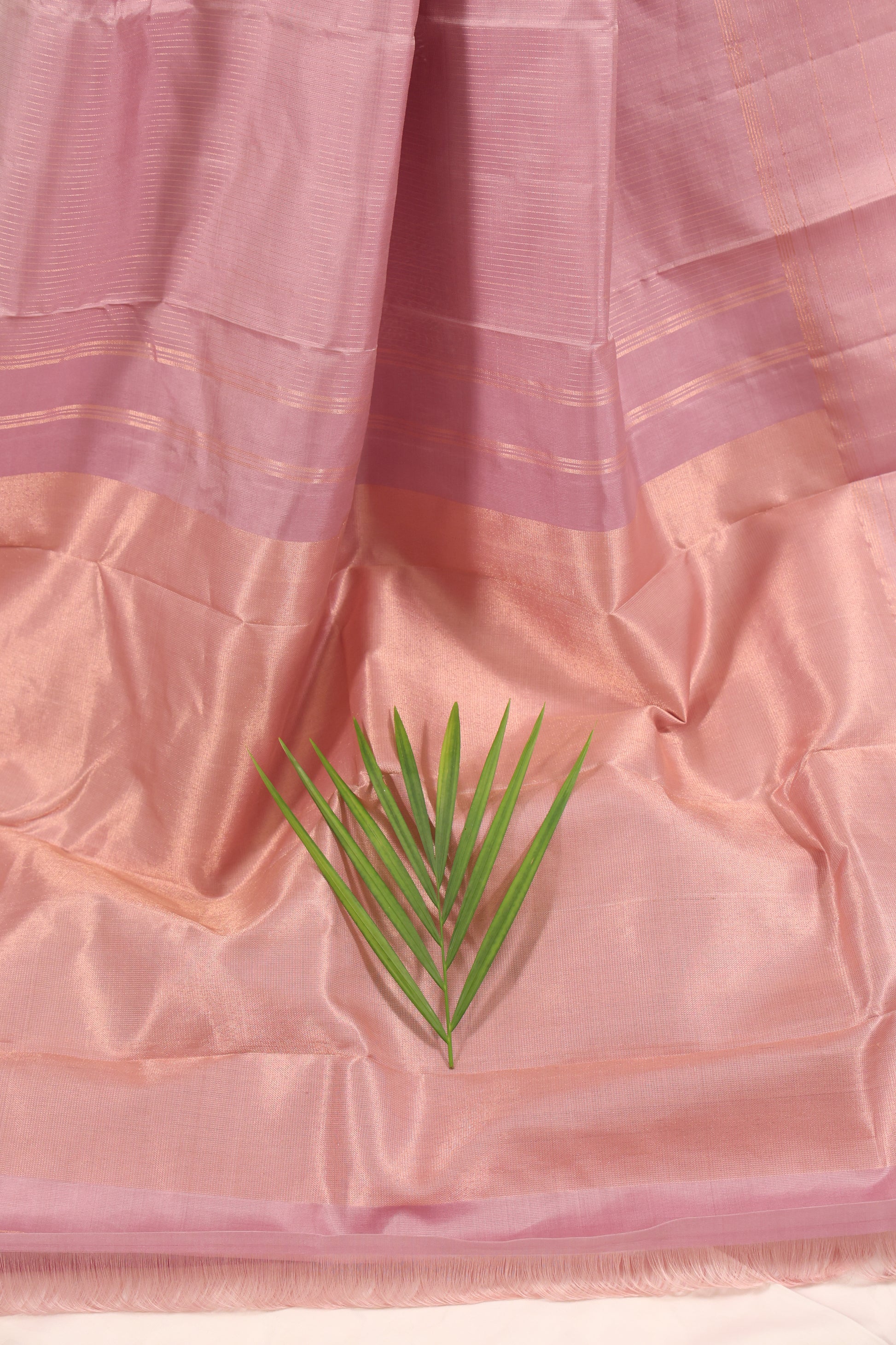 This Silk Kanjivaram Handloom Saree features a luxurious, soft pastel pink base with a light peach undertone. It has a smooth, lustrous texture, enhanced by subtle gold zari weaving along the borders and pallu. Thin horizontal gold zari stripes add depth and elegance to the fabric. It offers timeless elegance suitable for formal occasions and festivities, appealing to all ages.