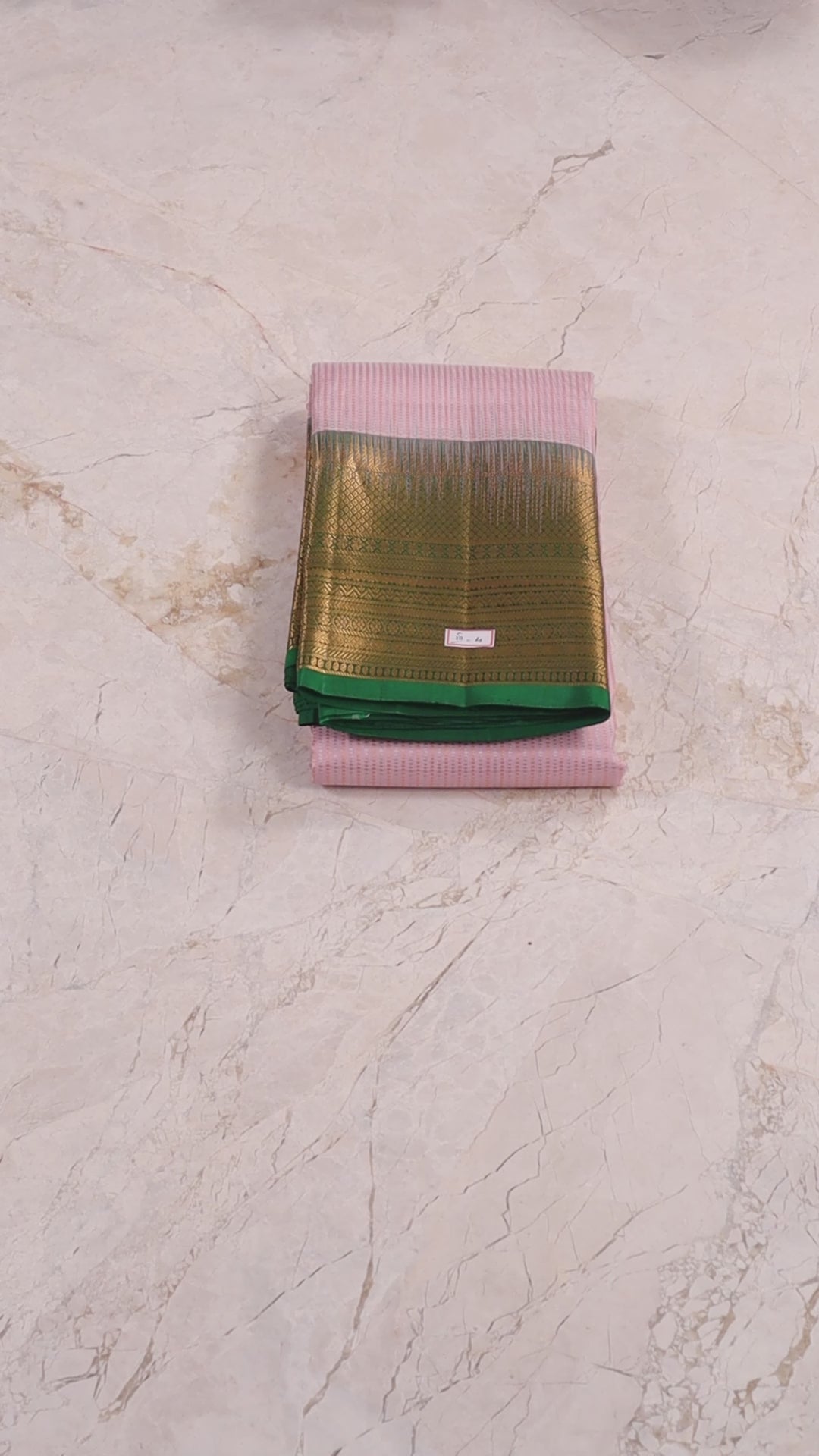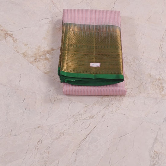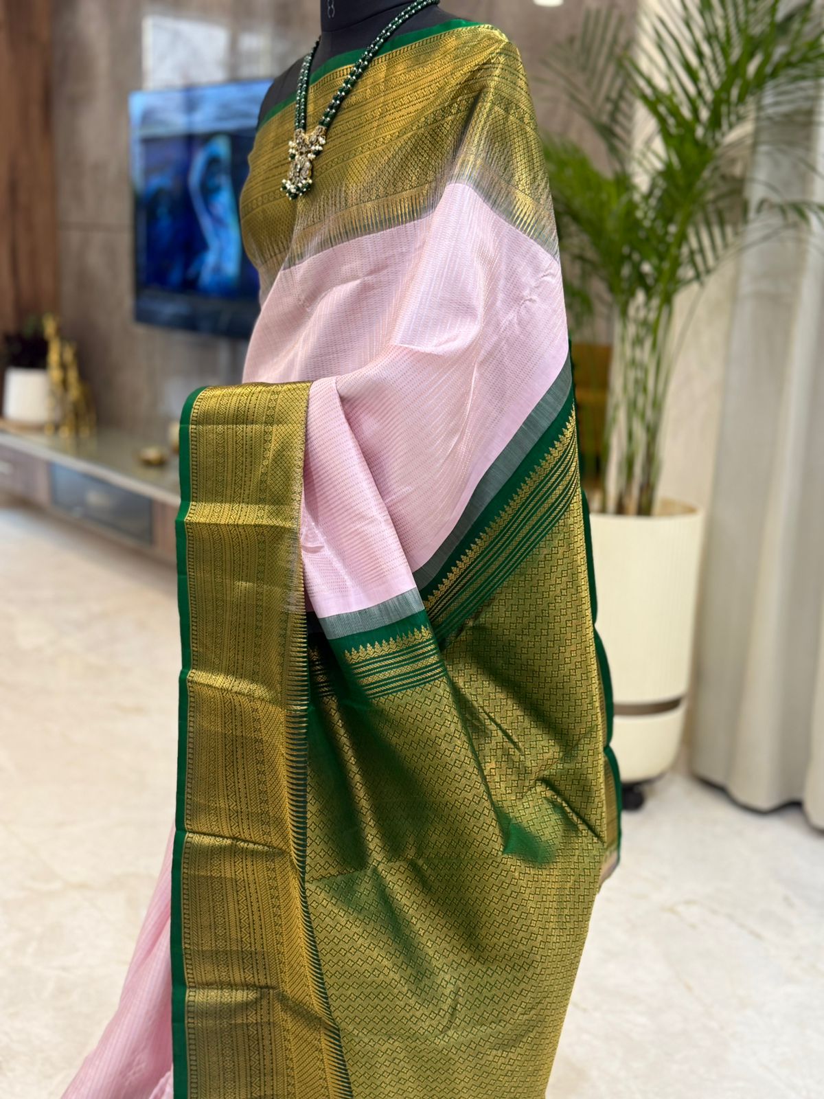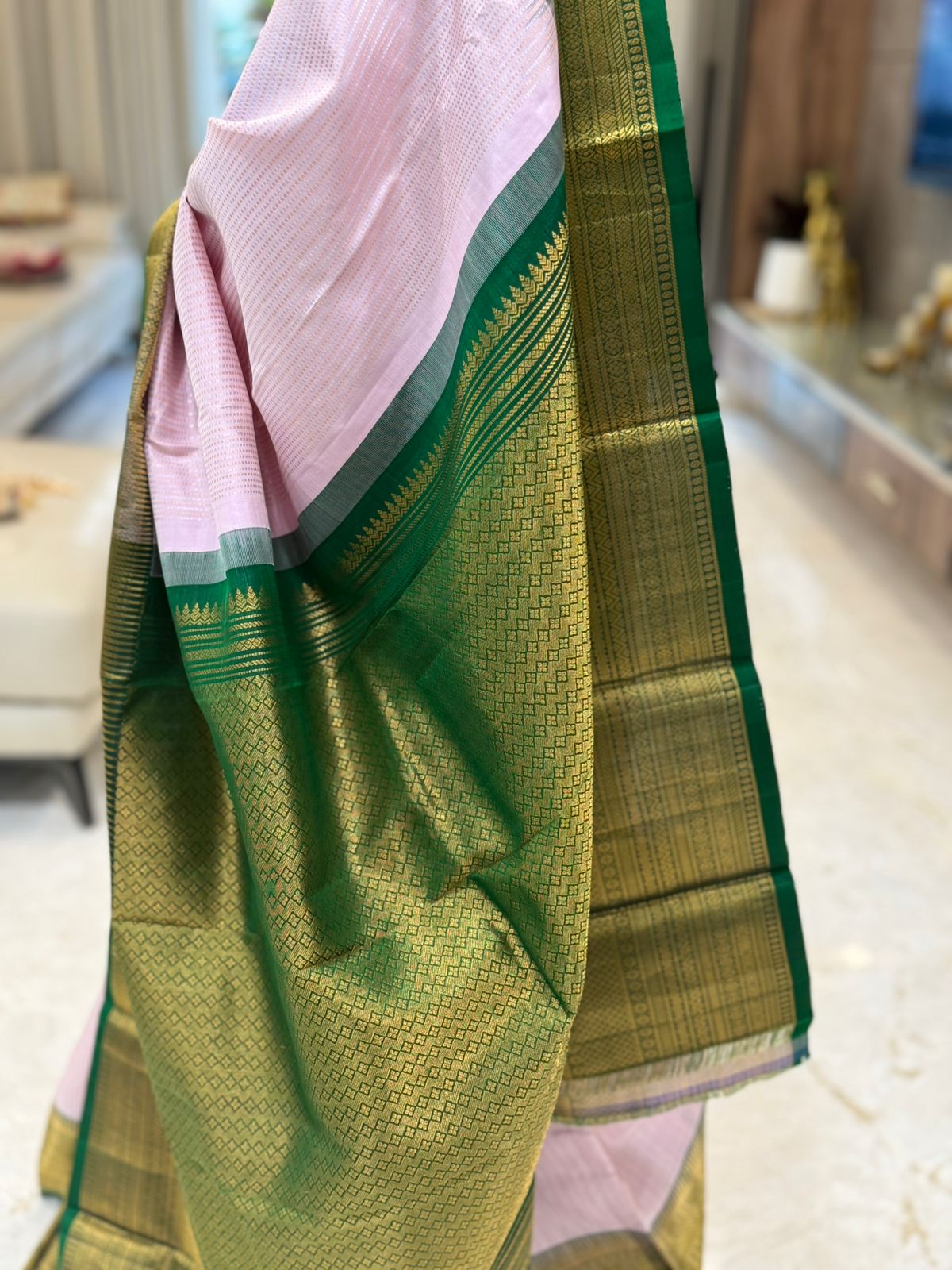 This Silk Handloom Kanjivaram Saree features a soft pastel pink body with fine golden thread work. It has a contrasting deep green border adorned with intricate gold zari motifs, including temple patterns and floral designs. The pallu is richly woven in gold zari, adding a regal touch.