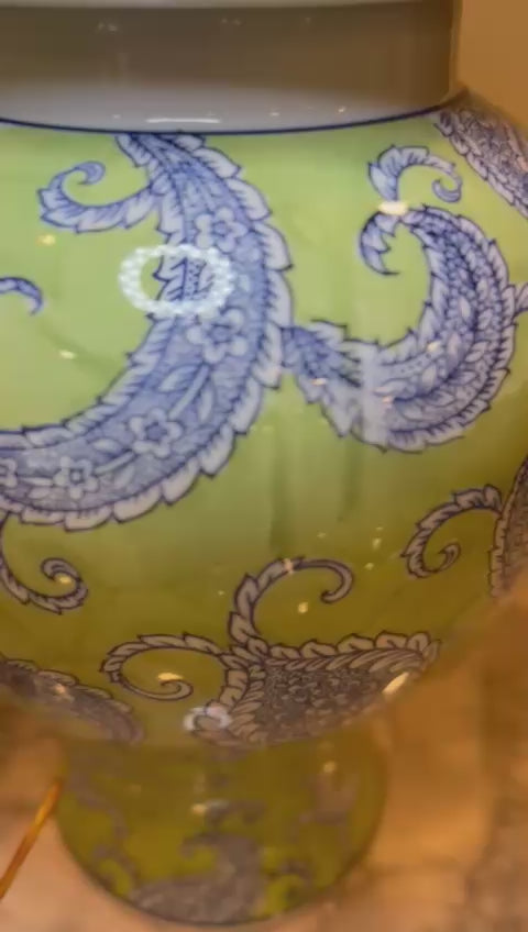 This is a ceramic or porcelain ginger jar with a vibrant lime green base and intricate blue paisley floral designs. It has a classic curvaceous shape, a domed lid with a pointed finial, and a glossy finish. This decorative piece is ideal as a centerpiece, storage container, or collectible, blending traditional elegance with a modern color palette.