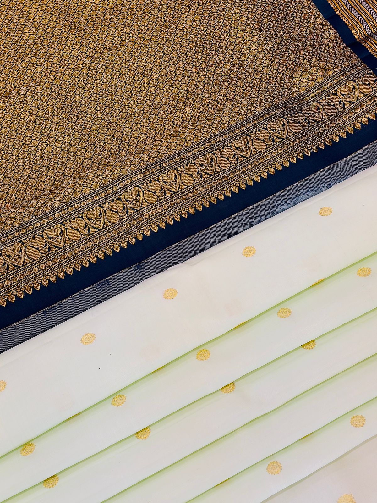 This ethereal pastel sea green handwoven Kanjivaram saree is a vision of grace and sophistication. Adorned with delicate golden buttas across the body, it radiates understated charm. The deep teal borders and pallu, richly woven with intricate gold zari motifs and geometric patterns, create a regal contrast. A masterpiece of tradition and elegance, this saree is perfect for brides and festive occasions, capturing the timeless