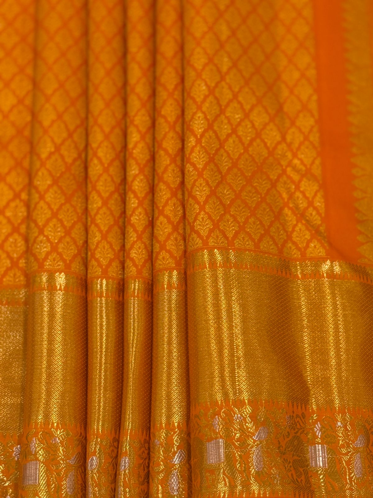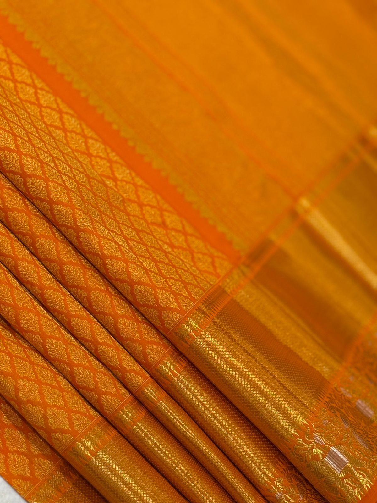 This exquisite handwoven Kanjivaram saree radiates timeless elegance in a rich marigold-orange hue. Adorned with intricate golden zari motifs across the body, it features a lustrous, broad gold border and pallu with delicate floral and geometric patterns. The fine silk weave exudes luxury, while the vibrant color symbolizes festivity and grandeur—making it a perfect choice for weddings, celebrations, and cherished occasions, embodying the artistry and heritage of South Indian weaving.