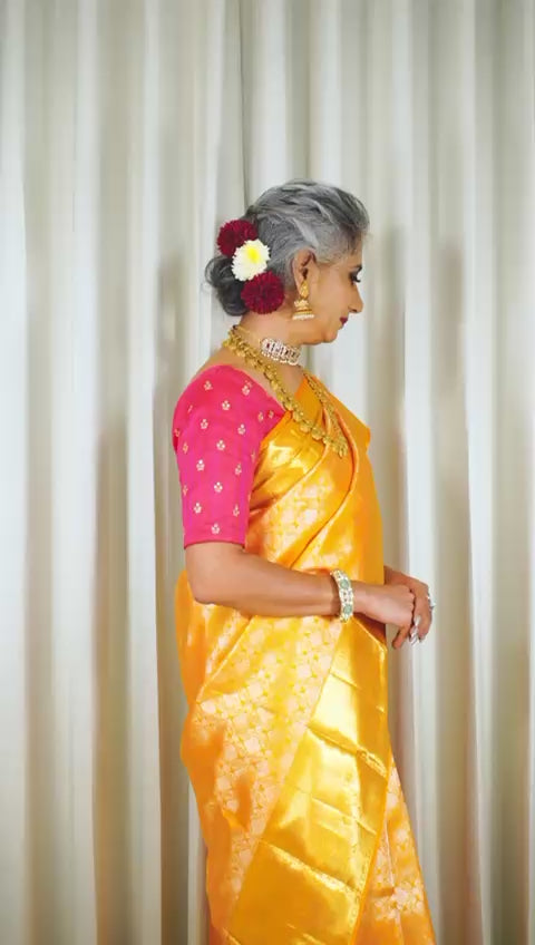 This Kanjivaram saree radiates the brilliance of molten gold with its vibrant marigold yellow silk, intricately woven with shimmering golden zari motifs. The body glows with timeless patterns, while the pallu and borders are enriched with traditional designs that exude opulence. Paired with a contrasting magenta blouse, this masterpiece symbolizes grandeur and festive splendor, making it a perfect choice for weddings and auspicious celebrations. Its lustrous drape embodies elegance and tradition beautifully.