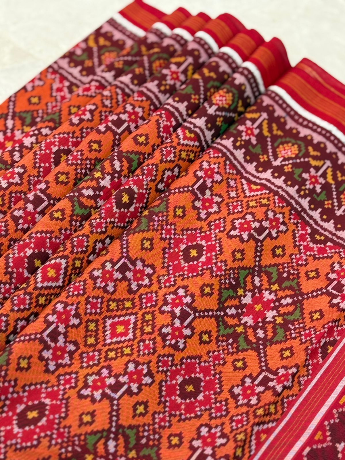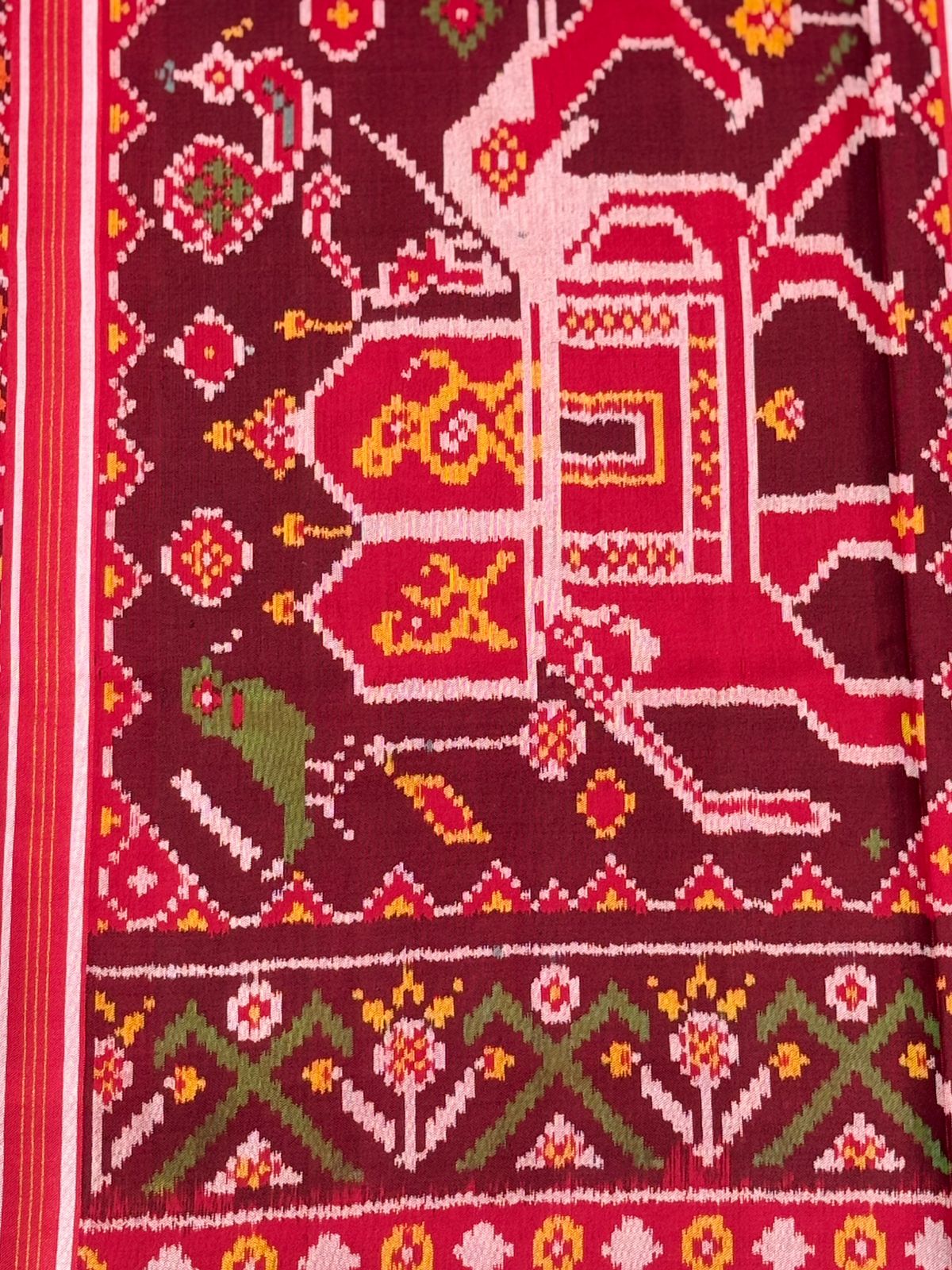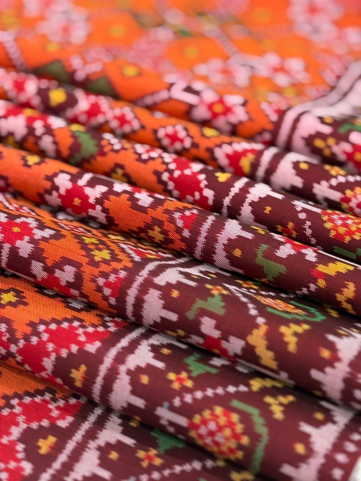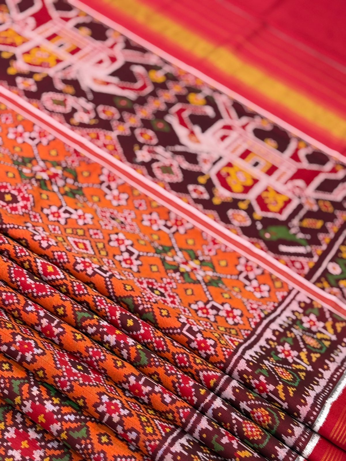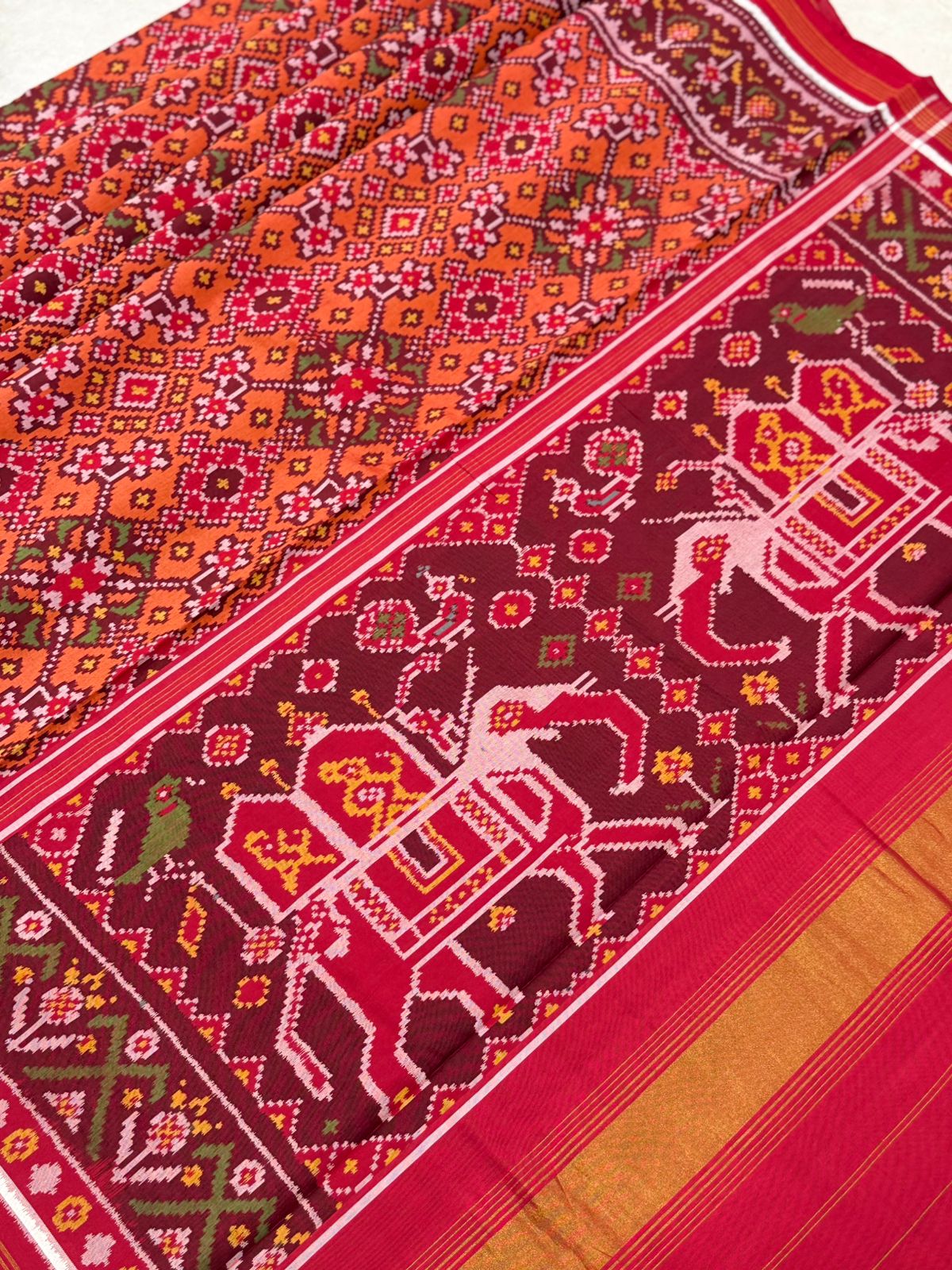 This radiant single ikkat pure mulberry silk Patola saree captivates with its vibrant hues of orange, maroon, and red. Adorned with intricate floral and geometric motifs, the weave celebrates traditional craftsmanship in its most vivid form. The pallu features majestic elephant and temple motifs, adding regal charm. Perfect for festive occasions, this saree blends heritage artistry with bold elegance, making it a timeless treasure in any connoisseur’s wardrobe.