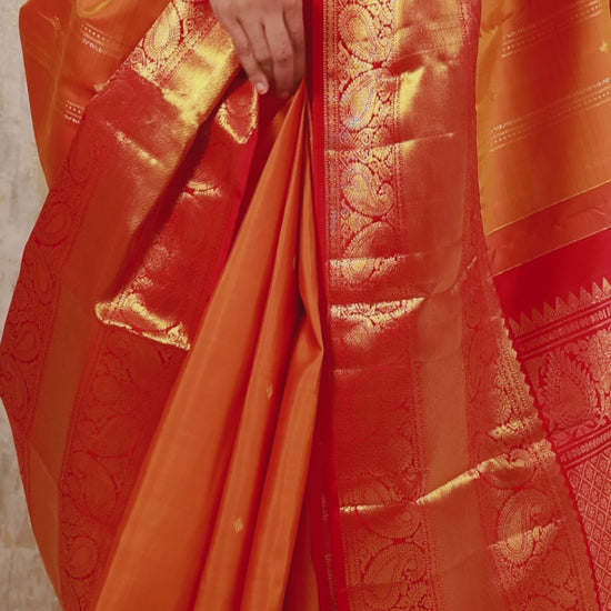 This Kanjivaram silk saree features a vibrant orange and red combination with rich gold zari work. The orange body has subtle golden motifs, while the deep red border and pallu showcase intricate traditional designs. Made from pure silk, it exudes luxury and durability. Perfect for weddings and festive occasions.