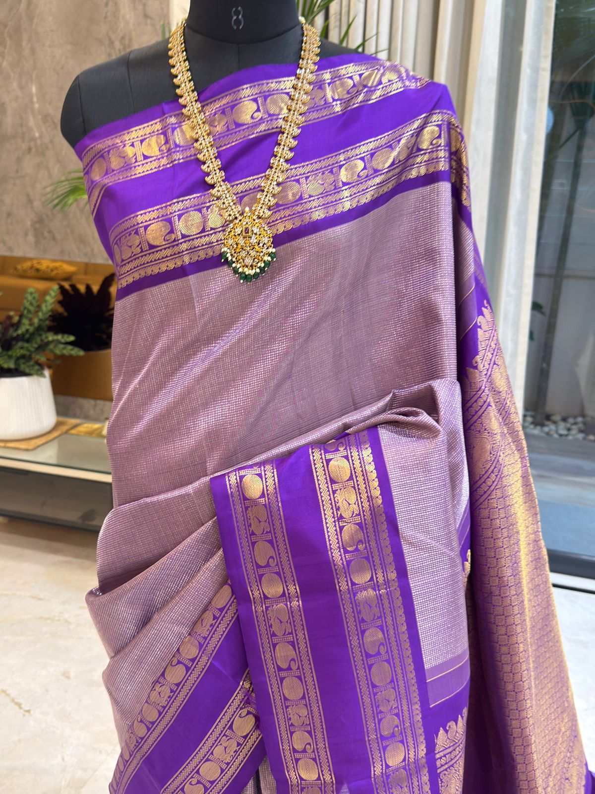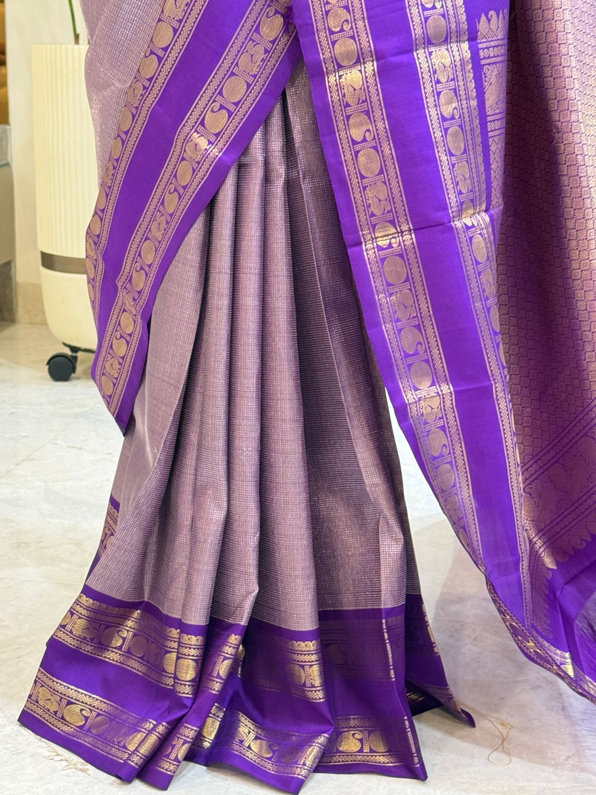 This handwoven silk Kanjivaram saree is an exquisite blend of tradition and elegance. The body features intricate micro-checkered patterns in soft lavender, creating a subtle yet stunning texture. Rich royal blue borders with opulent golden zari work showcase classic motifs like paisleys and floral vines, adding grandeur. The pallu is adorned with detailed golden designs, making it perfect for festive occasions and weddings. A timeless piece, it celebrates the artistry of Kanchipuram weavers beautifully.