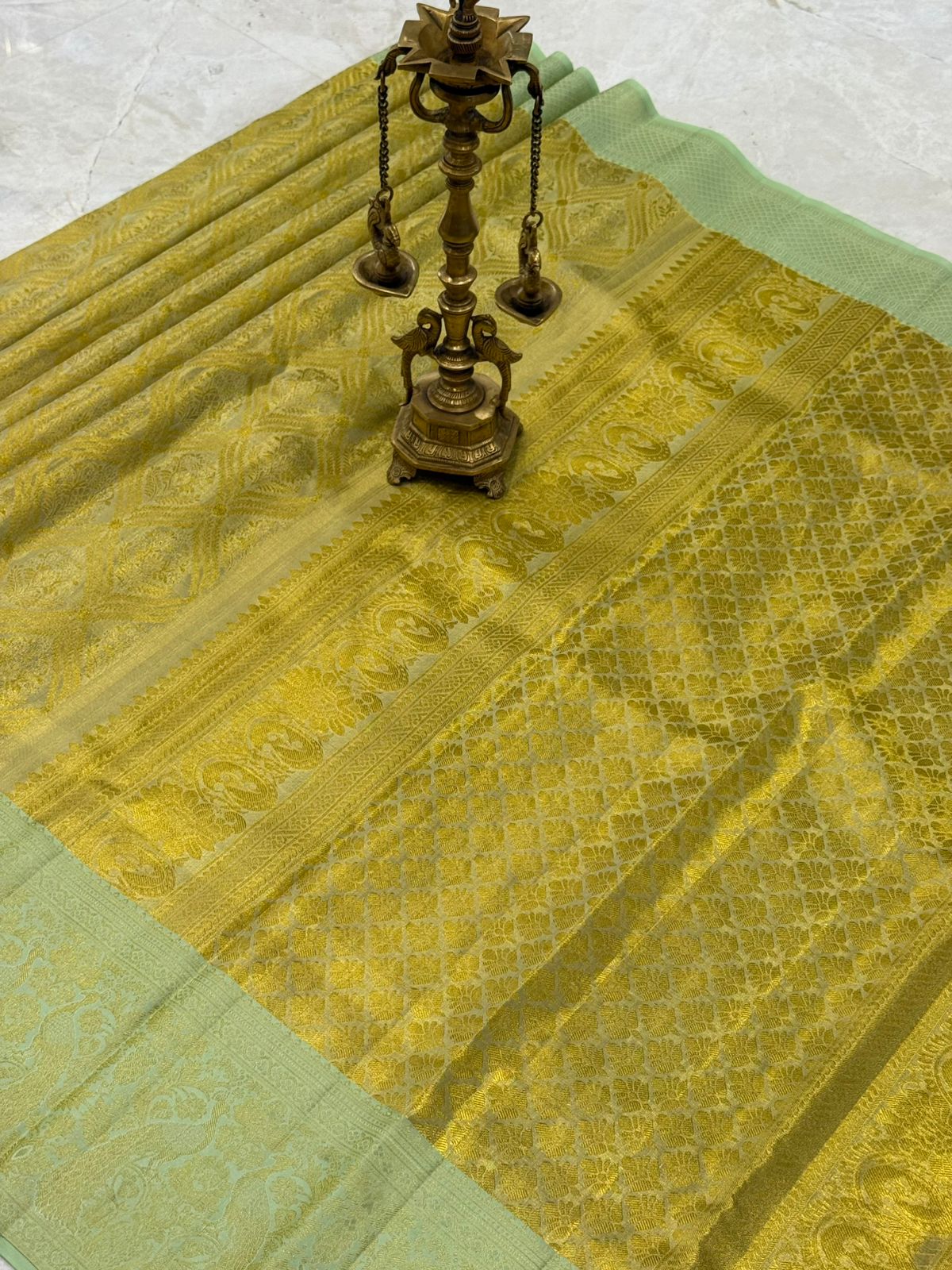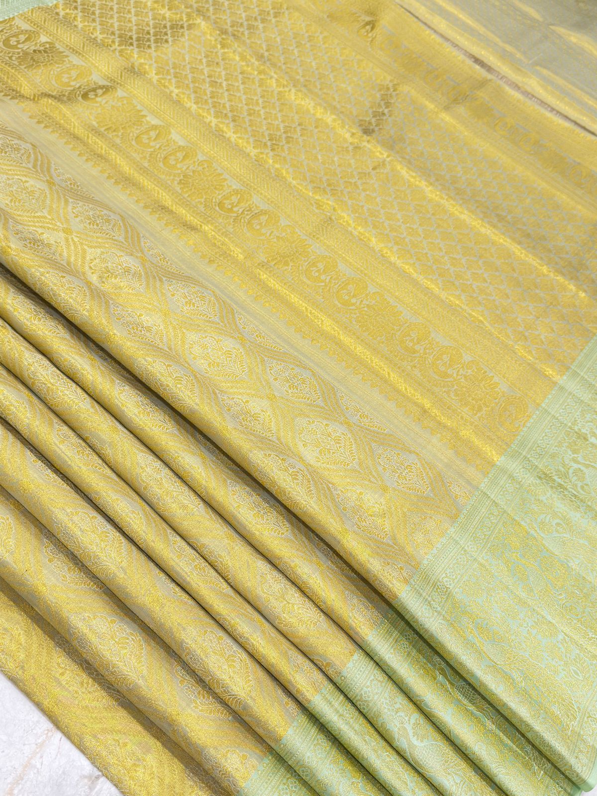 This enchanting handwoven full zari Kanjivaram saree glows in a rare pastel green with golden zari artistry. The body features intricate floral and geometric motifs, while the borders showcase regal peacock designs woven in shimmering gold. Its grand pallu dazzles with elaborate patterns, reflecting the richness of traditional craftsmanship. Elegant yet opulent, this masterpiece is perfect for weddings, festive occasions, and treasured celebrations, radiating sophistication and timeless beauty.