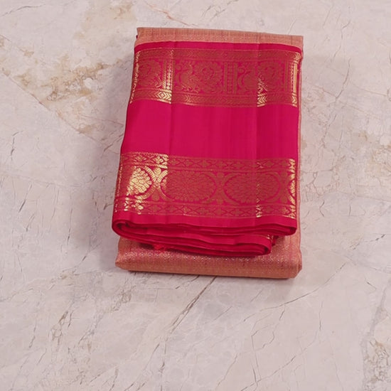 This Kanjivaram saree is a luxurious peach with golden zari work, featuring a vibrant red border with intricate golden zari work. The broad borders are adorned with classic motifs like peacocks. The pallu is elaborately decorated, enhancing its regal and festive appeal. Crafted using the double-warp Kanjivaram weaving technique, it’s perfect for weddings, festivals, and special occasions.