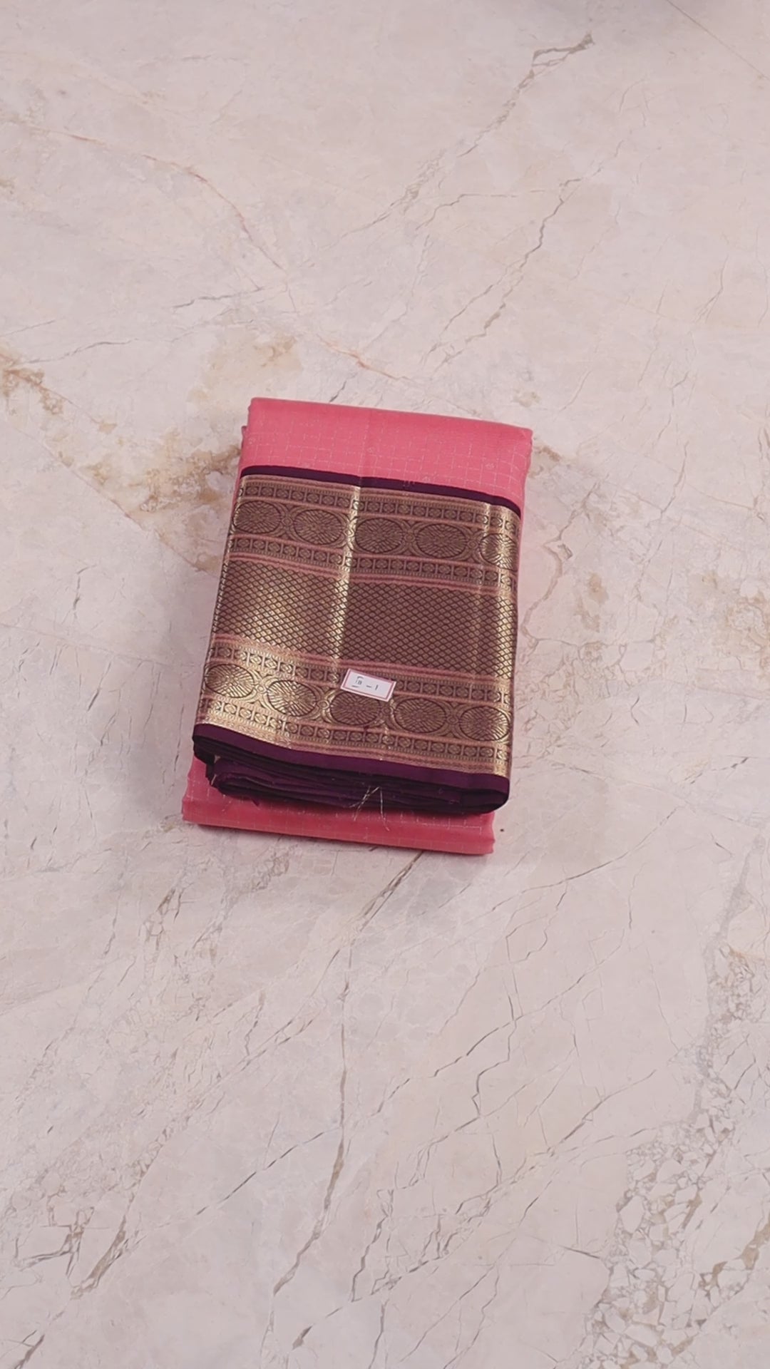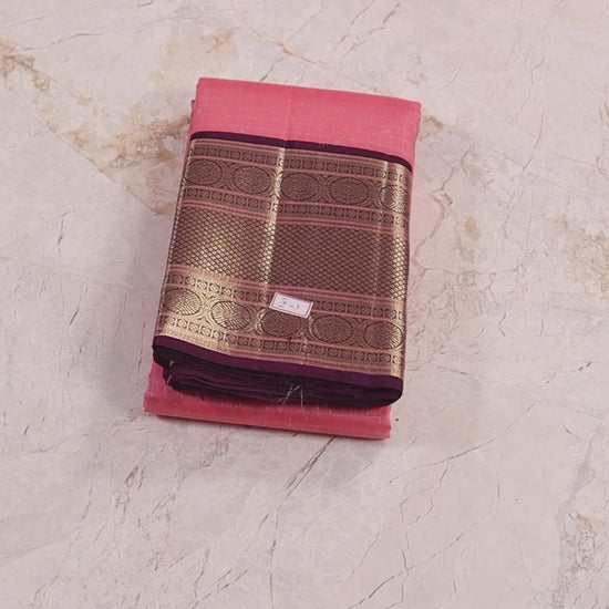 The Kanjivaram saree is a luxurious, coral-pink pure silk saree adorned with subtle golden checkered patterns. It features deep brown borders and a richly decorated pallu with intricate golden zari work, including circular motifs, floral patterns, and diamond mesh designs. The craftsmanship is exquisite, with fine and symmetrical detailing showcasing skilled weaving. The vibrant contrast between the coral-pink body and deep maroon pallu creates an elegant and graceful appearance, making it ideal for weddings, festive occasions, and grand celebrations.