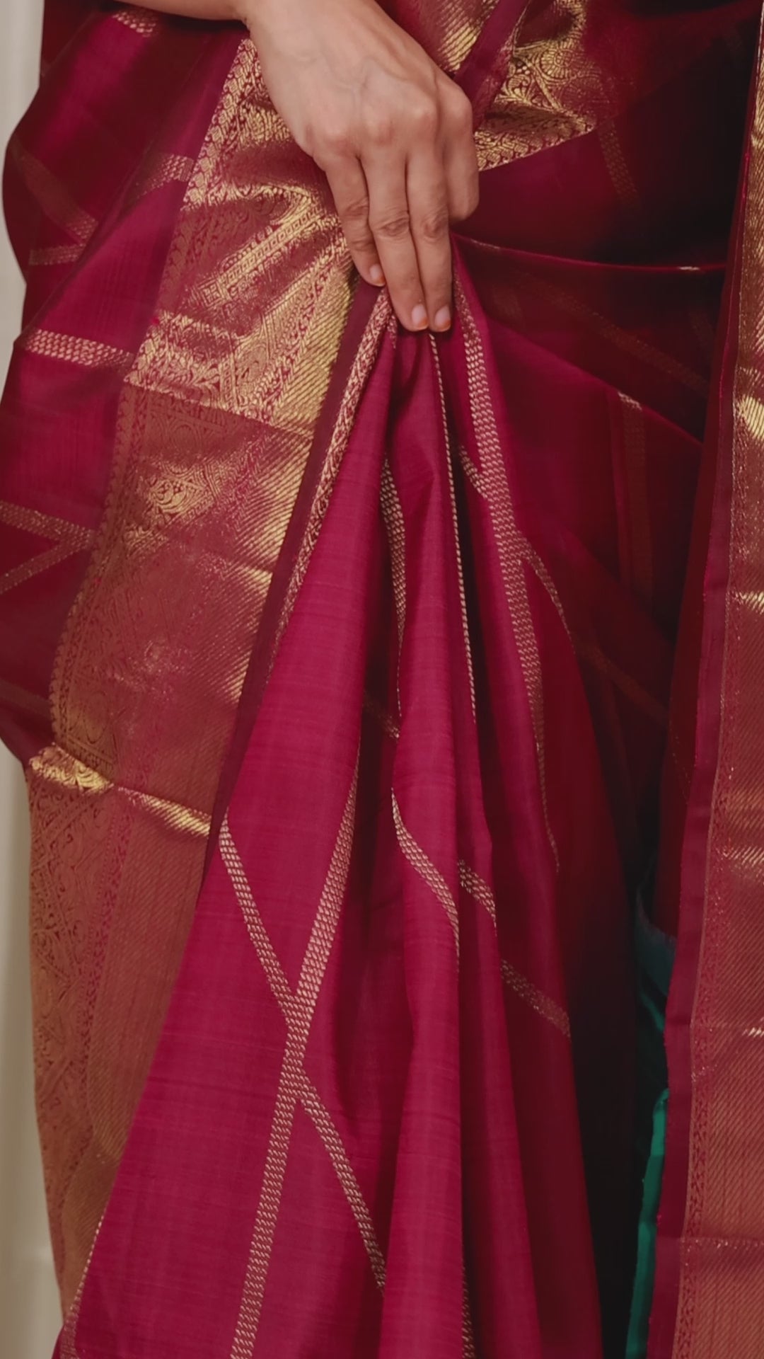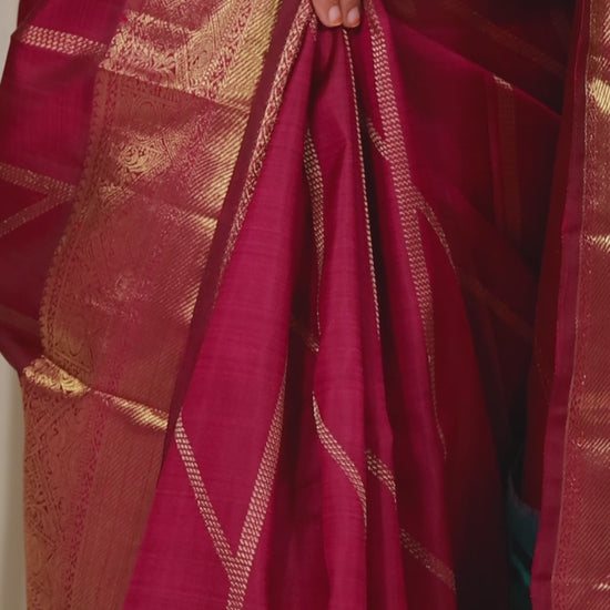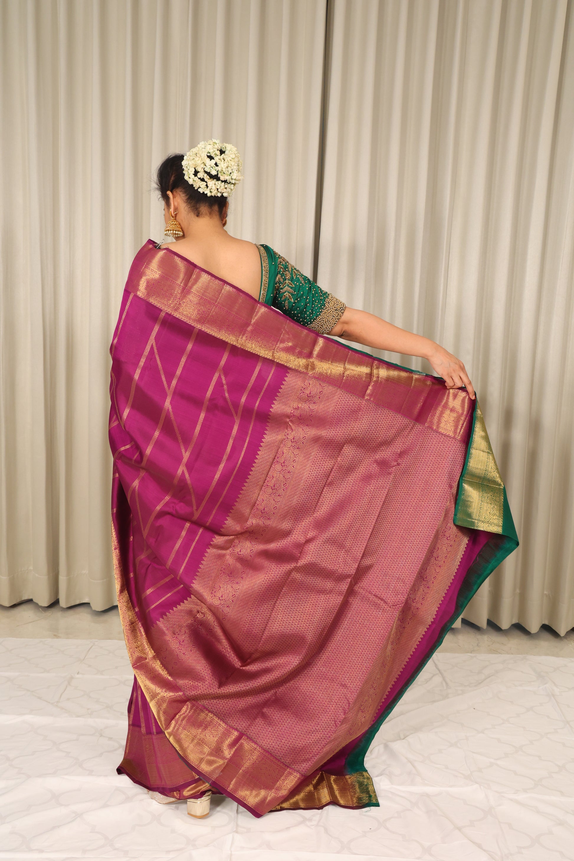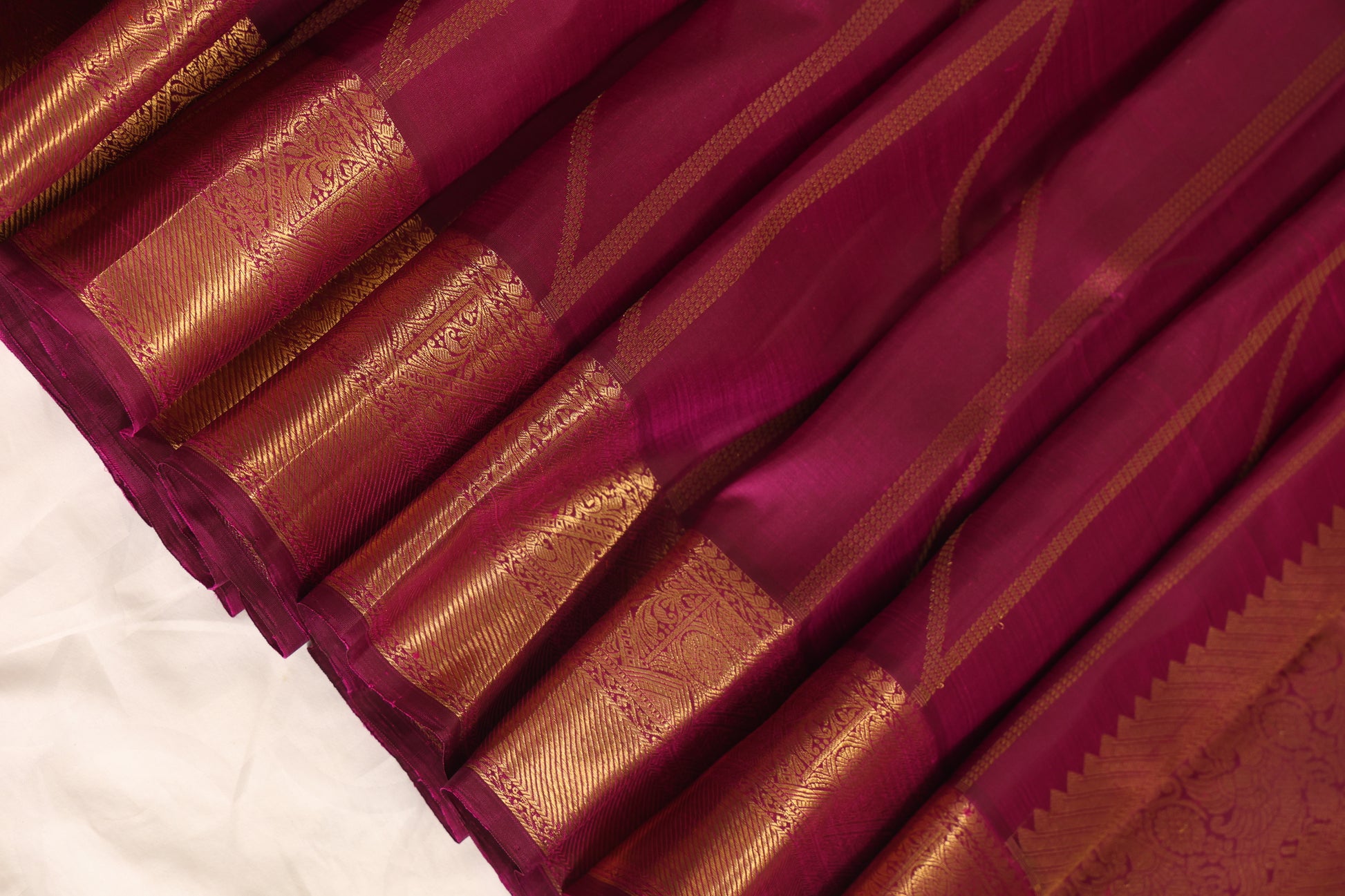 This Pure Silk Handloom Kanjivaram Saree features a rich violet base with intricate golden zari work. It has a luxurious sheen and sturdy texture. The saree showcases geometric motifs on the body, a grand golden zari border with traditional patterns, and an opulent pallu. Ideal for weddings and festive occasions.