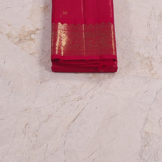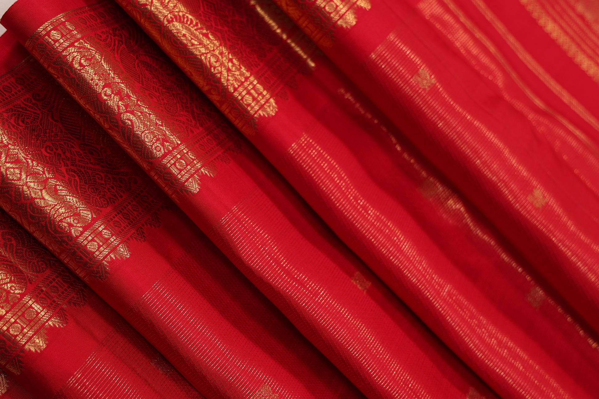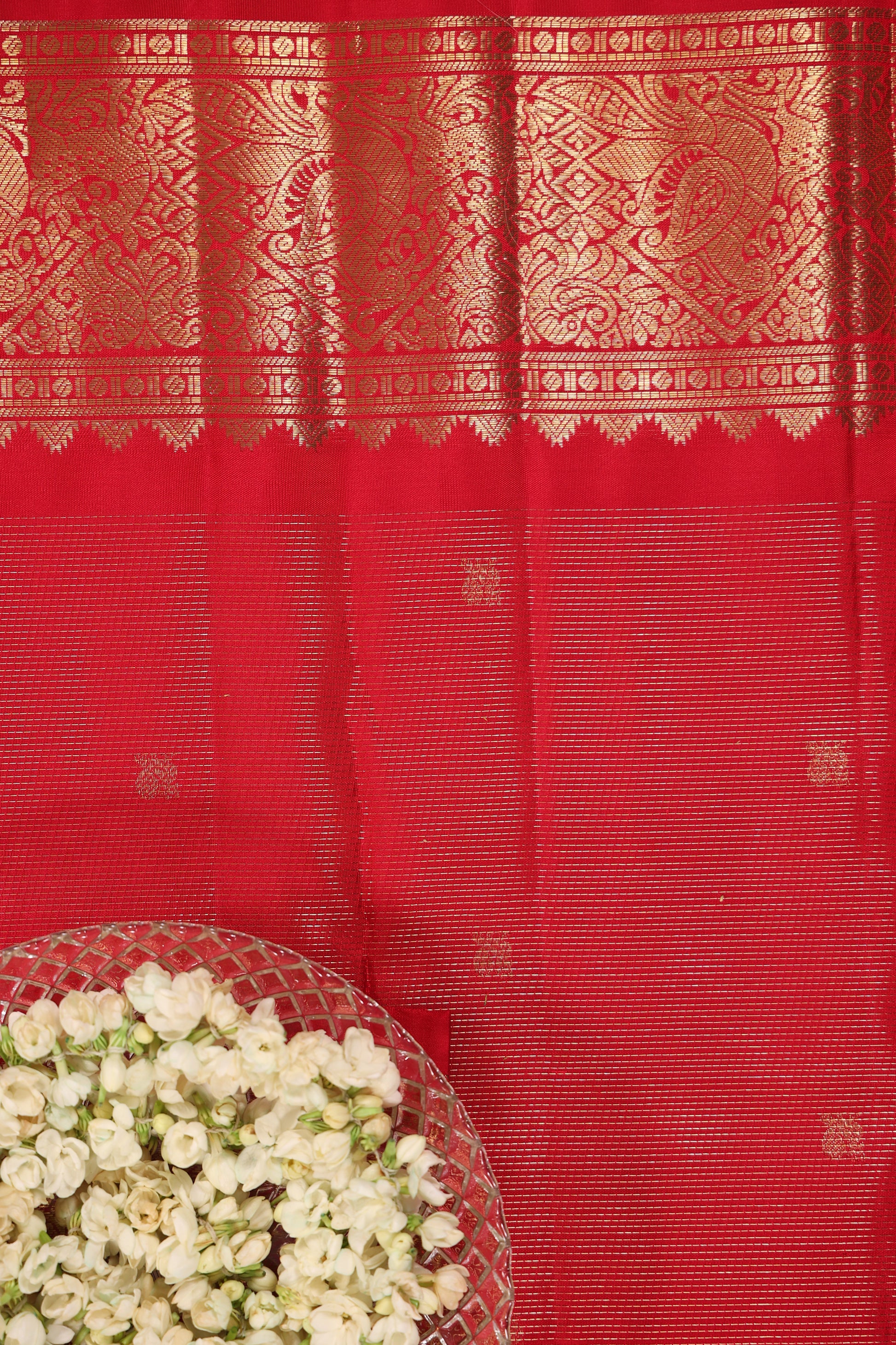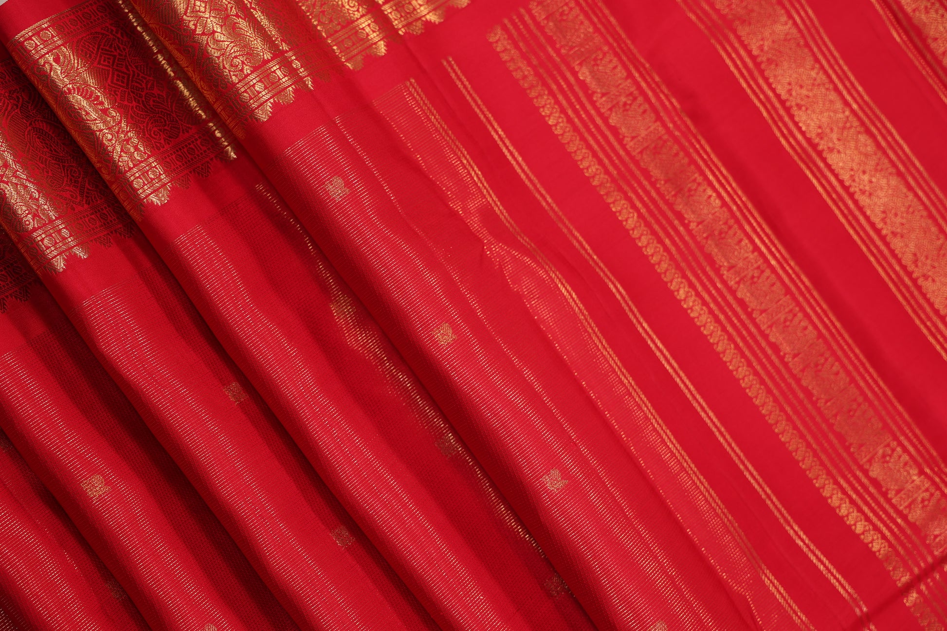 This is a luxurious red Kanjivaram silk saree with intricate golden zari work, featuring traditional vairaoosi pattern. The saree’s rich texture is enhanced by fine golden lines and small Butti motifs scattered across the fabric. The heavily adorned pallu and borders exude grandeur, making this saree perfect for weddings, festivals, and special occasions. The classic red and gold combination offers a timeless, royal appeal.
