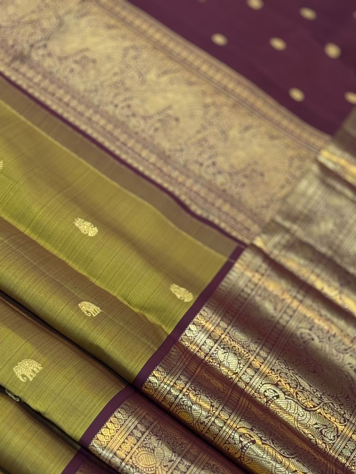 This exquisite handwoven Kanjivaram saree is a true testament to timeless elegance. Adorned in a regal combination of parrot green and deep maroon, it features intricate golden zari motifs of elephants and floral vines. The rich pallu dazzles with traditional peacock and paisley patterns in resplendent gold, enhancing its grandeur. Perfect for festive and bridal occasions, this saree weaves heritage and artistry into every shimmering thread.