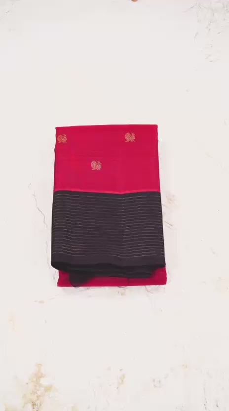 This Kanjivaram saree is an exquisite masterpiece woven in rich magenta and deep purple hues, adorned with intricate gold zari work. The luxurious pallu flaunts ornate motifs and traditional patterns, while the body is embellished with delicate gold buttas, radiating timeless elegance. The bold contrast of vibrant pink and royal purple, with shimmering golden borders, makes this saree a regal choice for grand occasions, blending tradition and sophistication effortlessly.