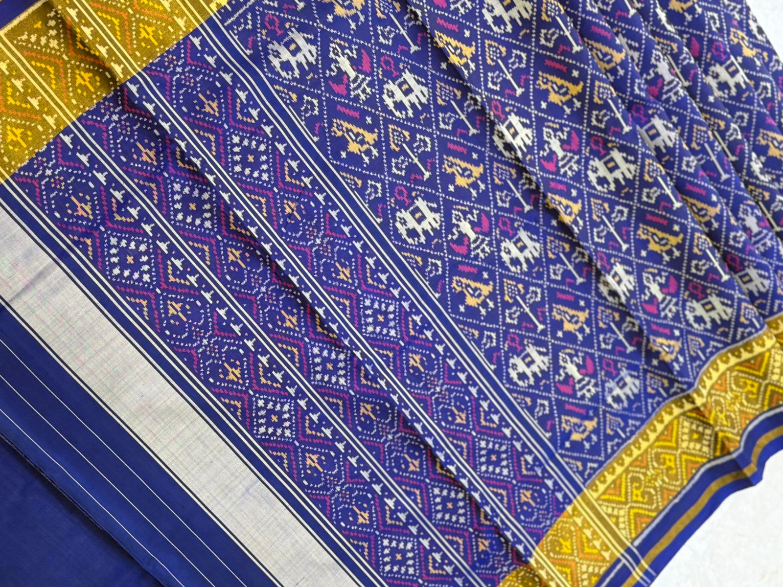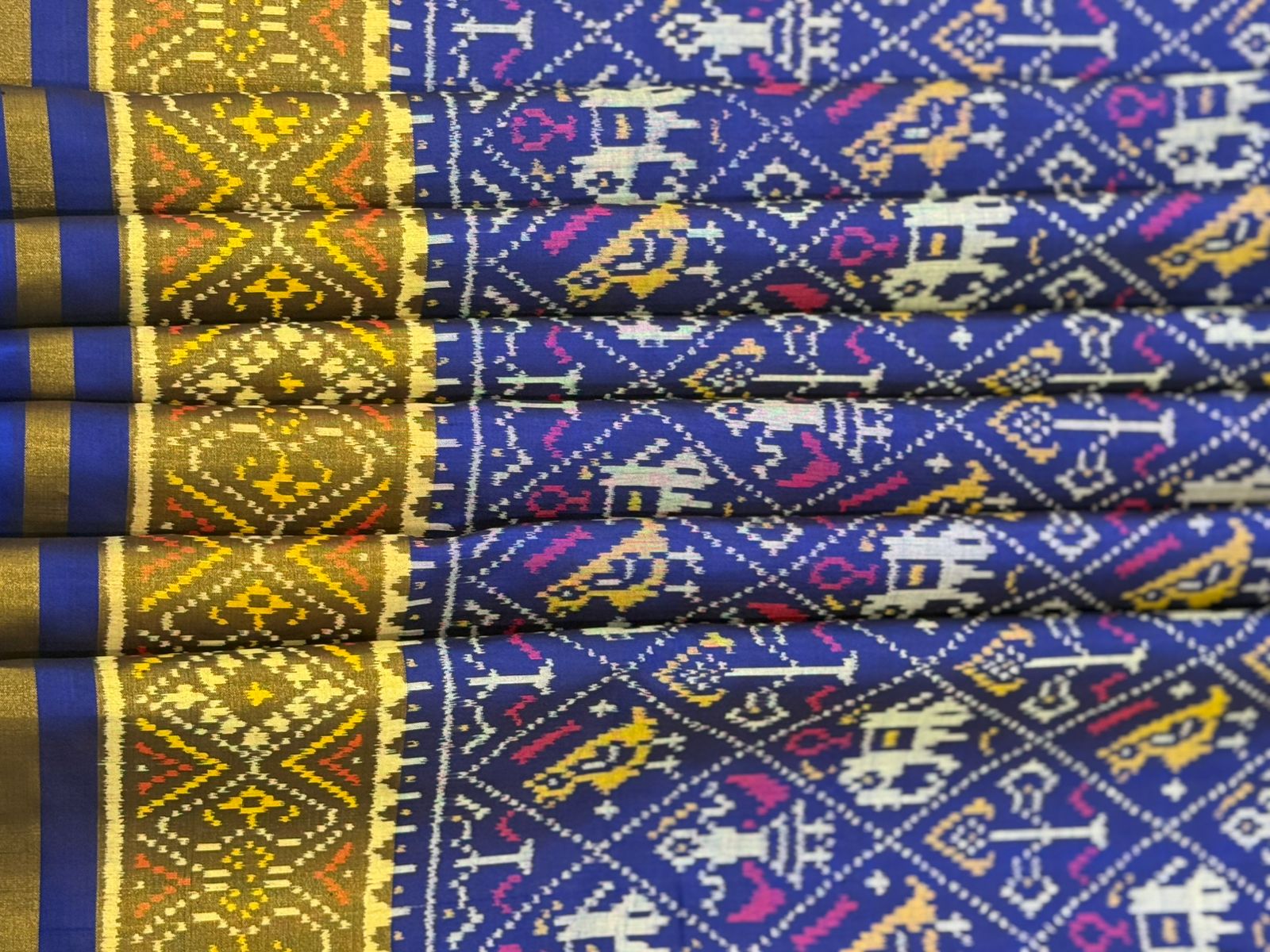 Immerse yourself in timeless elegance with this exquisite single ikkat handwoven mulberry silk Patola saree. The deep royal blue base is beautifully contrasted by intricate motifs in vibrant hues—magenta, ivory, mustard, and gold—each meticulously woven to reflect heritage artistry. A resplendent golden border enhances its grandeur, while the rhythmic symmetry of traditional patterns lends it regal charm. Perfect for celebrations, this saree embodies luxury, tradition, and the soul of Indian craftsmanship.