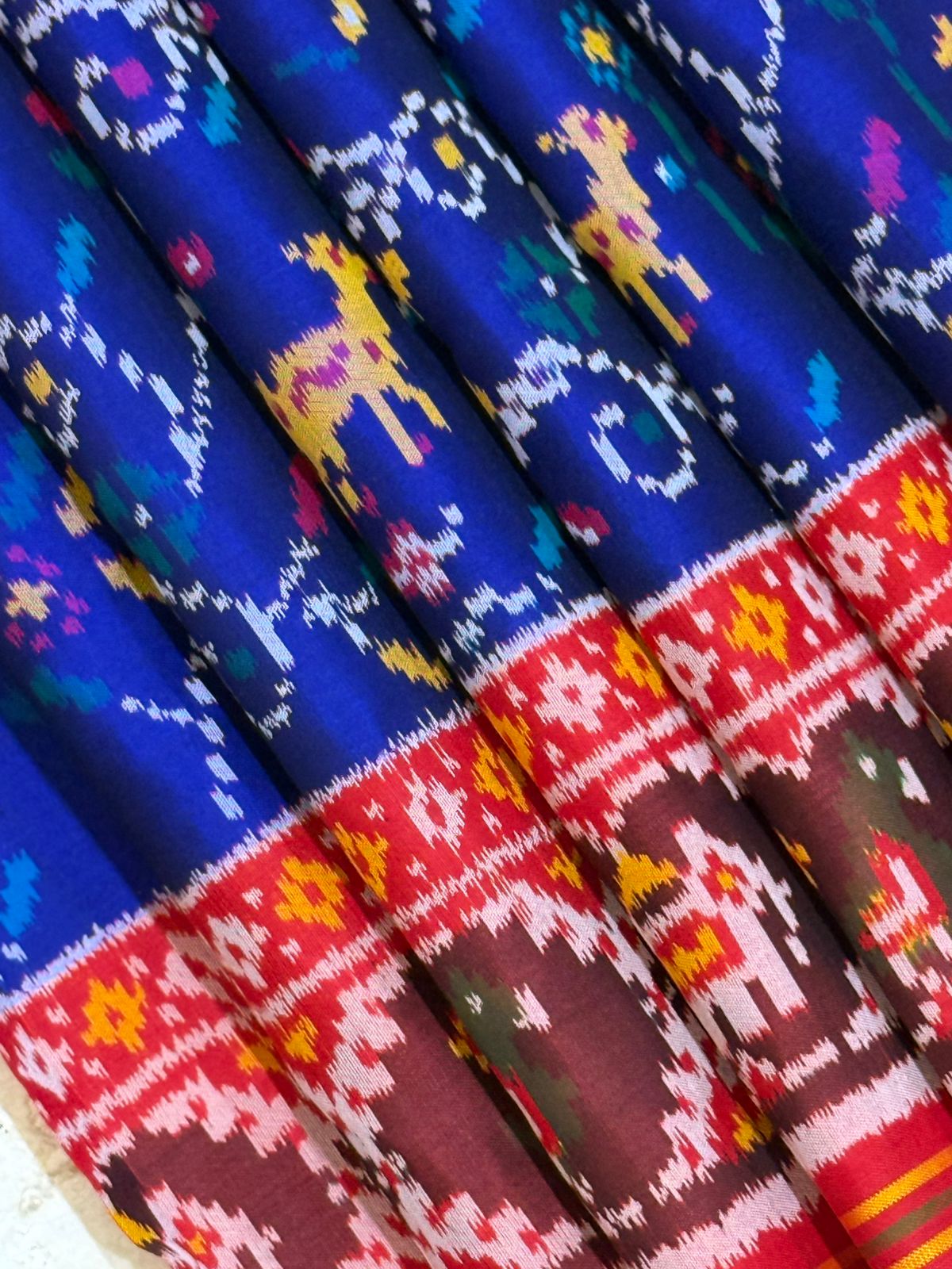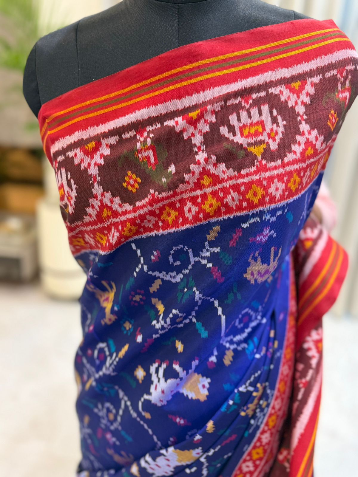 This majestic single Ikkat handwoven Patola saree in mulberry silk is a true visual delight. Its deep royal blue base is adorned with vibrant motifs of animals and florals, showcasing unmatched craftsmanship. The richly woven maroon-red pallu features intricate elephant and floral patterns, enhanced with golden zari accents. Bold, traditional, and regal, this saree radiates cultural richness and timeless grandeur—perfect for elevating any special occasion with its stunning presence.