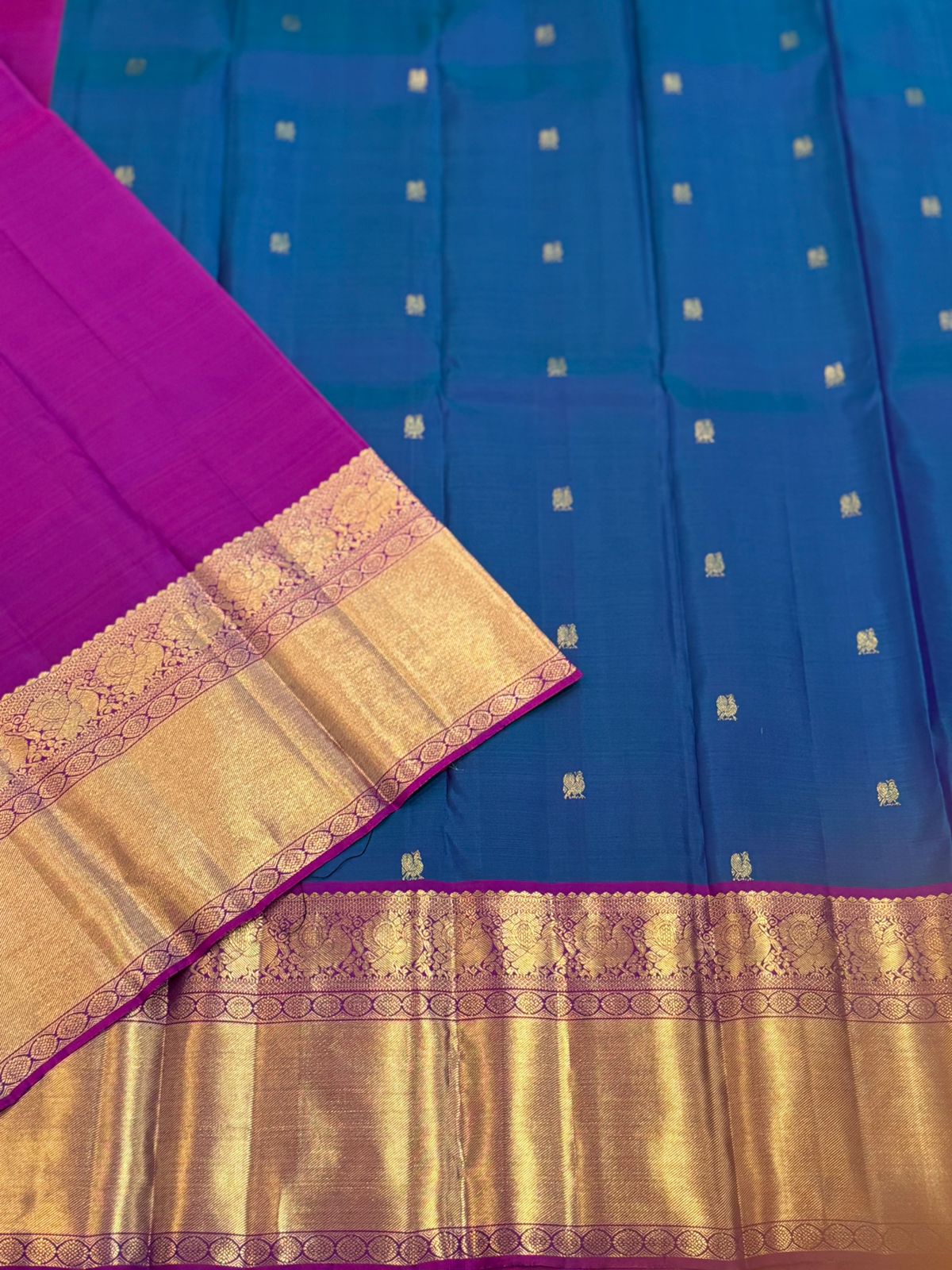 This enchanting handwoven Kanjivaram saree radiates splendor with its striking contrast of deep royal blue and vibrant magenta. The body glows with delicate golden motifs, while the grand pallu is adorned with rich zari work in intricate patterns, highlighted by peacock and floral designs. The shimmering golden border, edged in purple, elevates its regal charm. A true epitome of tradition and opulence, this saree is perfect for weddings and festive celebrations, exuding timeless grace.