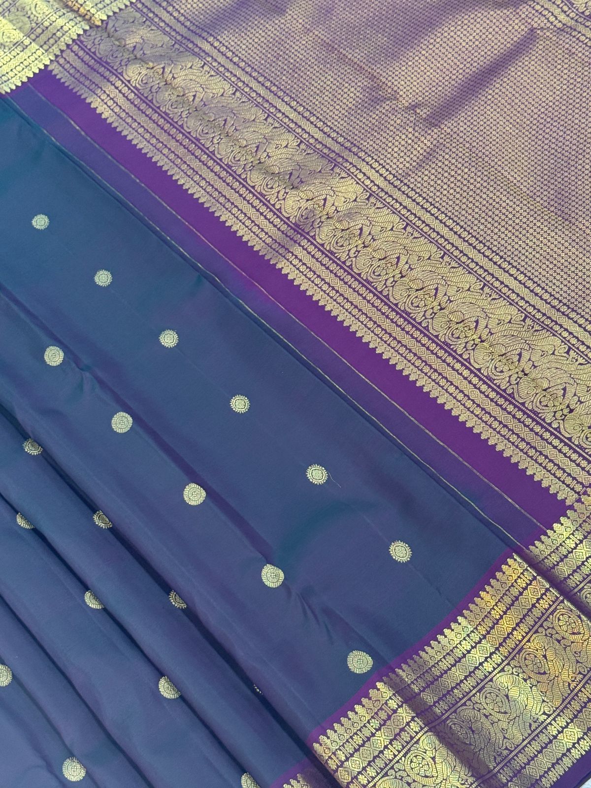 This handwoven Kanjivaram saree is a royal masterpiece in deep blue, elevated with delicate golden buttas scattered gracefully across the body. The rich purple border glows with intricate golden zari, featuring traditional motifs that exude heritage and grandeur. Its pallu dazzles with elaborate golden weaving, adding a regal finish. A perfect harmony of elegance and opulence, this saree is an ideal choice for weddings and celebrations, radiating timeless beauty and cultural richness.