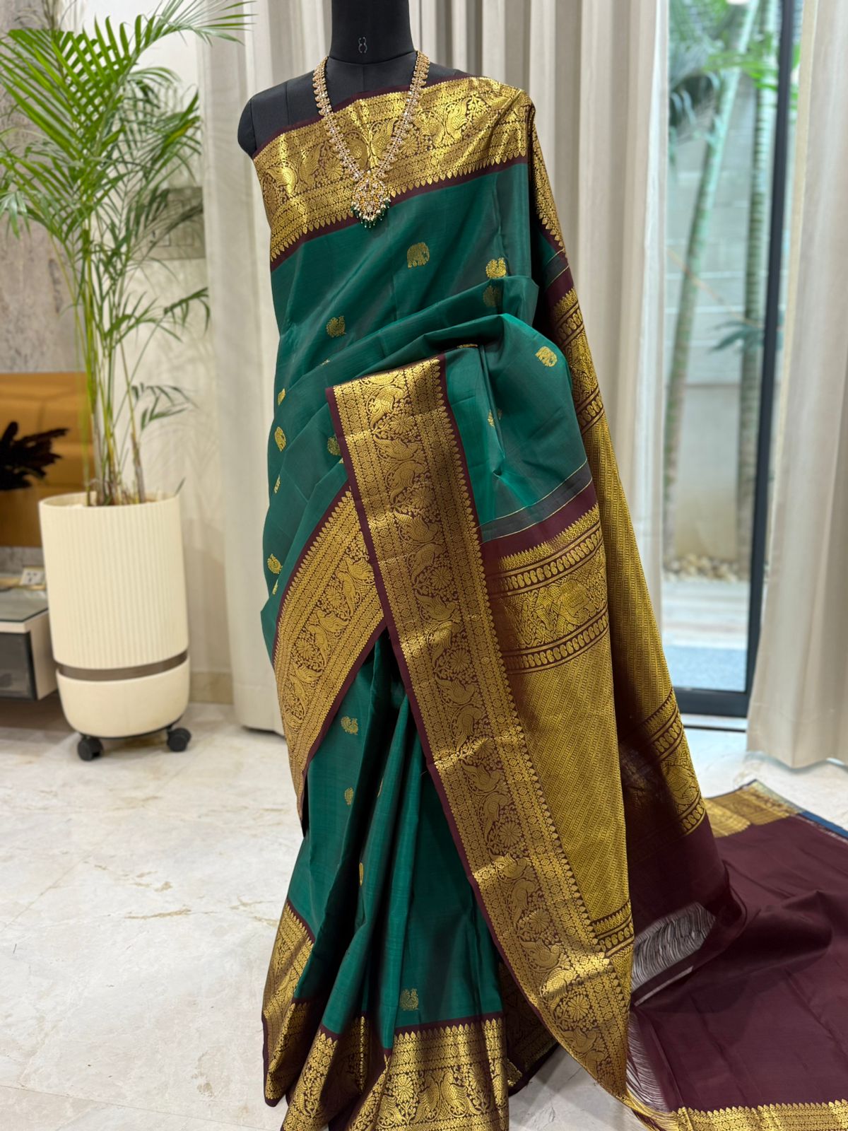 This magnificent handwoven Kanjivaram silk saree in a rich peacock green hue is a vision of regal elegance. Accentuated with a deep maroon border and grand gold zari work, it showcases intricate traditional motifs woven with remarkable finesse. The luxurious silk drapes fluidly, reflecting a soft, opulent sheen with every fold. A striking balance of bold color and classic craftsmanship, this saree embodies timeless South Indian heritage—perfect for weddings, festive celebrations, and moments meant to be unforgettable.