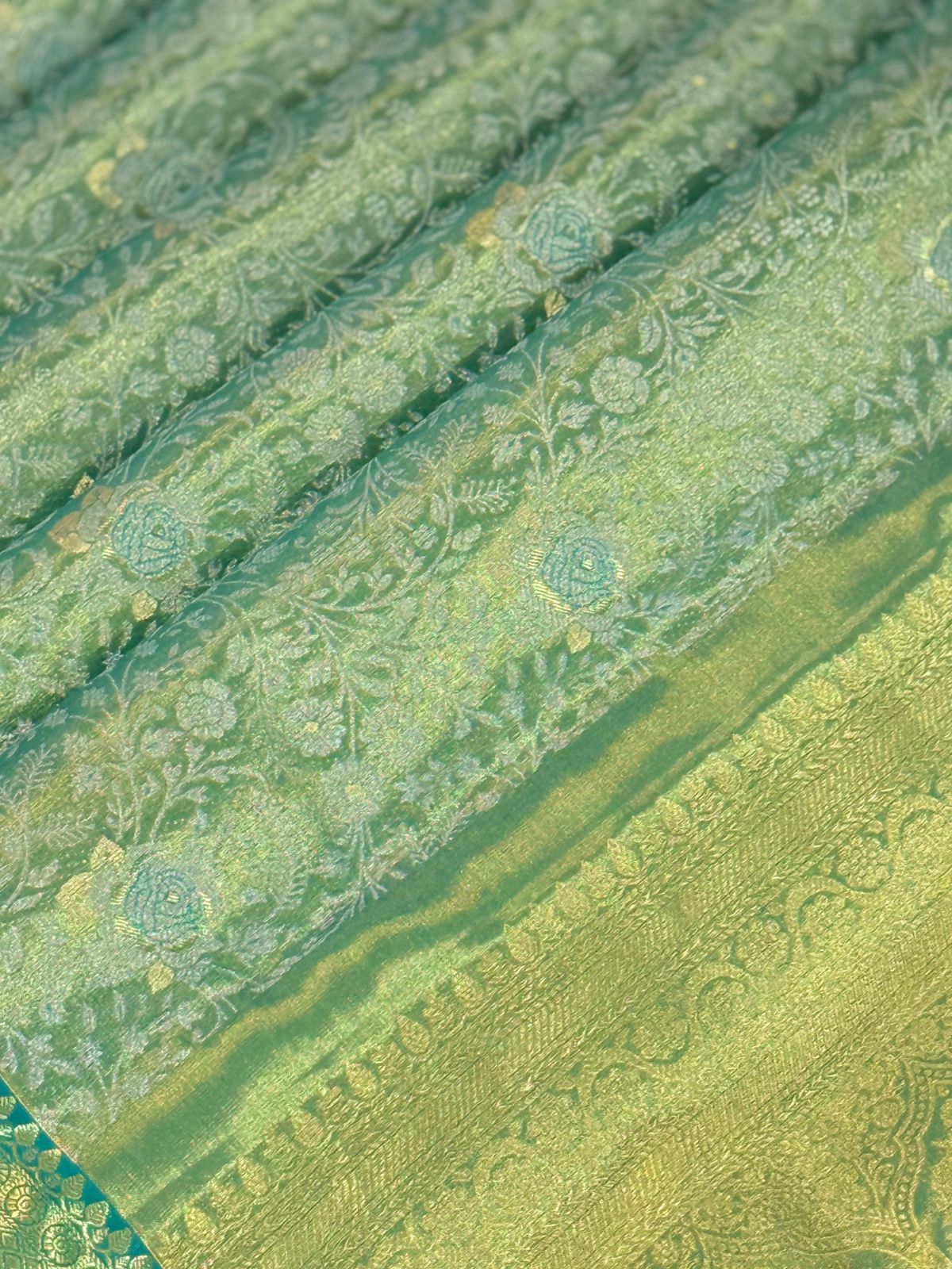 This mesmerizing handwoven Kanjivaram saree in a refreshing sea-green tone is a celebration of tradition and elegance. The zari warp shimmers with golden brilliance, beautifully accentuating the delicate floral vines and intricate diamond motifs. Its luxurious golden pallu is adorned with regal patterns, while the contrasting turquoise border frames the drape with grace. A perfect ensemble for grand festivities, this saree weaves timeless artistry with a modern, vibrant charm.
