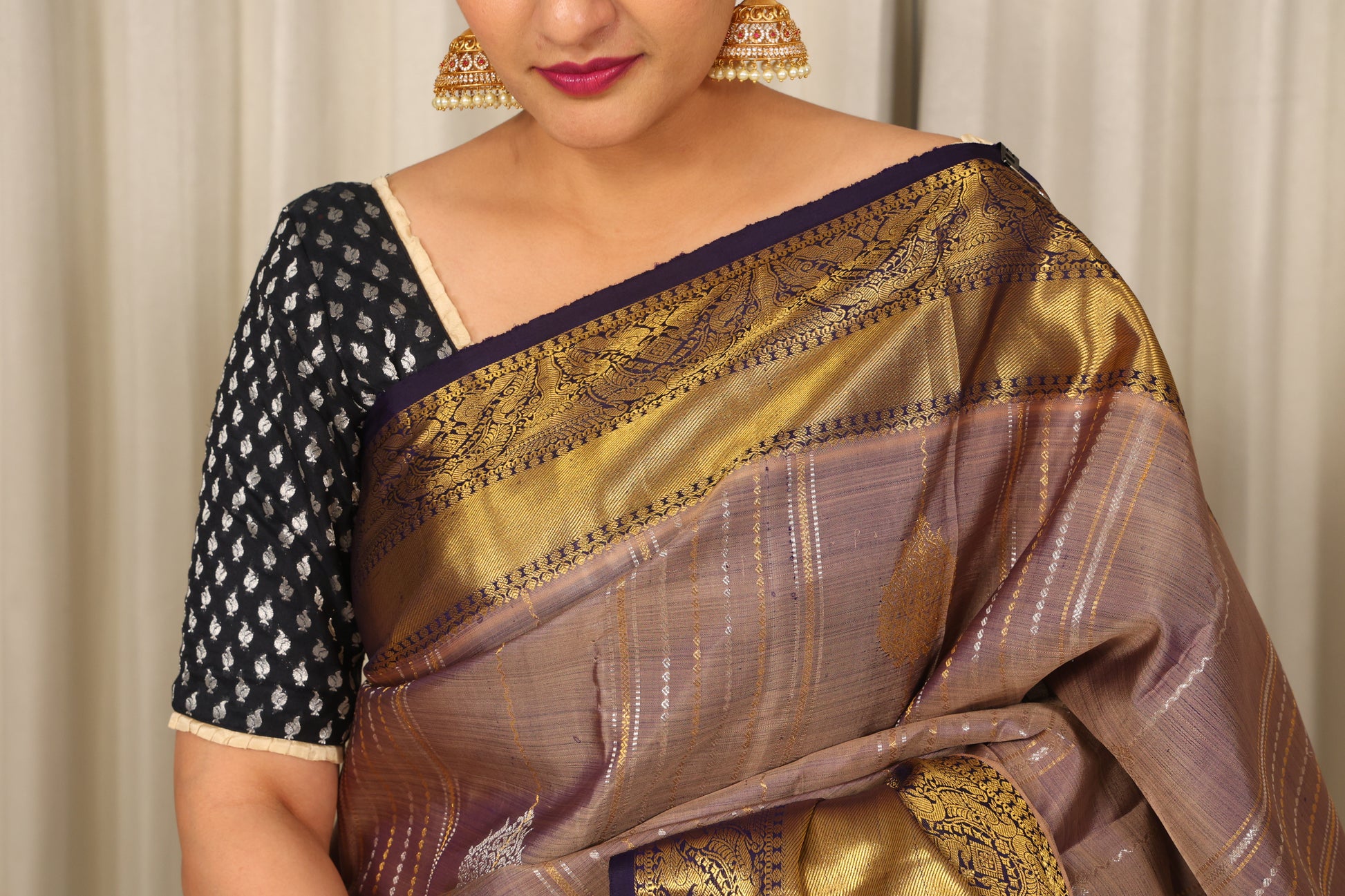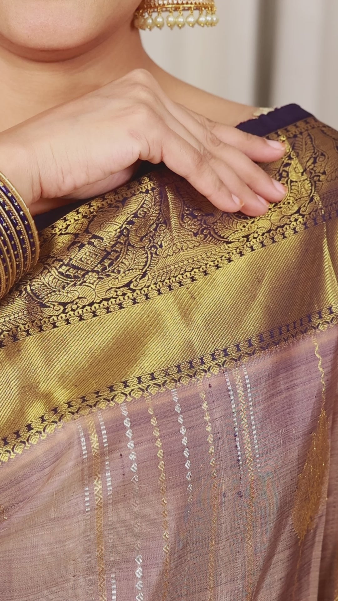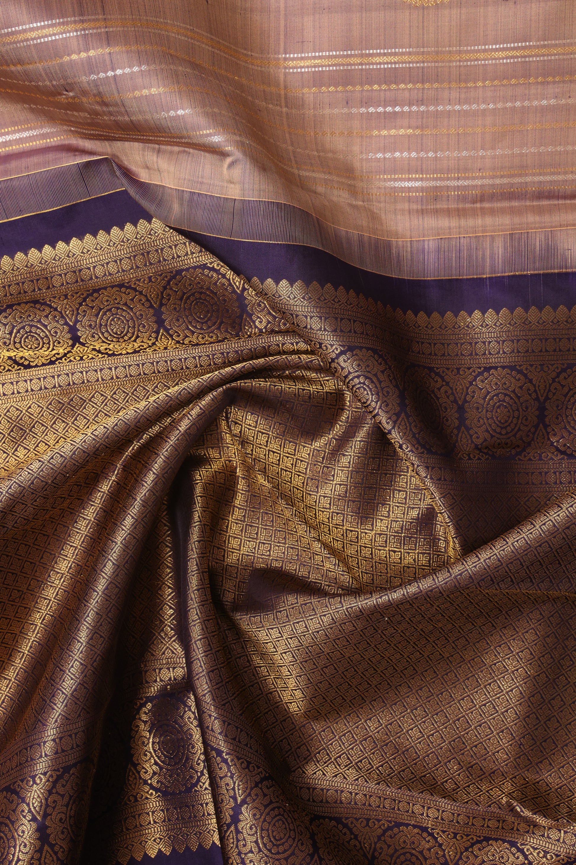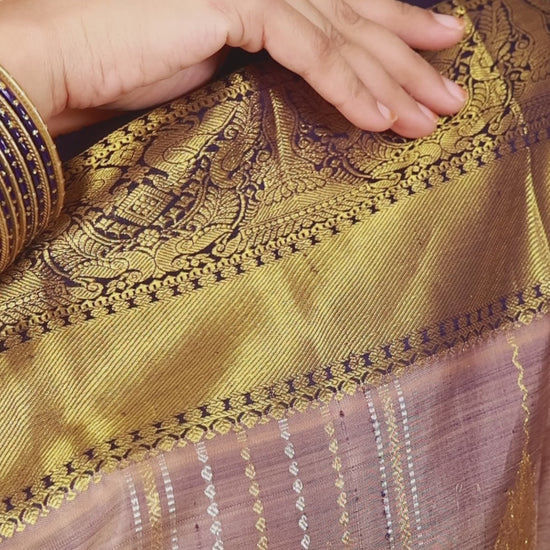 This Kanjivaram handloom silk saree features a light greyish purple body with subtle golden stripes, contrasted by a navy-blue border and pallu adorned with intricate gold zari work. The saree showcases traditional floral and geometric motifs, enhancing its regal appeal. Ideal for weddings and festive occasions, this saree is a luxurious statement piece with timeless craftsmanship.