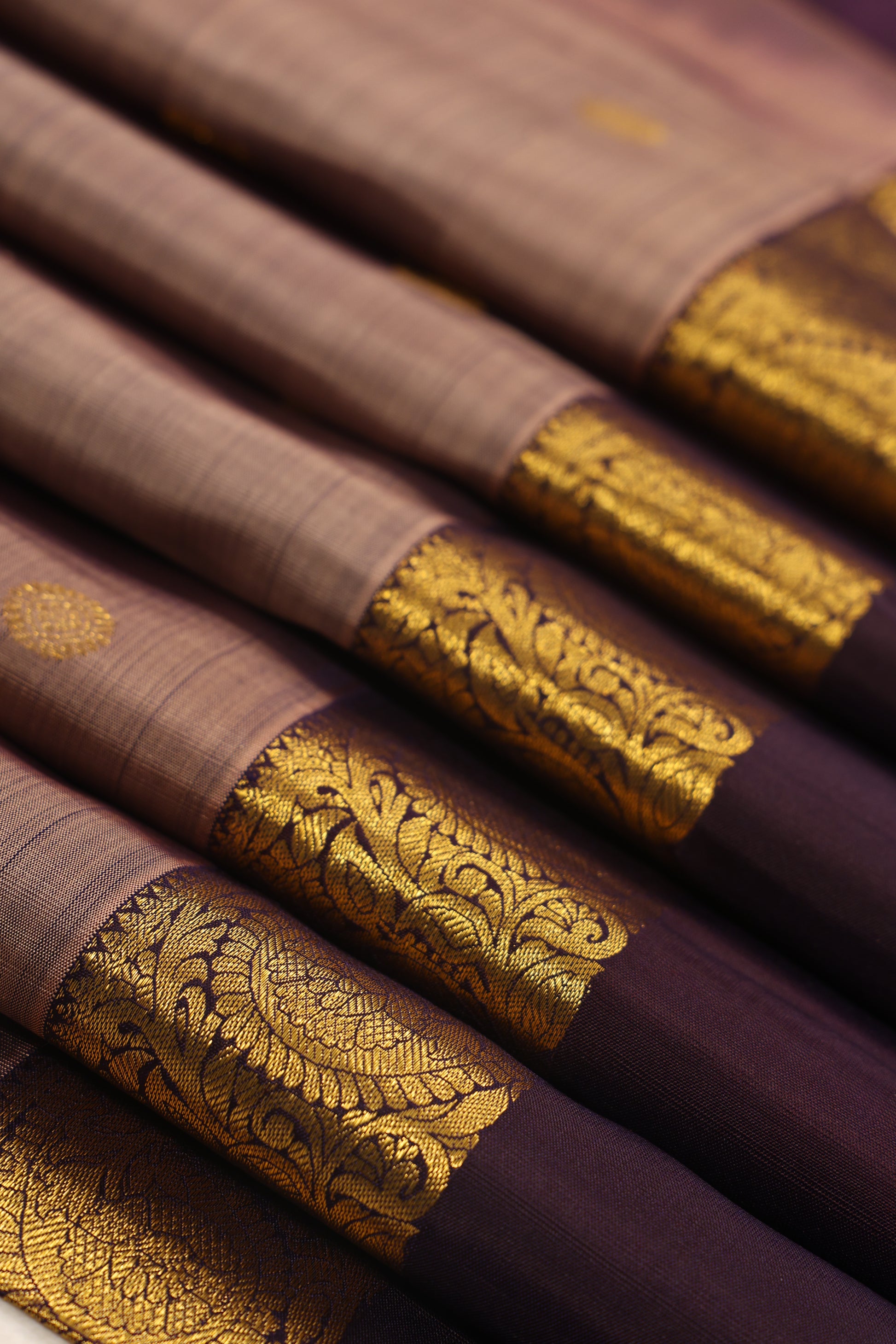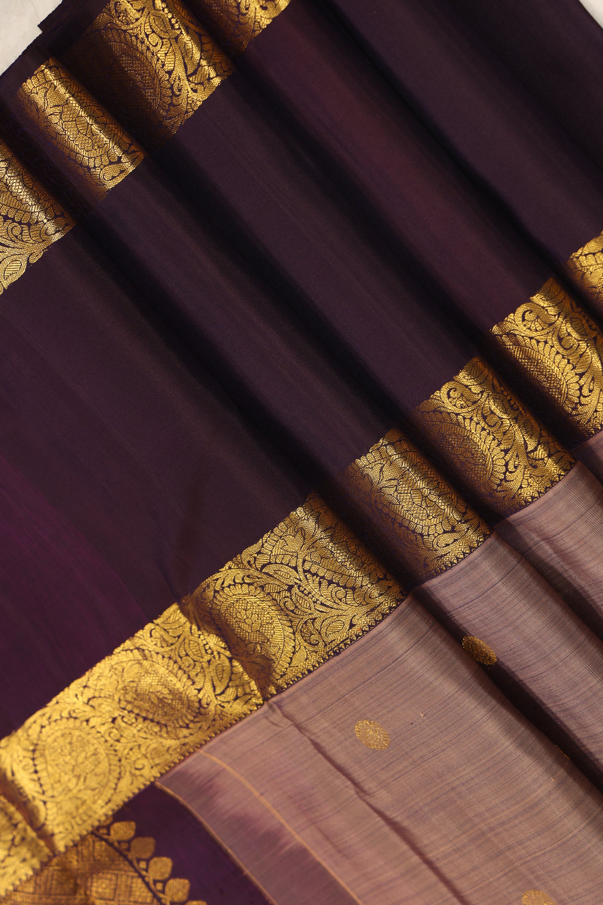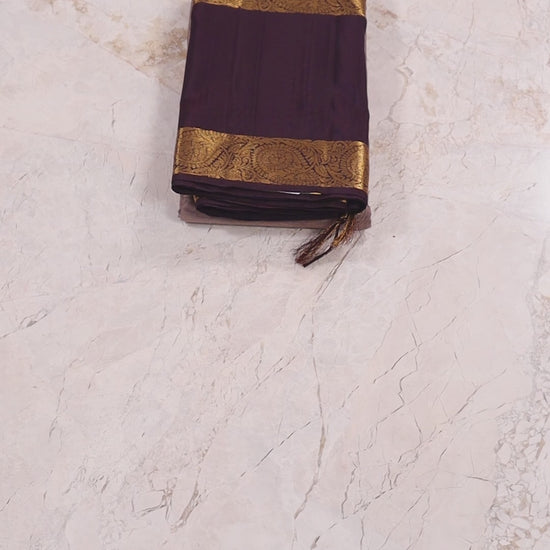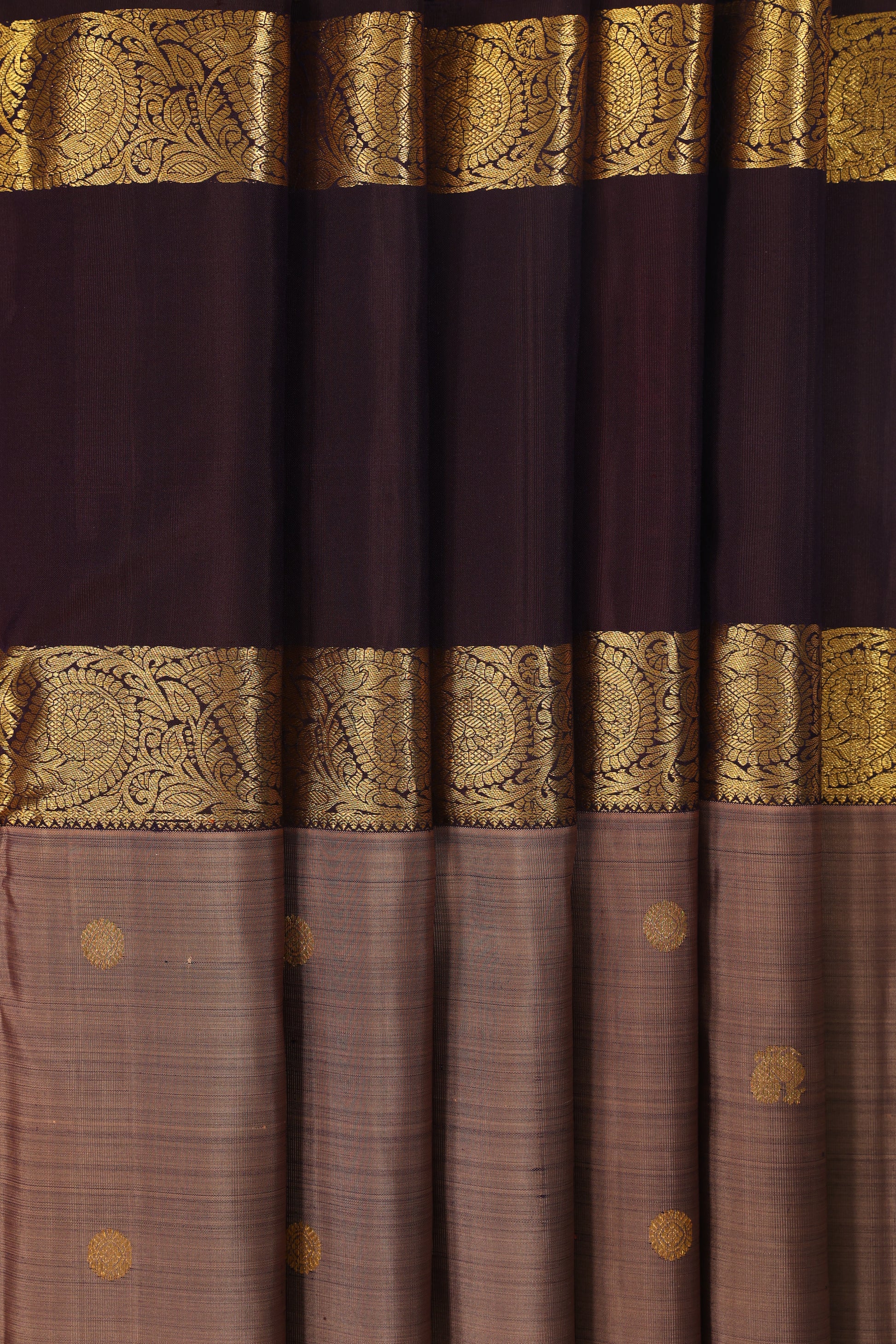 The Silk Kanjivaram Saree is a luxurious, high-quality piece featuring coffee border with soft greyish beige (snuff colour). It is crafted from fine silk with a smooth, lustrous finish. The broad borders and pallu are intricately woven with golden zari work displaying floral, paisley, and geometric motifs. The body is plain with subtle sheen and scattered golden circular floral buttas for added elegance. This saree offers a royal appearance, perfect for weddings and special occasions, showcasing the grandeur and craftsmanship of traditional Kanjivaram weaving.