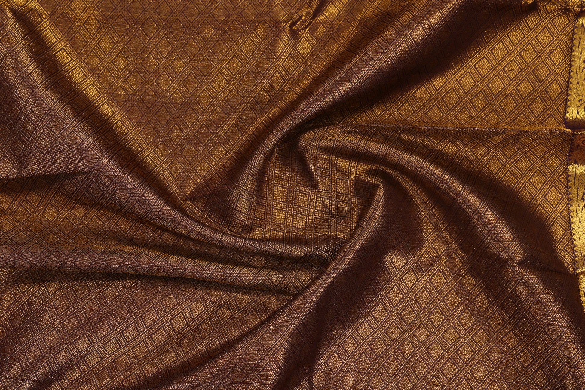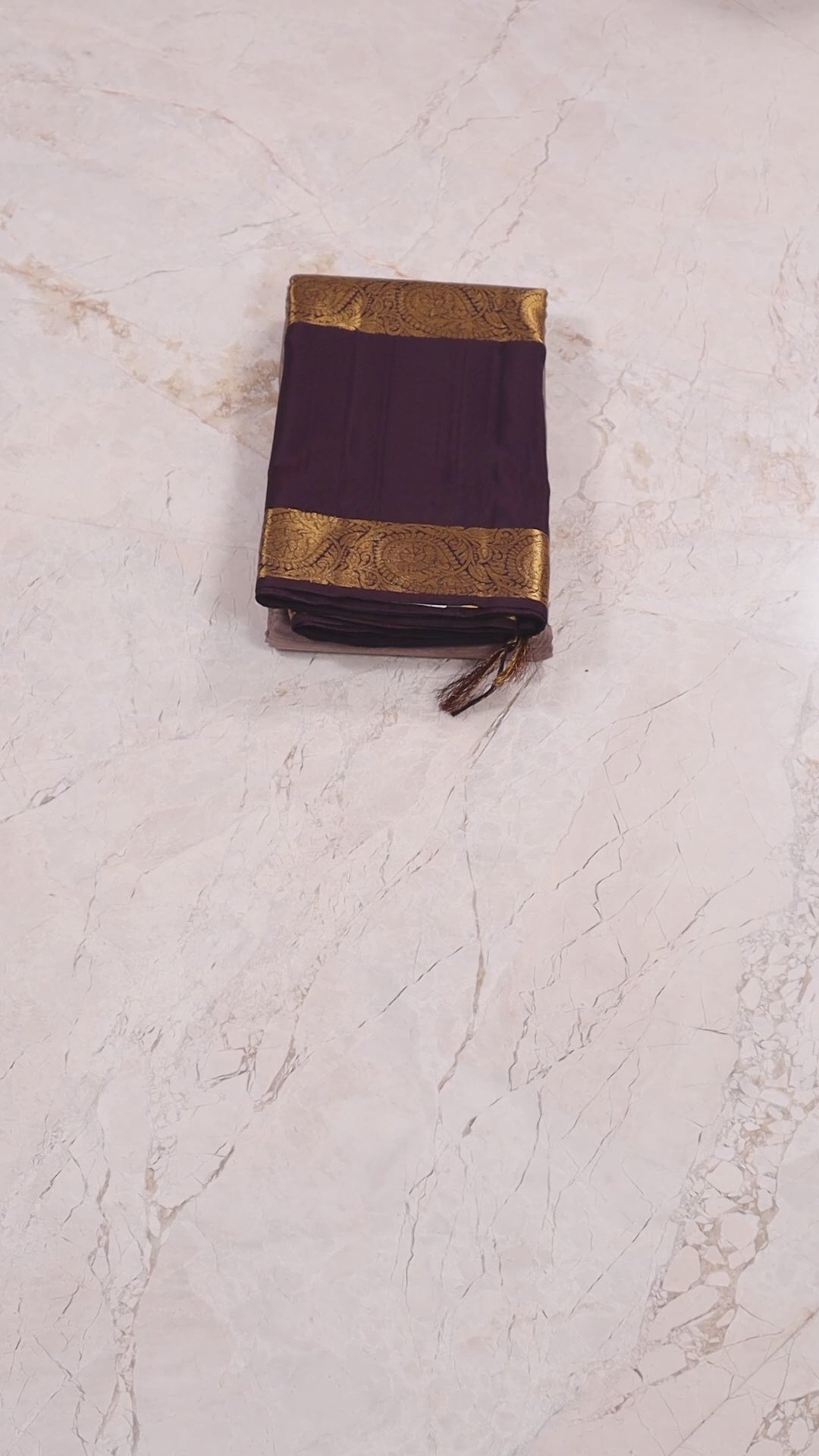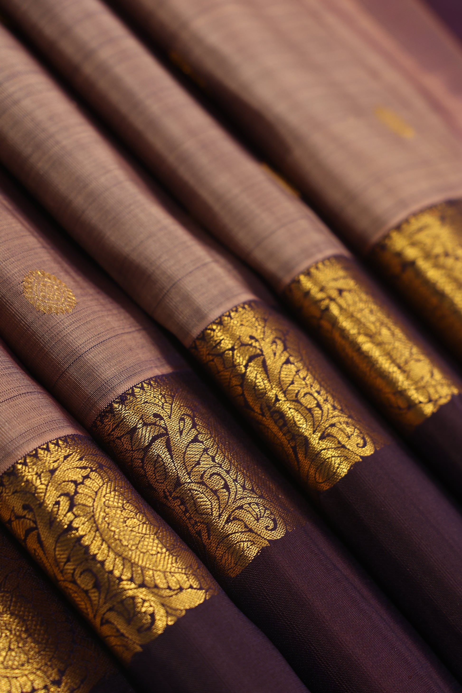 The Silk Kanjivaram Saree is a luxurious, high-quality piece featuring coffee border with soft greyish beige (snuff colour). It is crafted from fine silk with a smooth, lustrous finish. The broad borders and pallu are intricately woven with golden zari work displaying floral, paisley, and geometric motifs. The body is plain with subtle sheen and scattered golden circular floral buttas for added elegance. This saree offers a royal appearance, perfect for weddings and special occasions, showcasing the grandeur and craftsmanship of traditional Kanjivaram weaving.