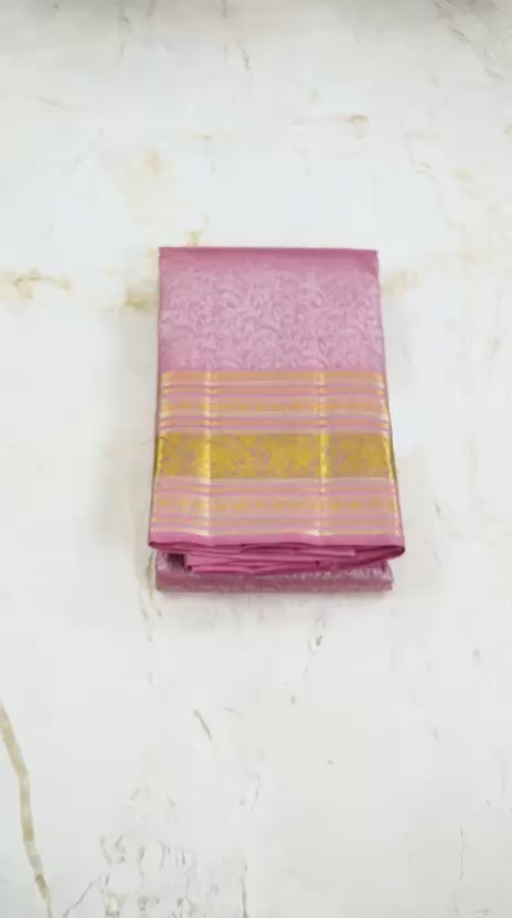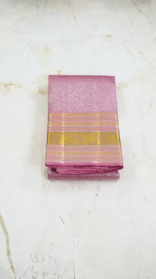 This Kanjivaram saree is a graceful blend of soft lavender and blush pink, enriched with intricate silver zari motifs across the body. The delicate floral vines weave an aura of subtle luxury, while the golden zari borders and pallu add a touch of timeless opulence. Its ethereal sheen and lightweight drape make it an exquisite choice for elegant occasions, radiating sophistication and traditional charm in every fold